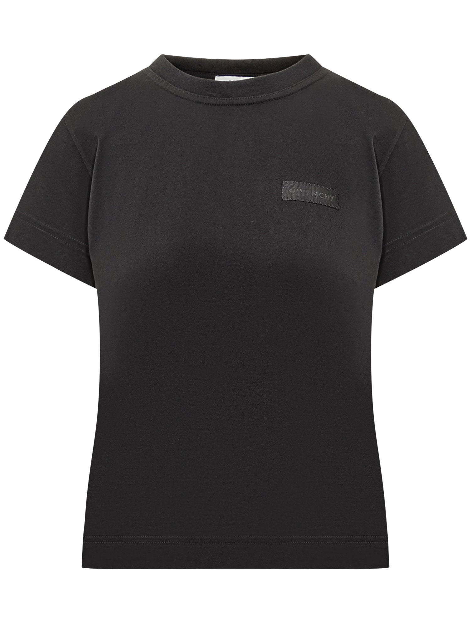 T-shirt nera Givenchy in cotone con patch logo tono su tono sul petto.