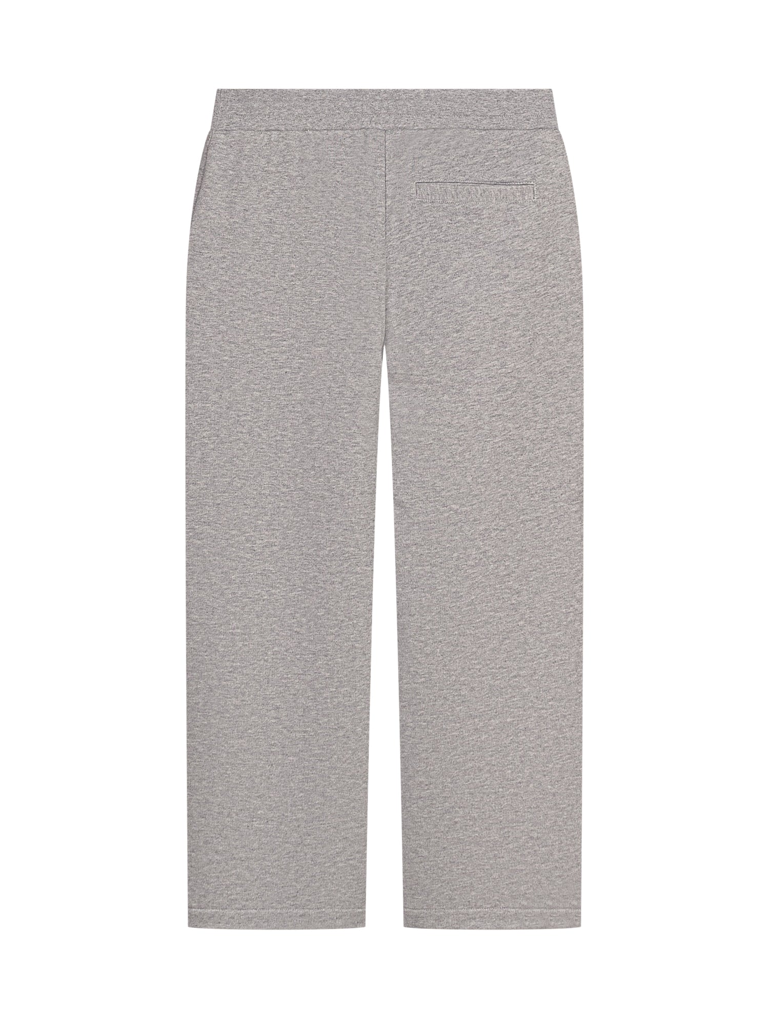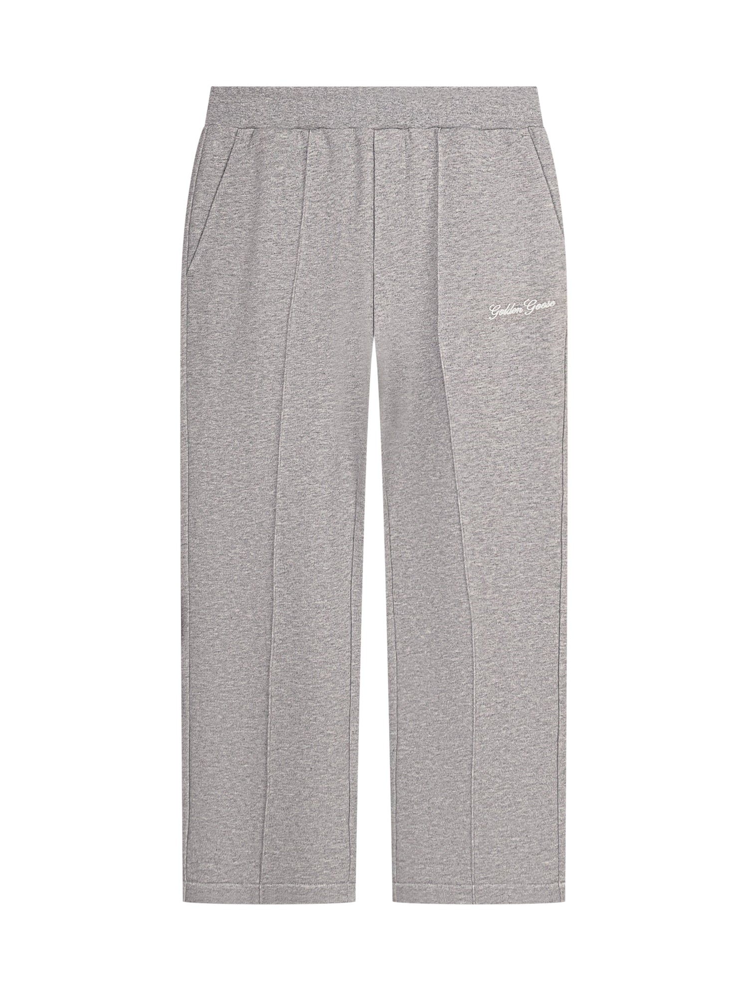 Pantaloni Golden Goose grigi in morbido jersey con logo ricamato bianco. Linea dritta con piega frontale e tasche laterali.