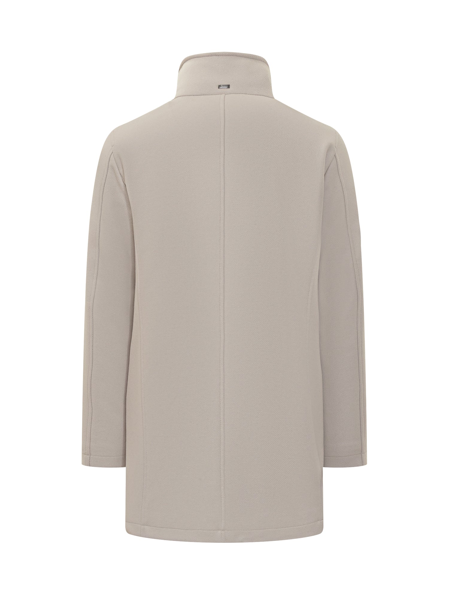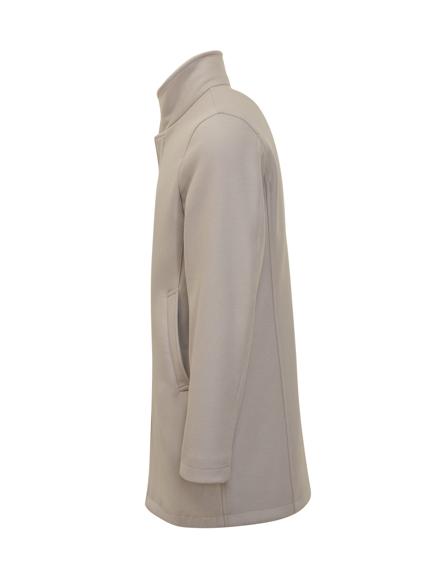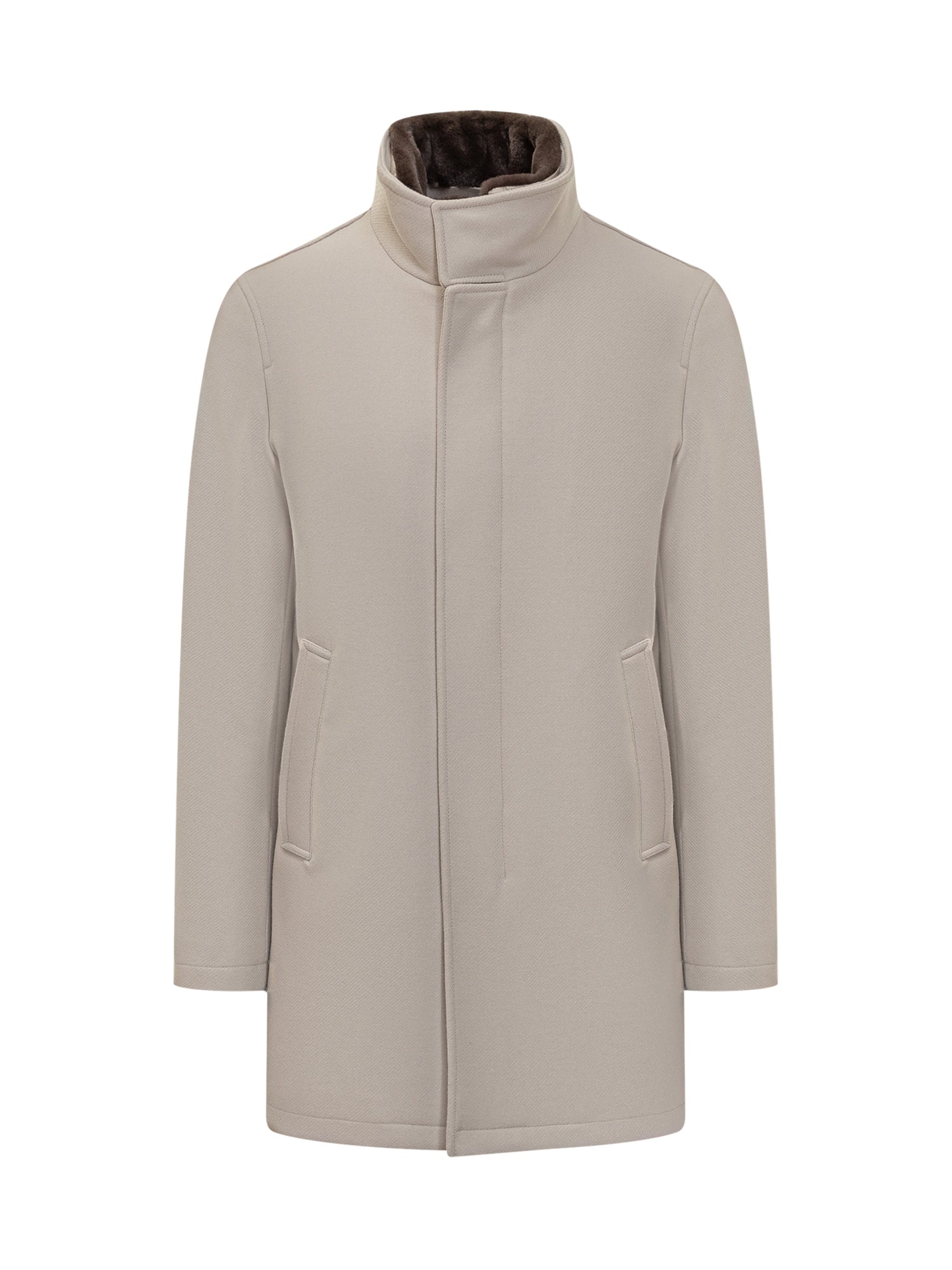Cappotto beige con collo alto e interno in eco-pelliccia.