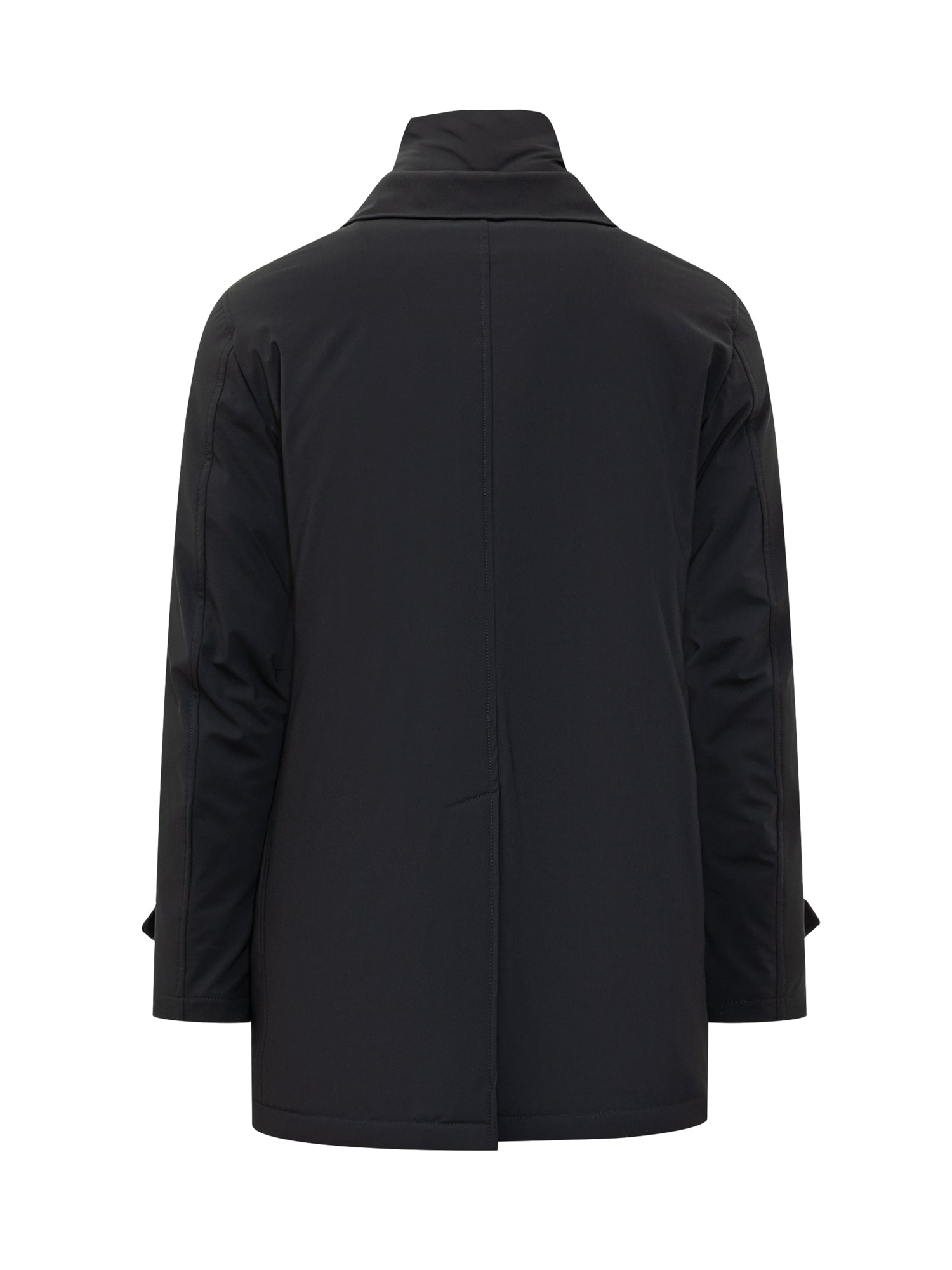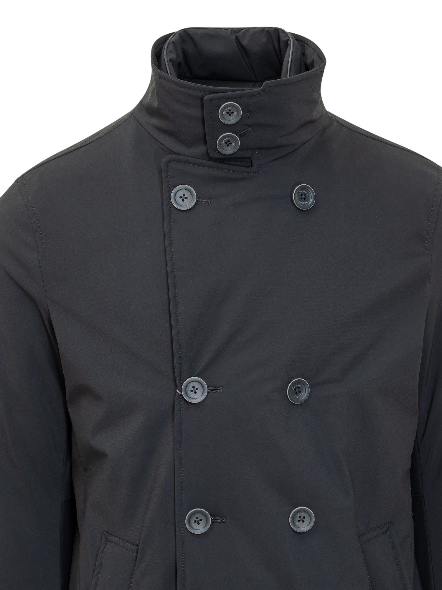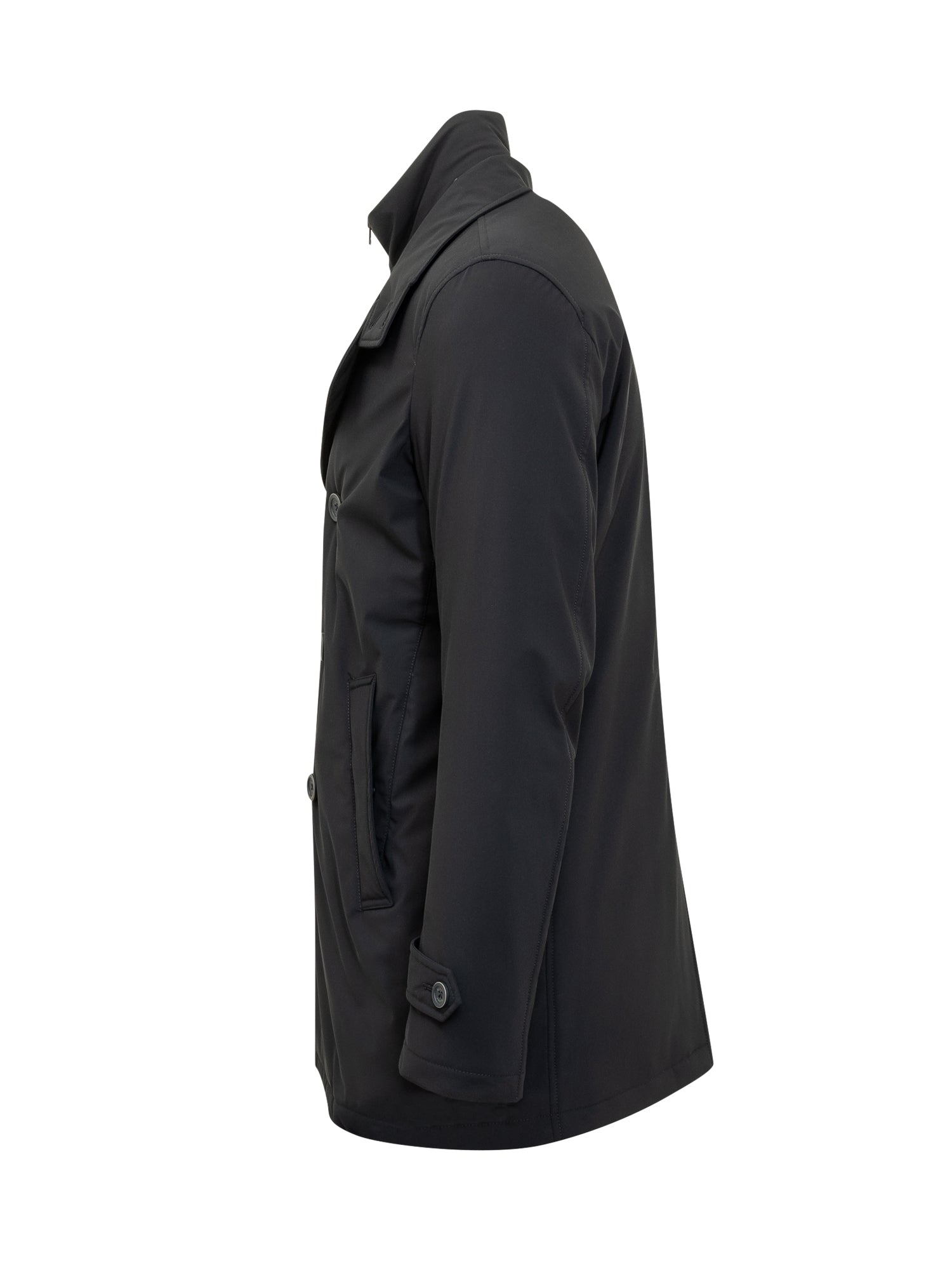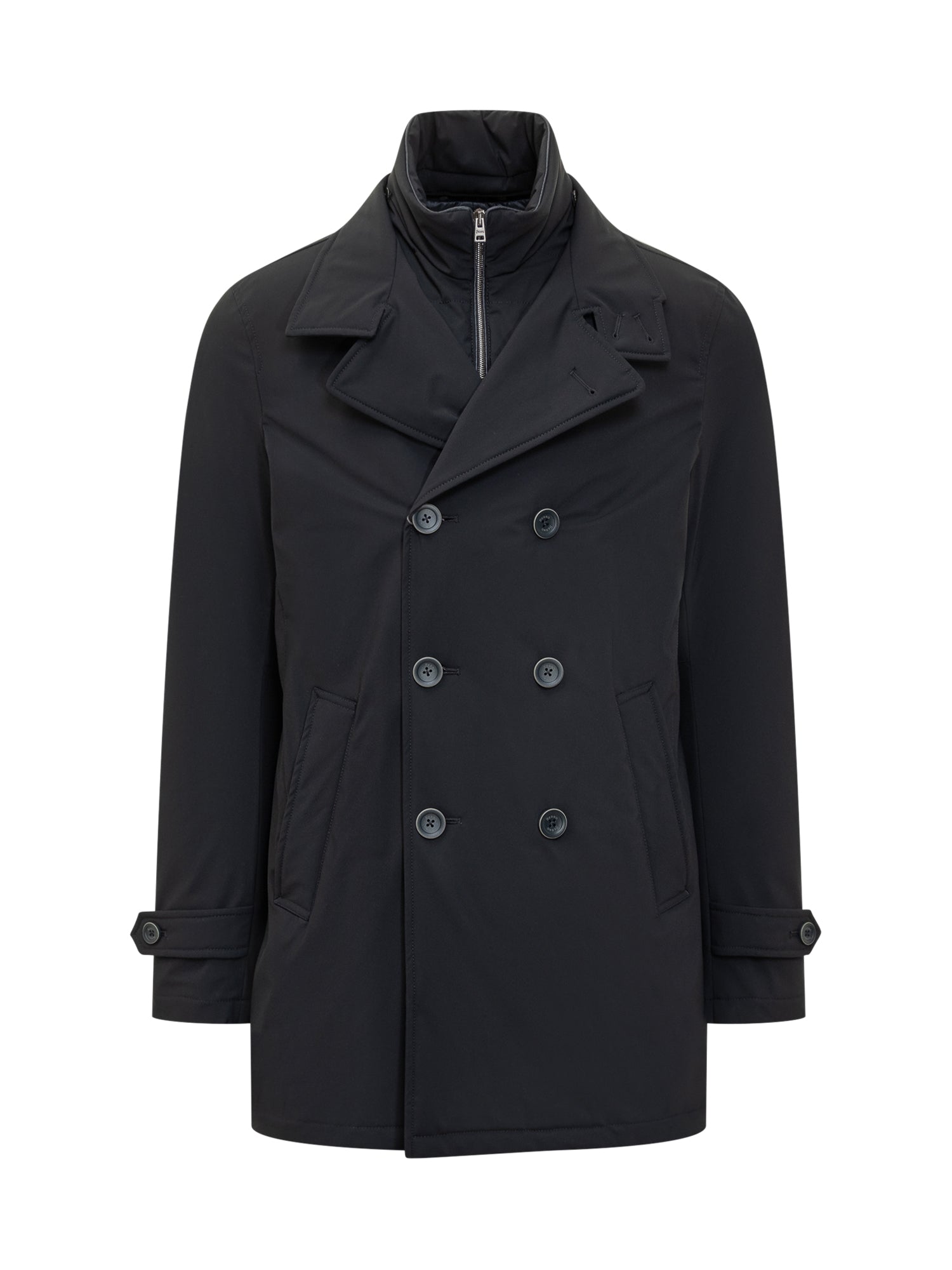 Peacoat Washington nero dal taglio doppiopetto, con pettorina interna removibile e chiusura a zip.