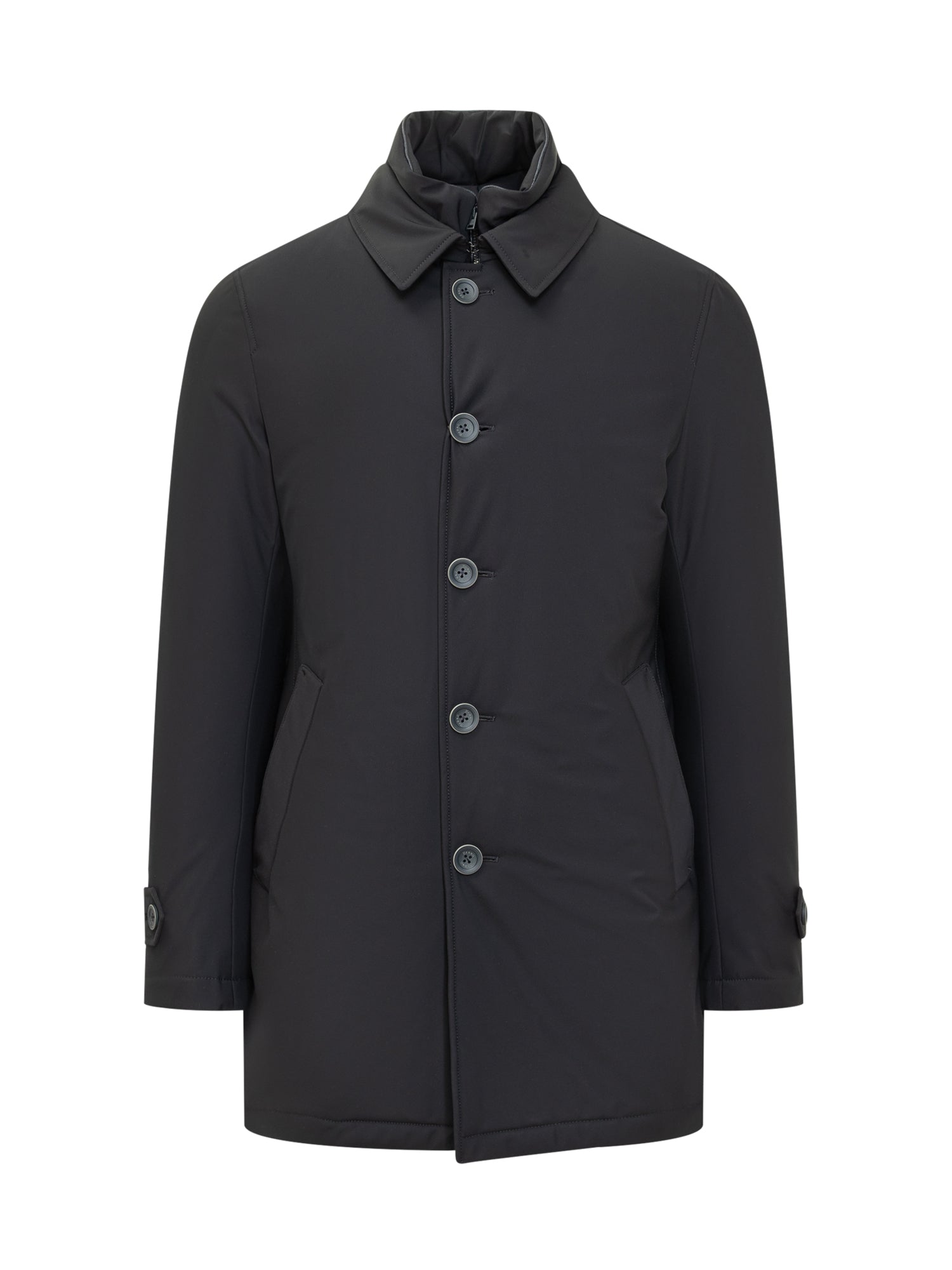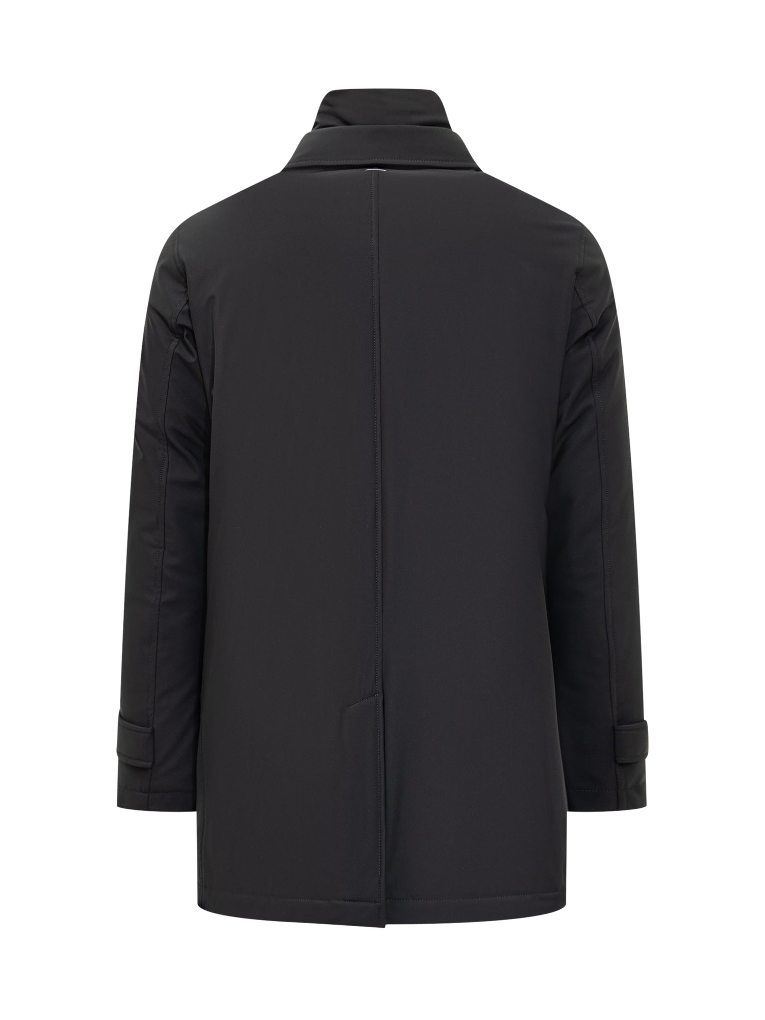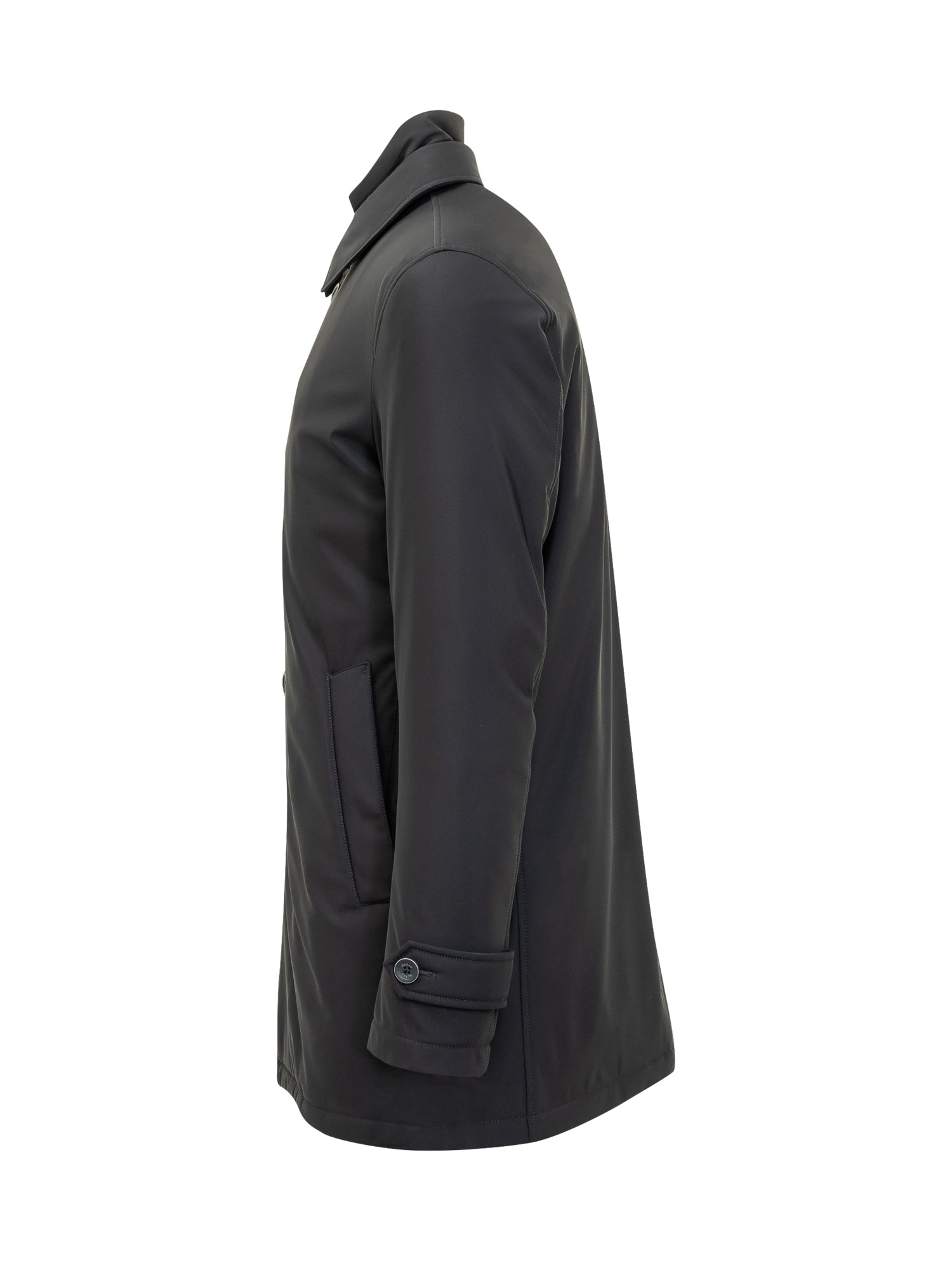 Cappotto Washington impermeabile nero, con chiusura a bottoni e pettorina interna removibile.