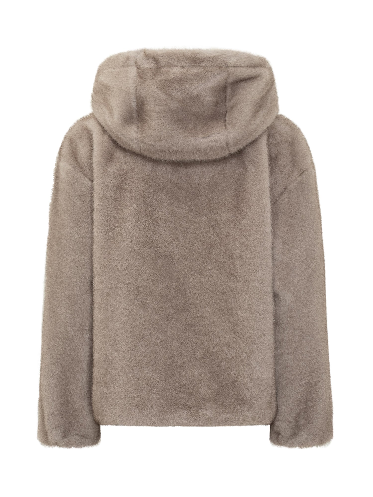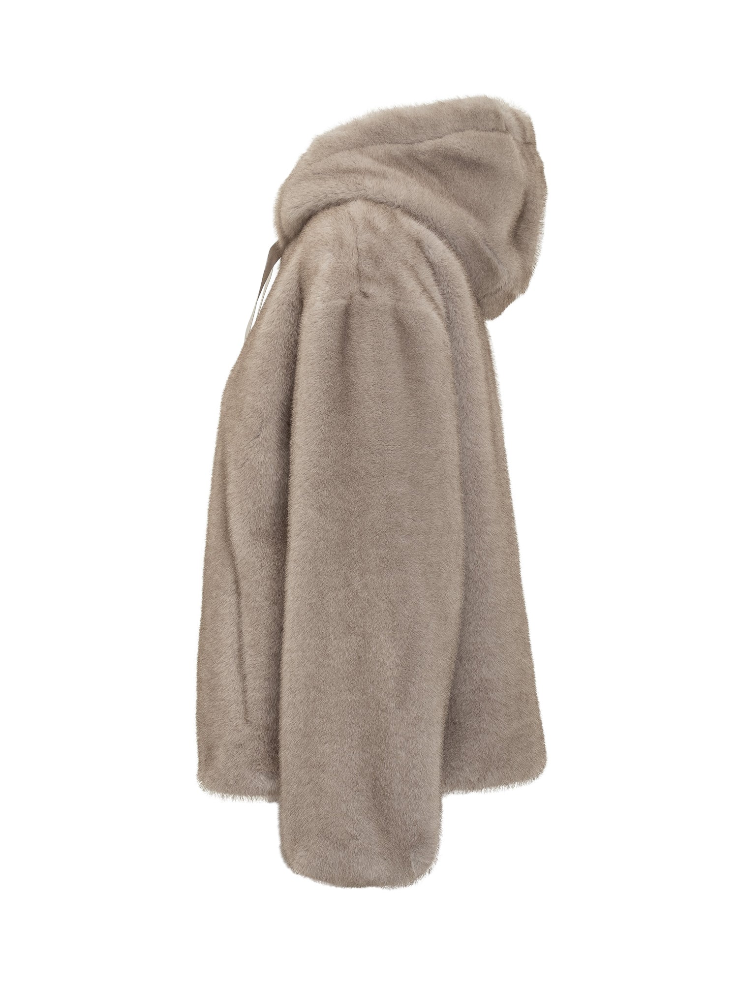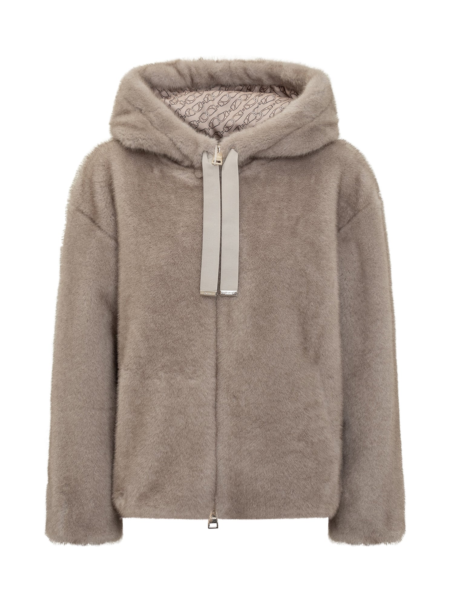 Giubbotto con cappuccio in eco-pelliccia beige firmato Herno. Zip doppio cursore, dettagli in gros-grain e fodera logata.