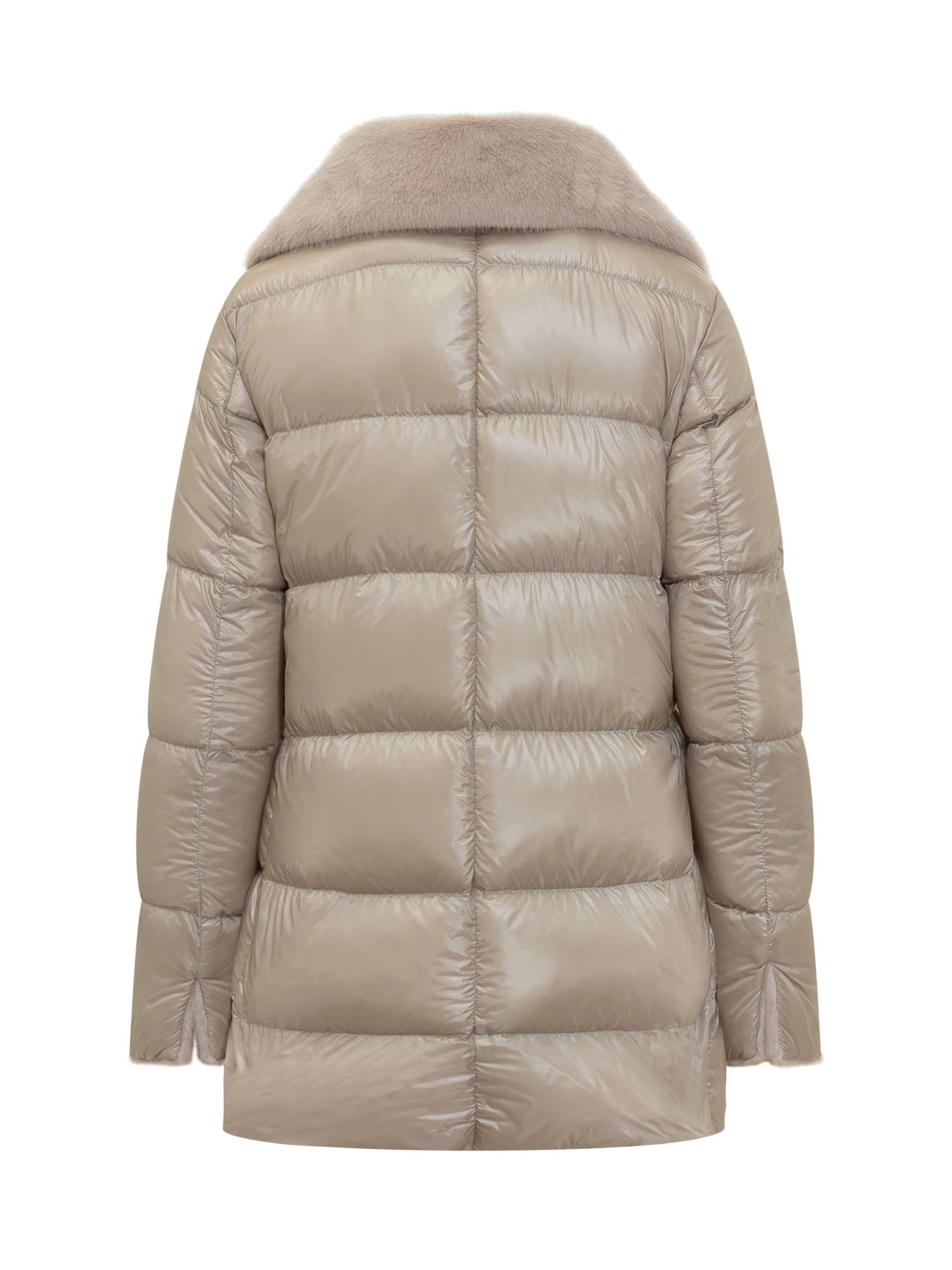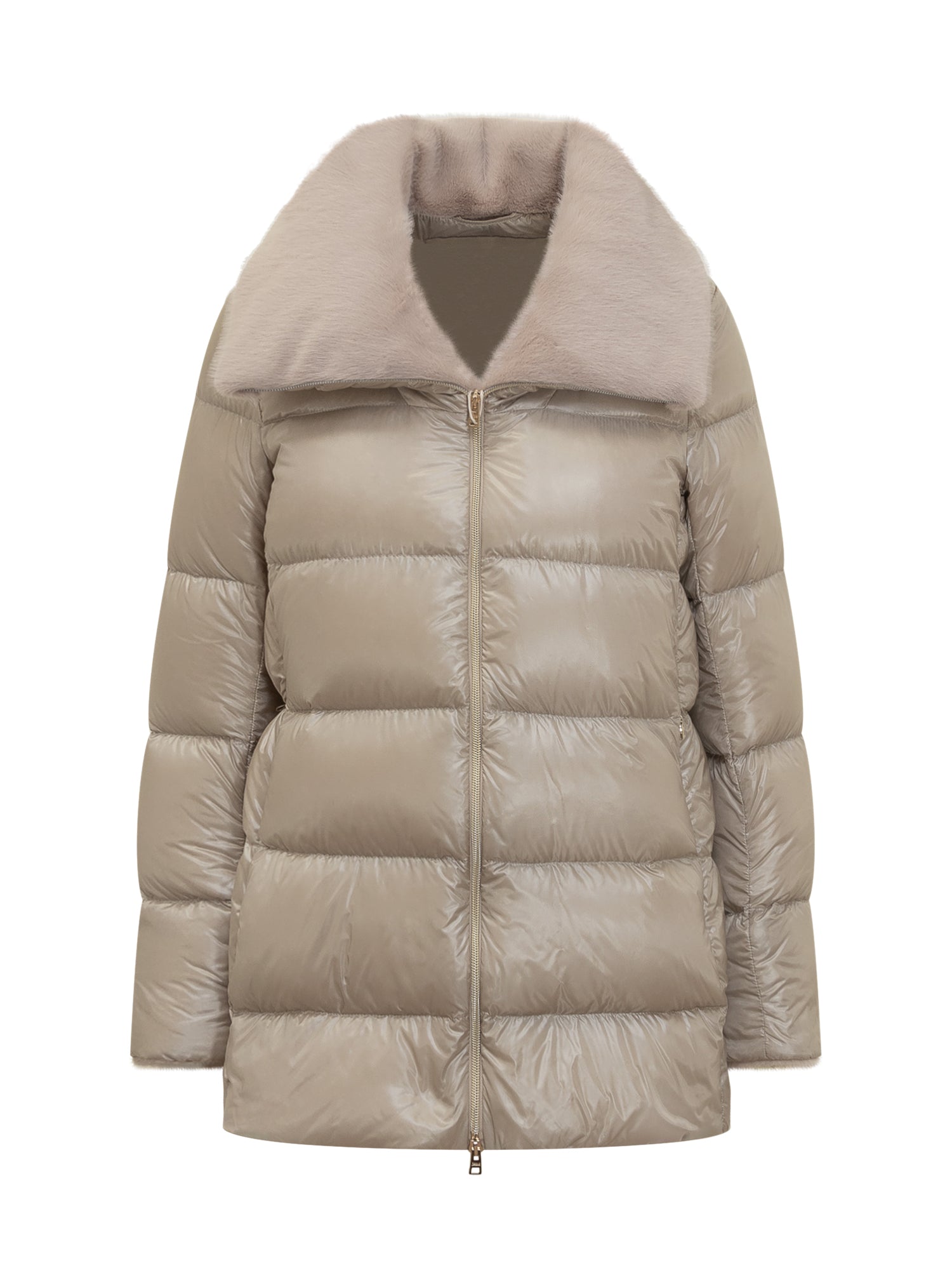 Piumino Herno beige con maxi collo in pelliccia tono su tono. Realizzato in tessuto lucido trapuntato, presenta chiusura a zip e linea femminile.