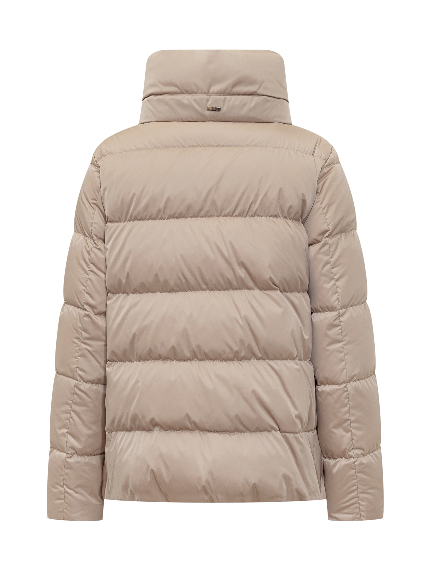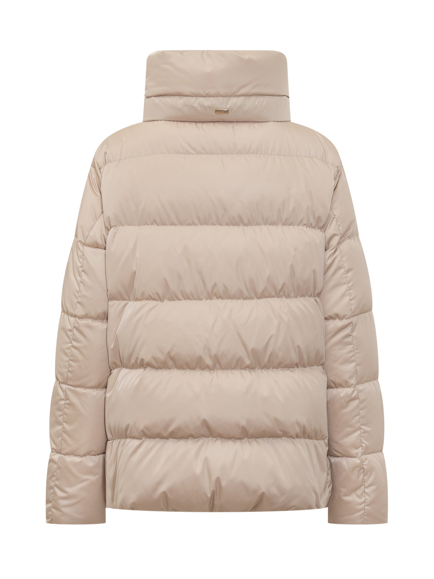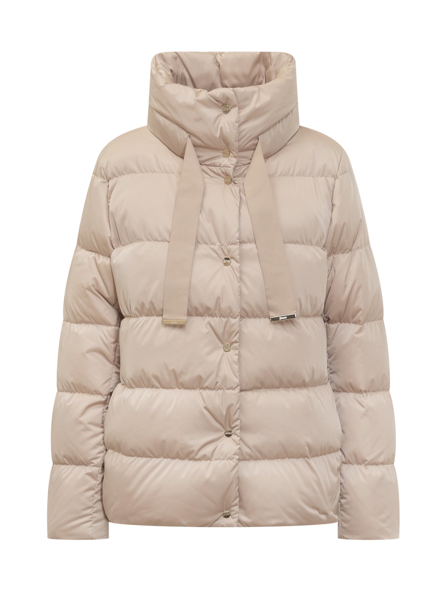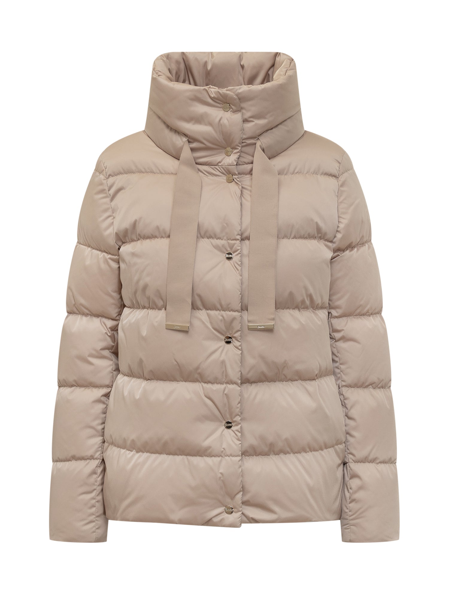 Piumino corto Herno in tessuto tecnico effetto satin con trapuntatura orizzontale. Collo alto con nastri decorativi e chiusura con bottoni automatici.