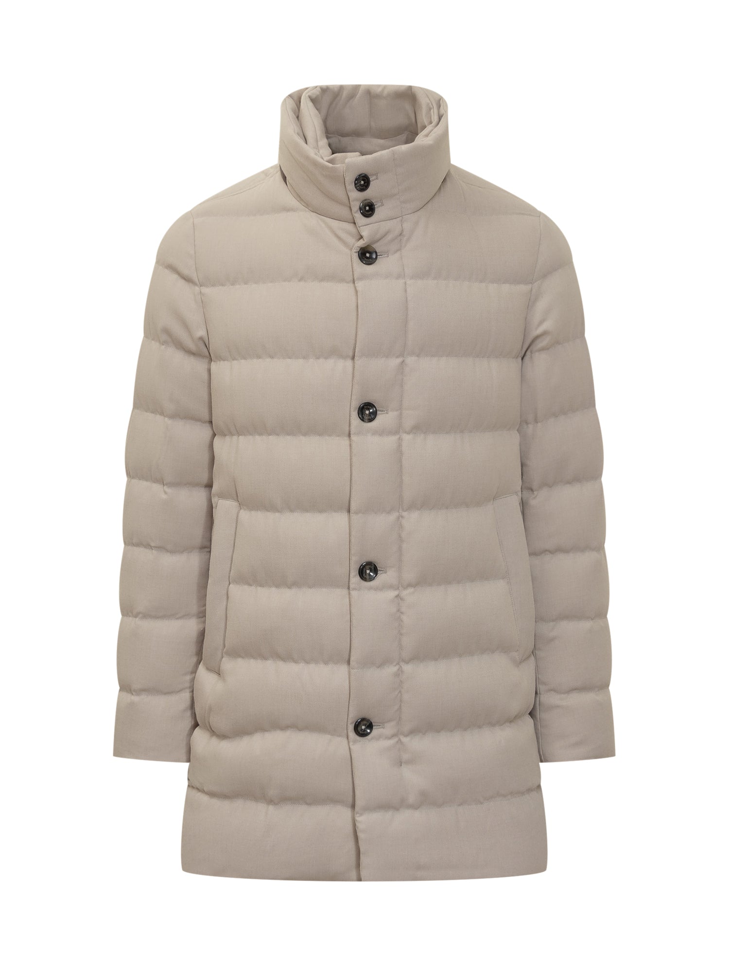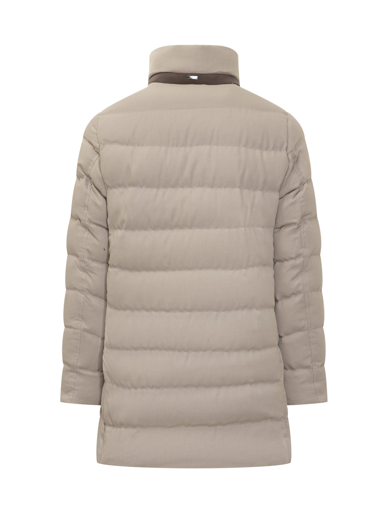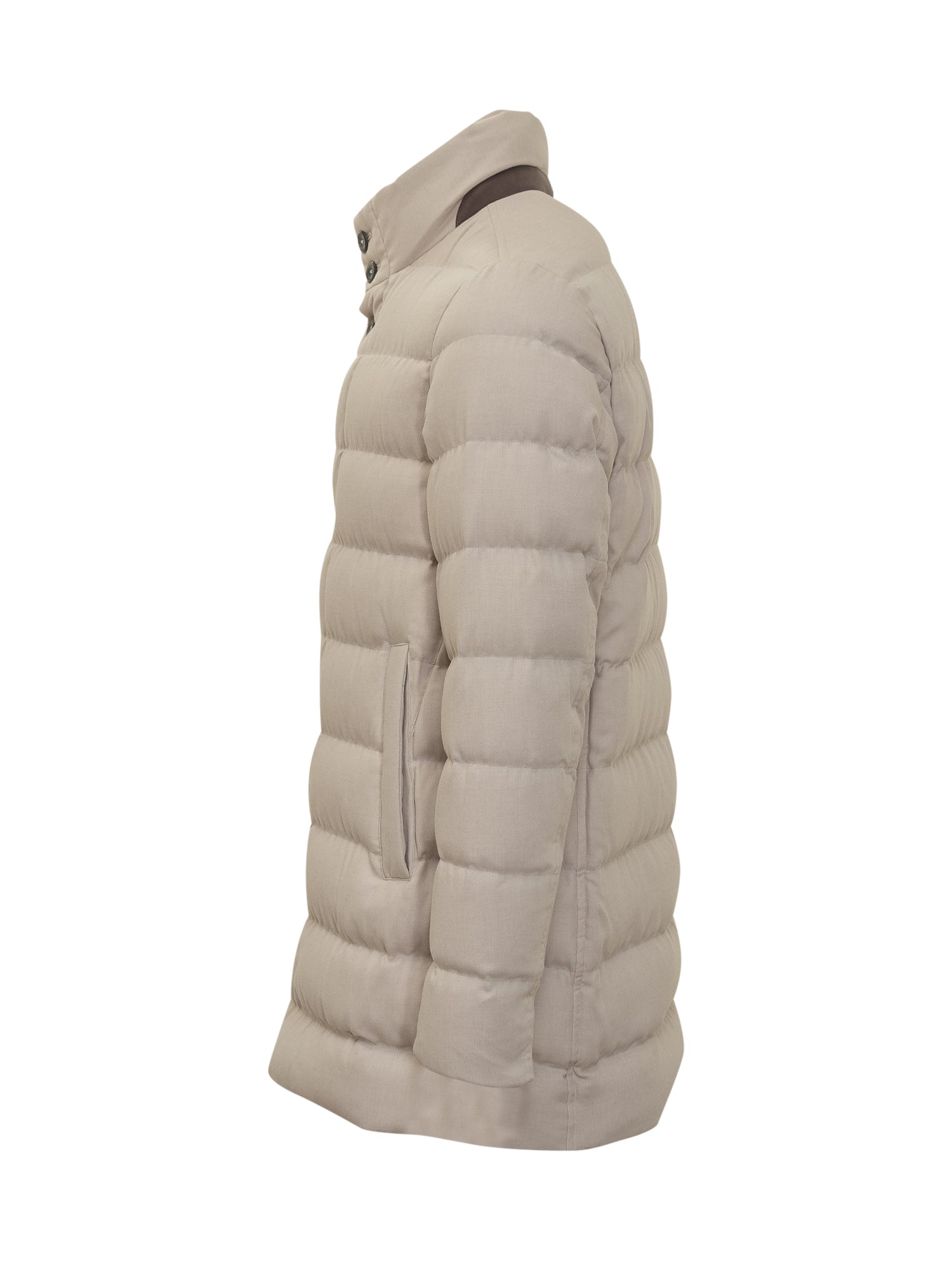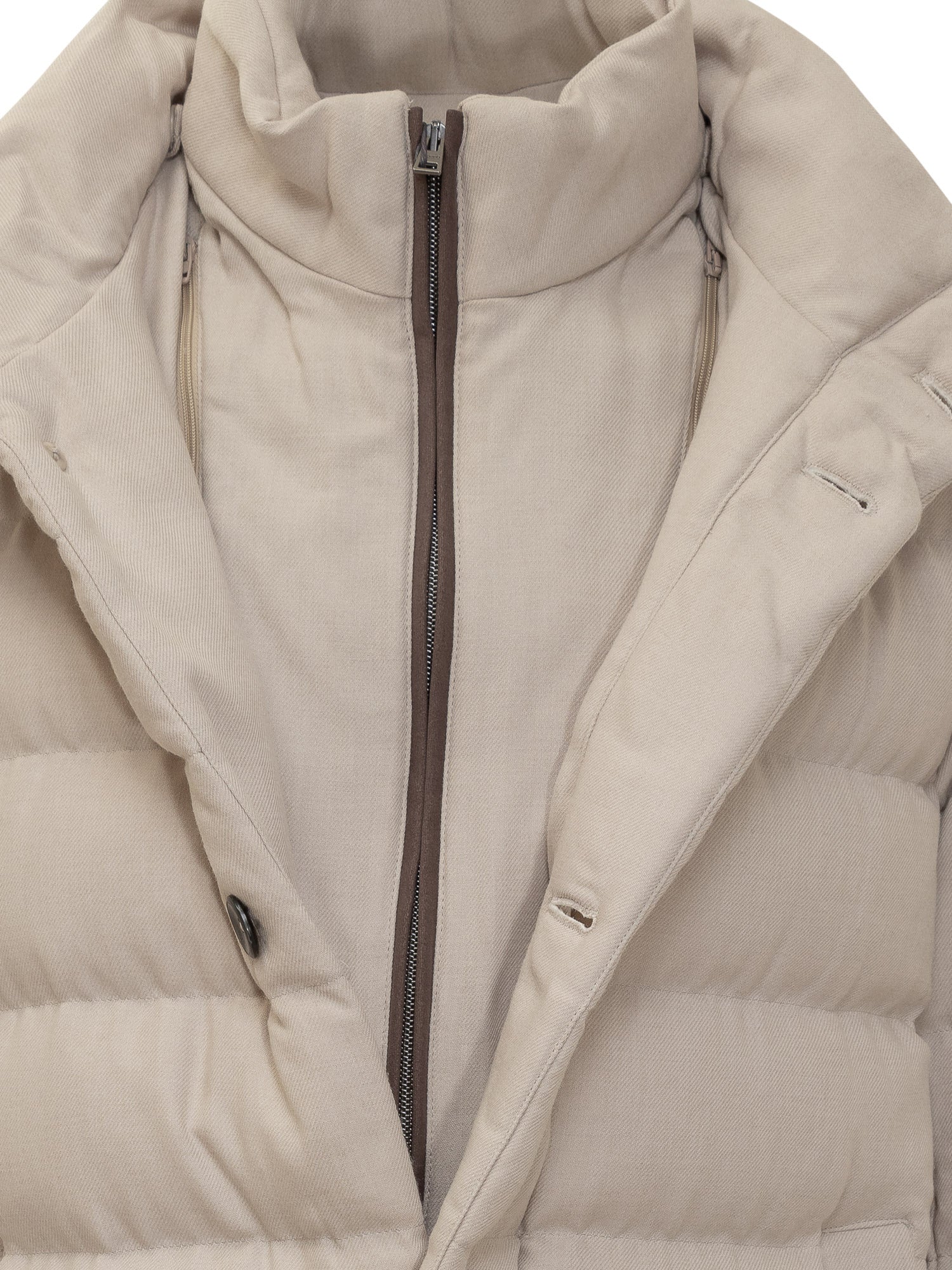 Piumino lungo MooRER in tessuto beige con trapuntatura orizzontale, chiusura con bottoni e zip interna, collo alto e tasche laterali.