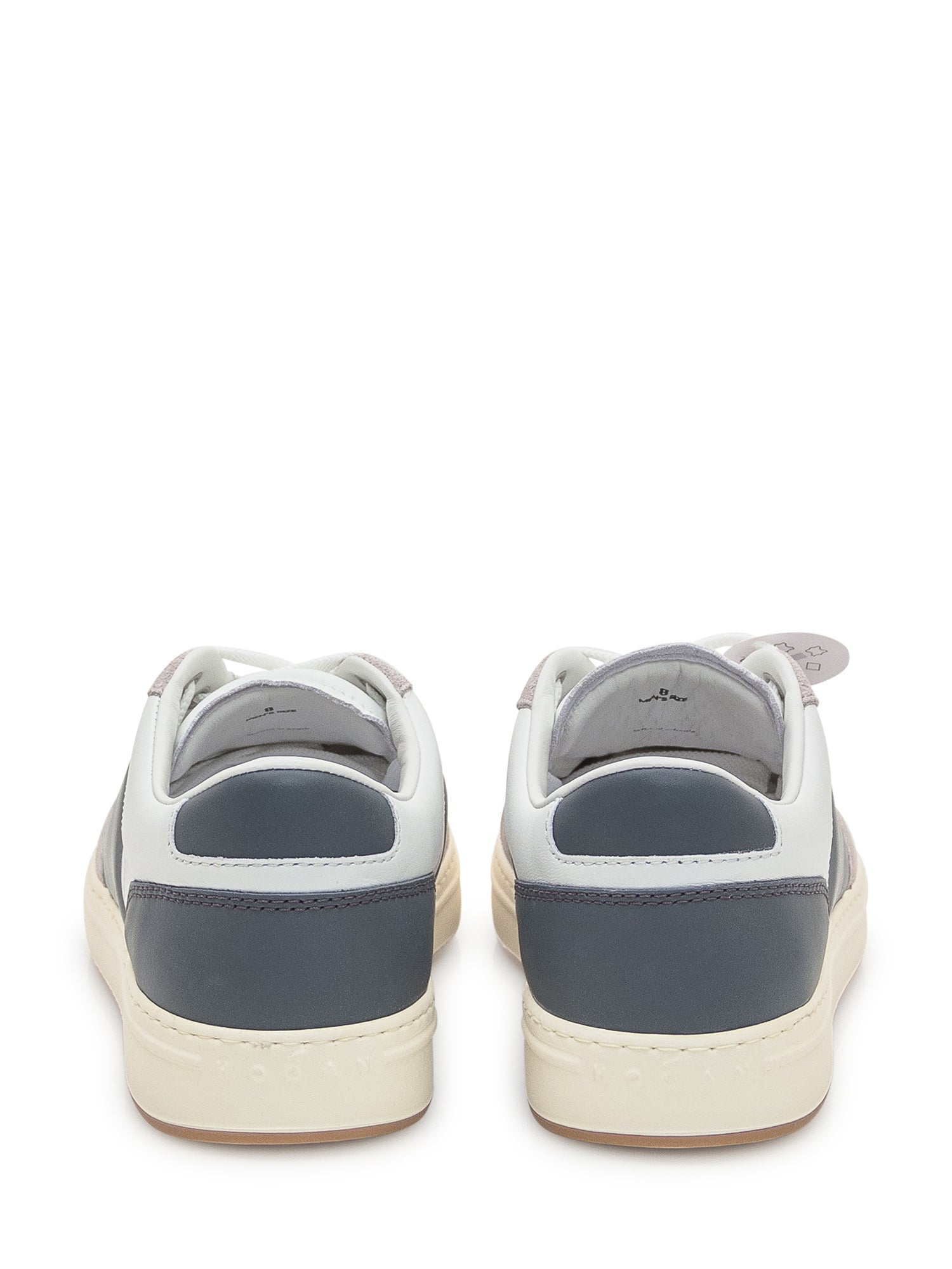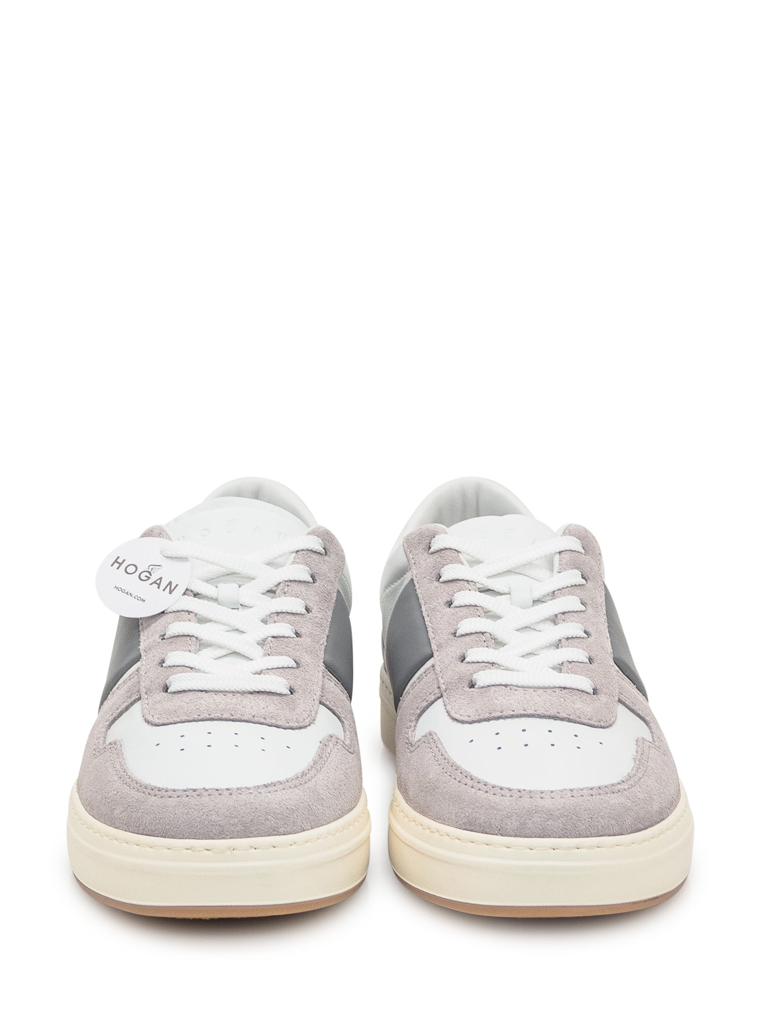 Sneakers Hogan H668 in pelle e camoscio con inserti grigi a contrasto. Logo laterale, suola in gomma color crema e lacci grigi di ricambio.