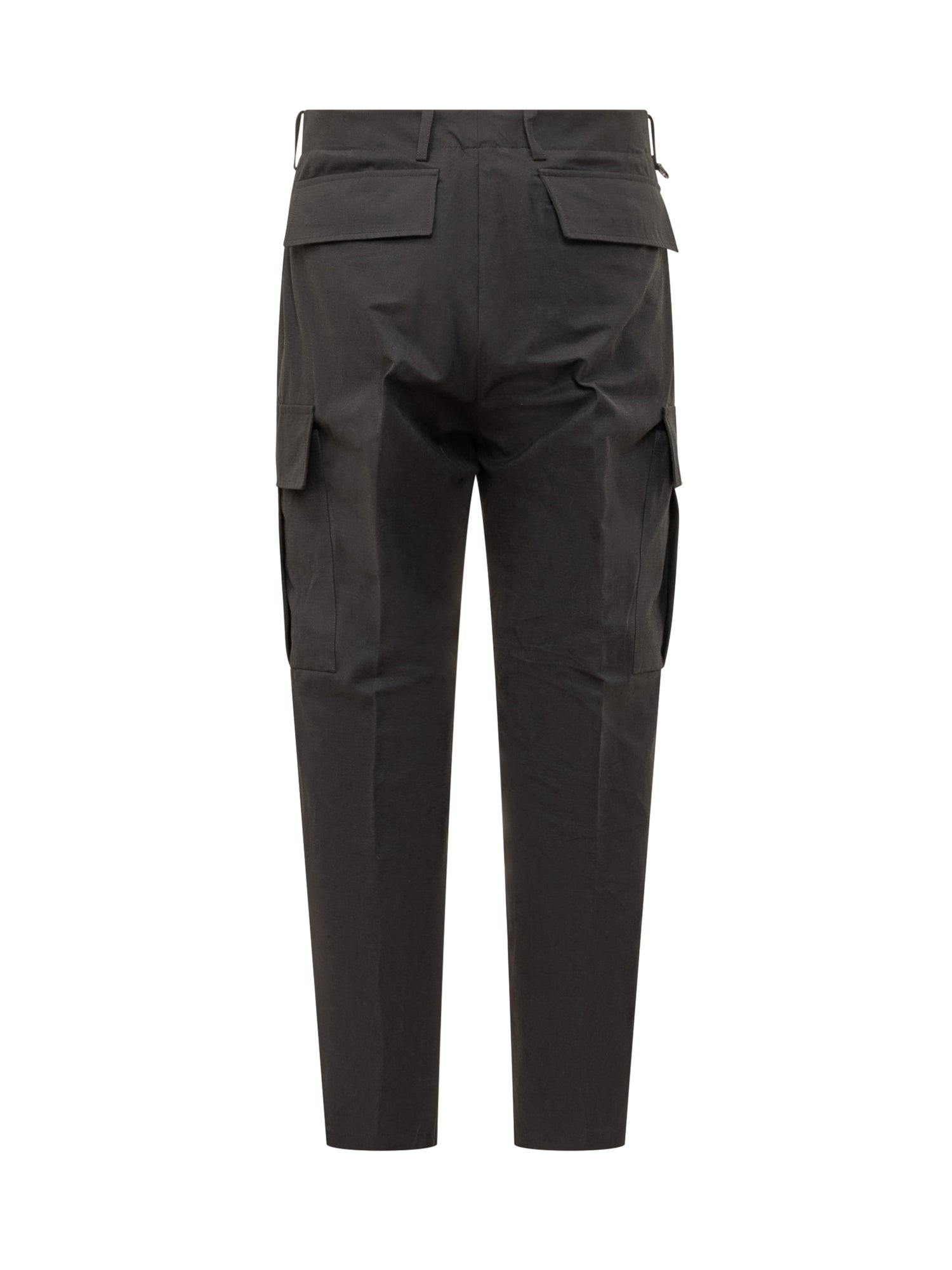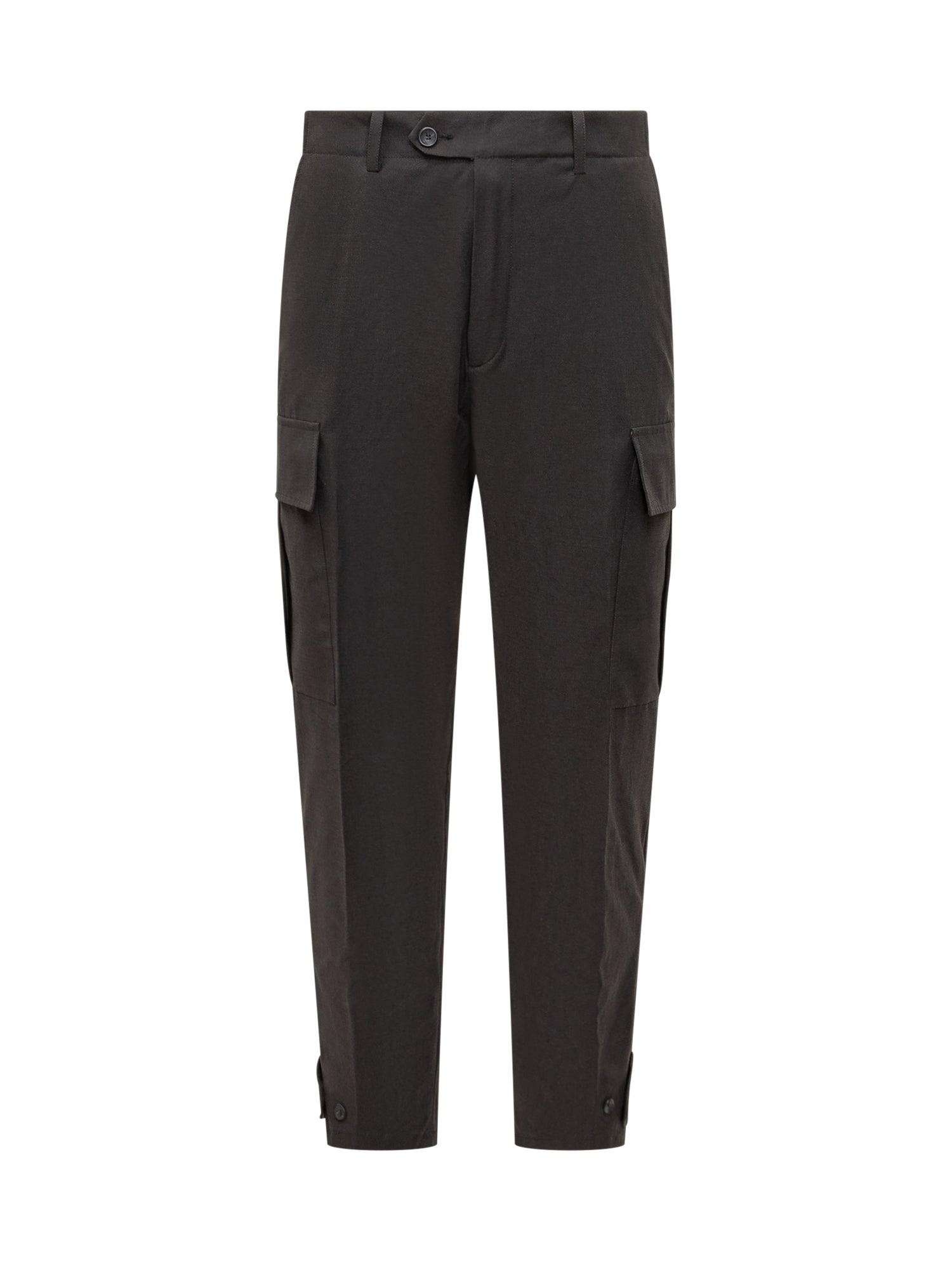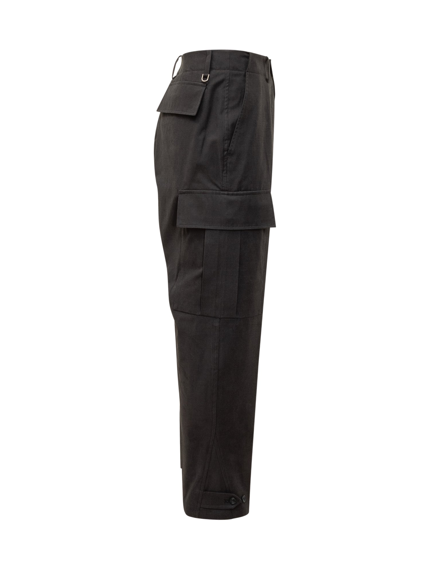 Pantaloni cargo Hosio in tessuto tecnico nero con tasche laterali, chiusura frontale e alamari regolabili alle caviglie.