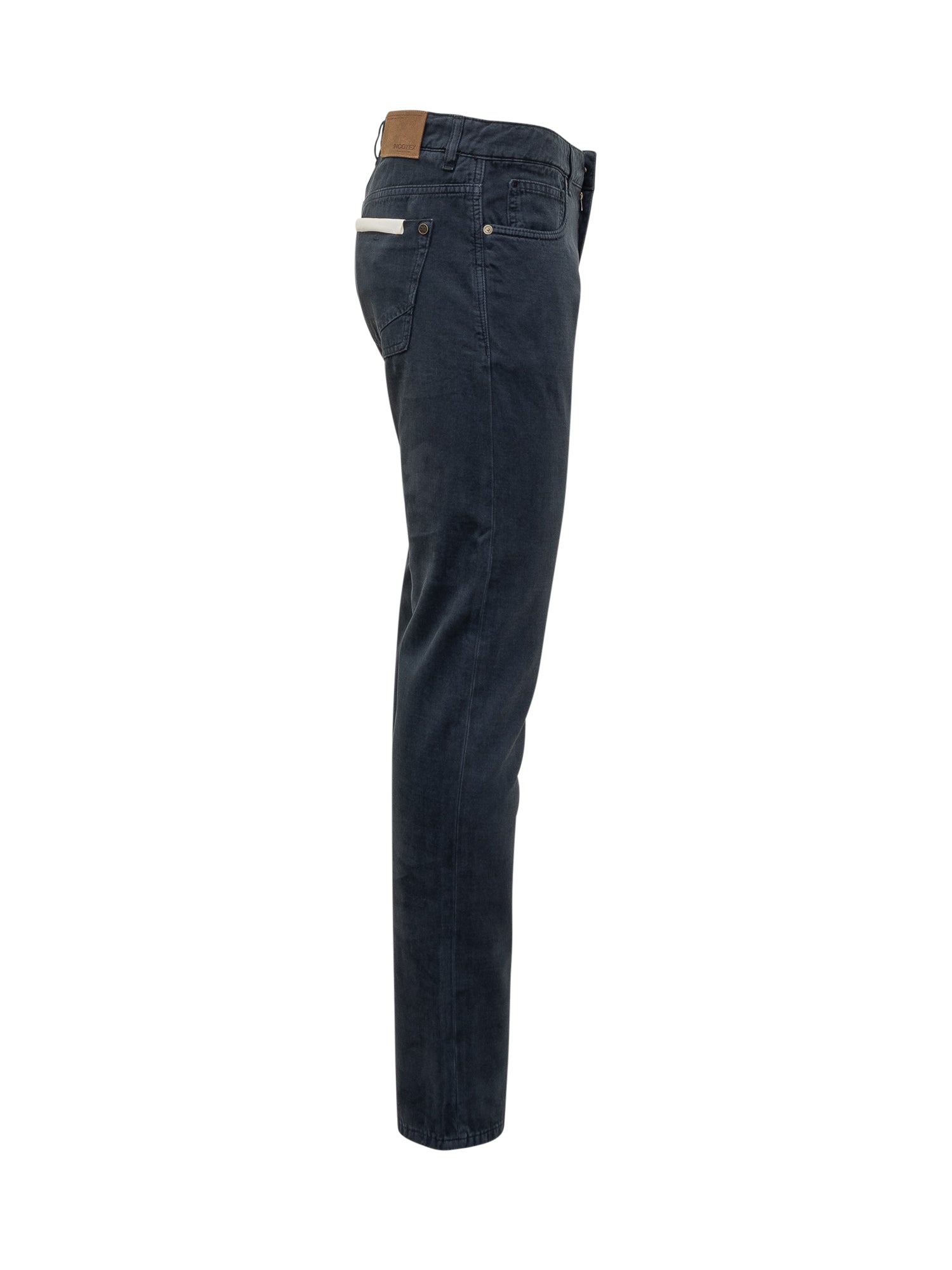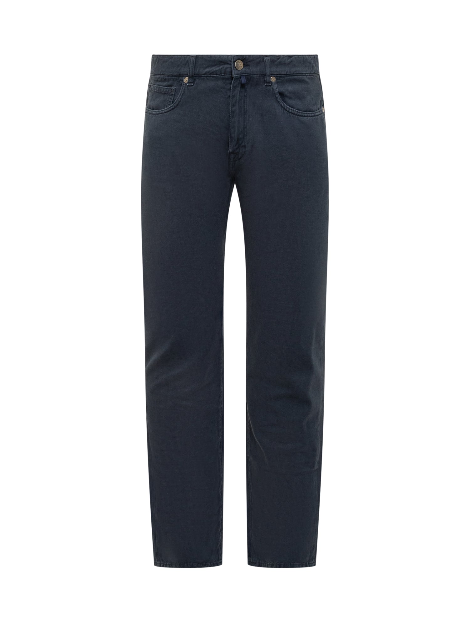 Jeans Incotex in cotone blu con taglio dritto e cuciture tono su tono. Modello a cinque tasche con chiusura a bottone e zip.