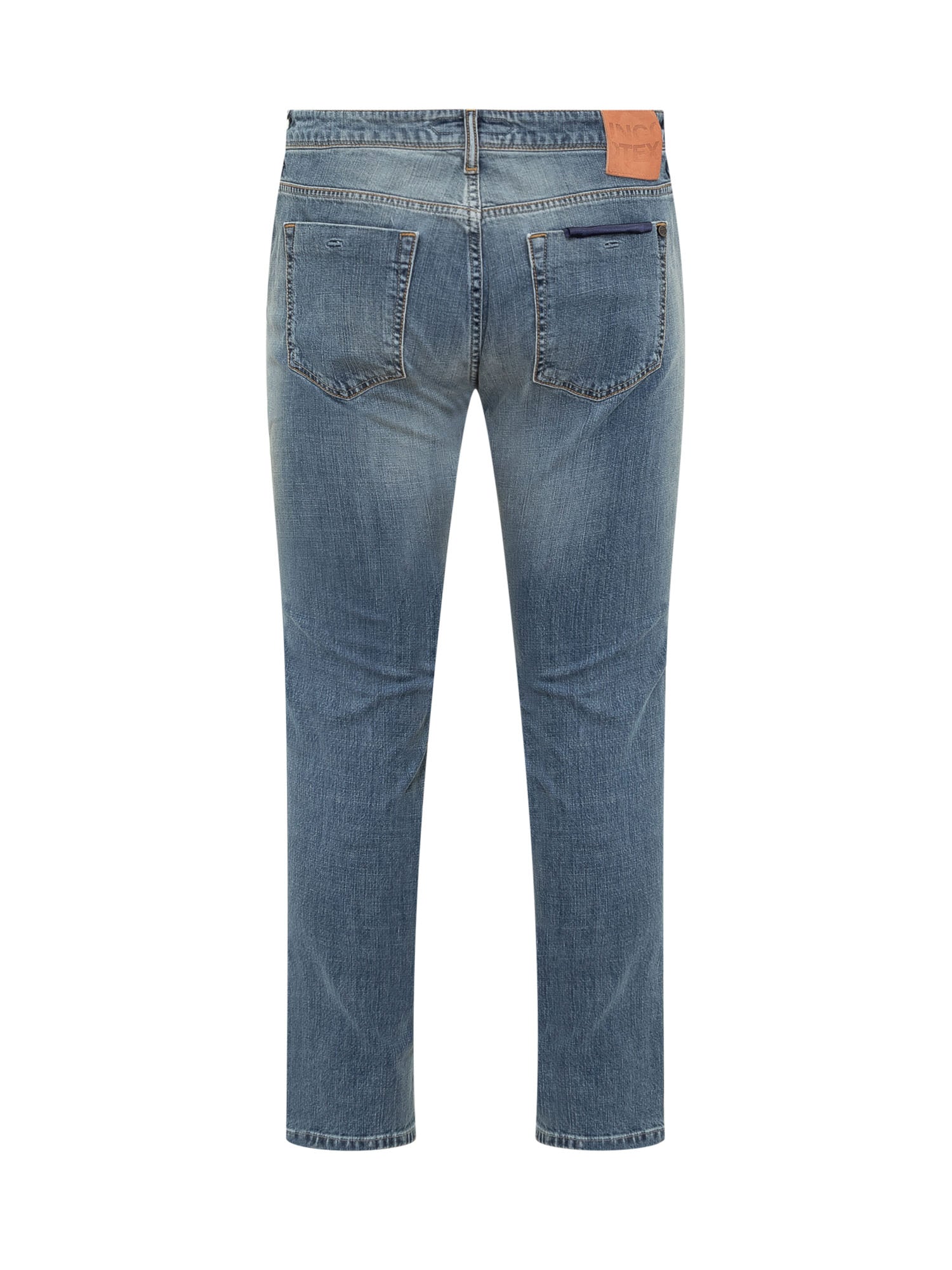 Jeans lungo straight fit. Chiusura con bottoni. Passanti per cintura. Cinque tasche.