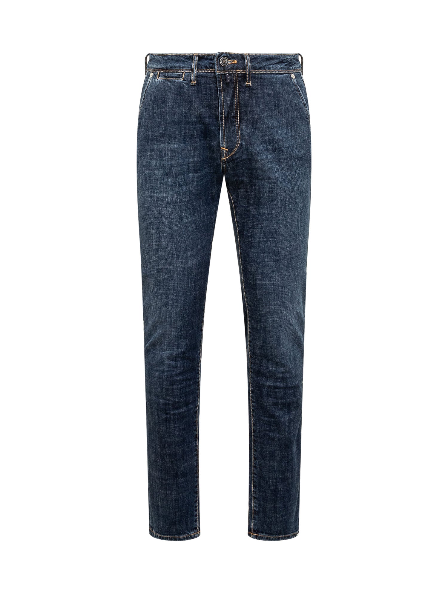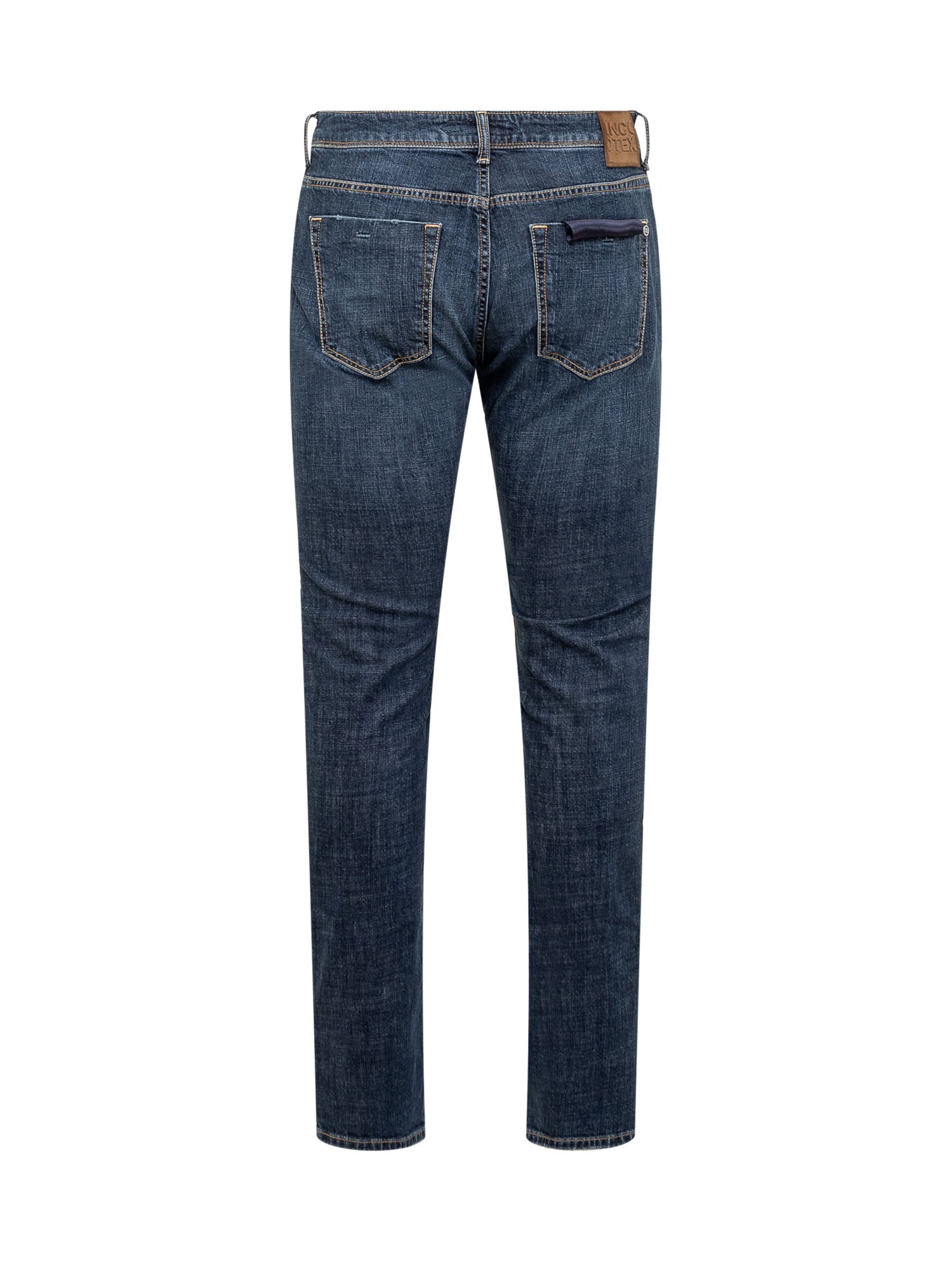 Pantalone lungo blu in denim. Cinque tasche. Chiusura con bottoni. Passanti per cintura. Gamba dritta.