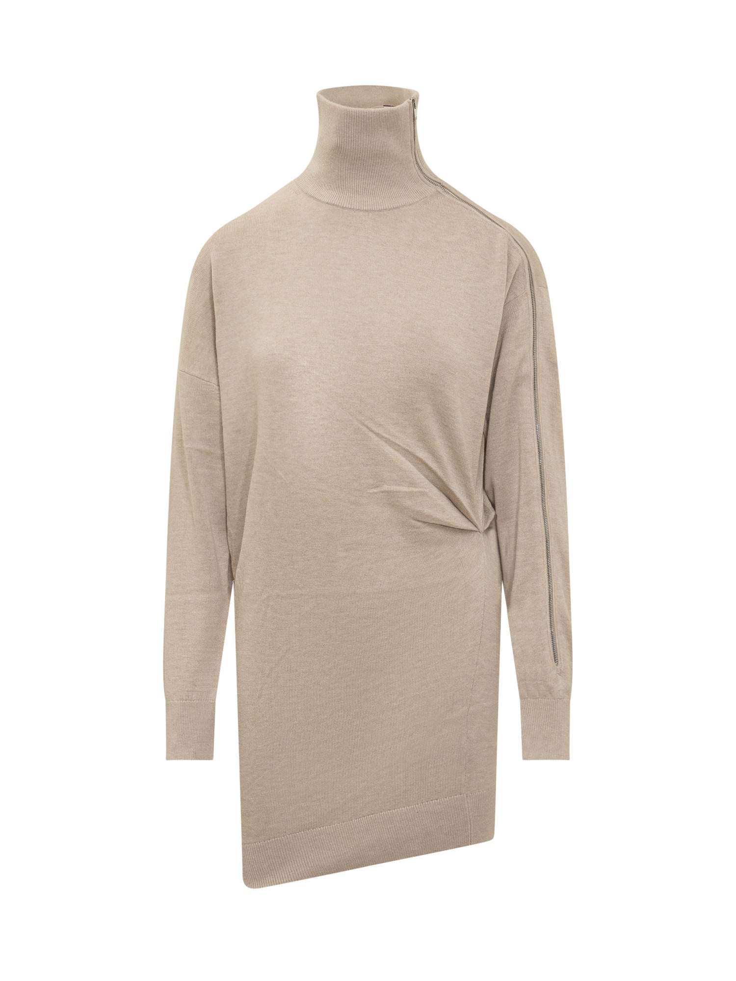 Abito beige in maglia a maniche lunghe. Dolcevita. Chiusura laterale con zip. Slim fit.