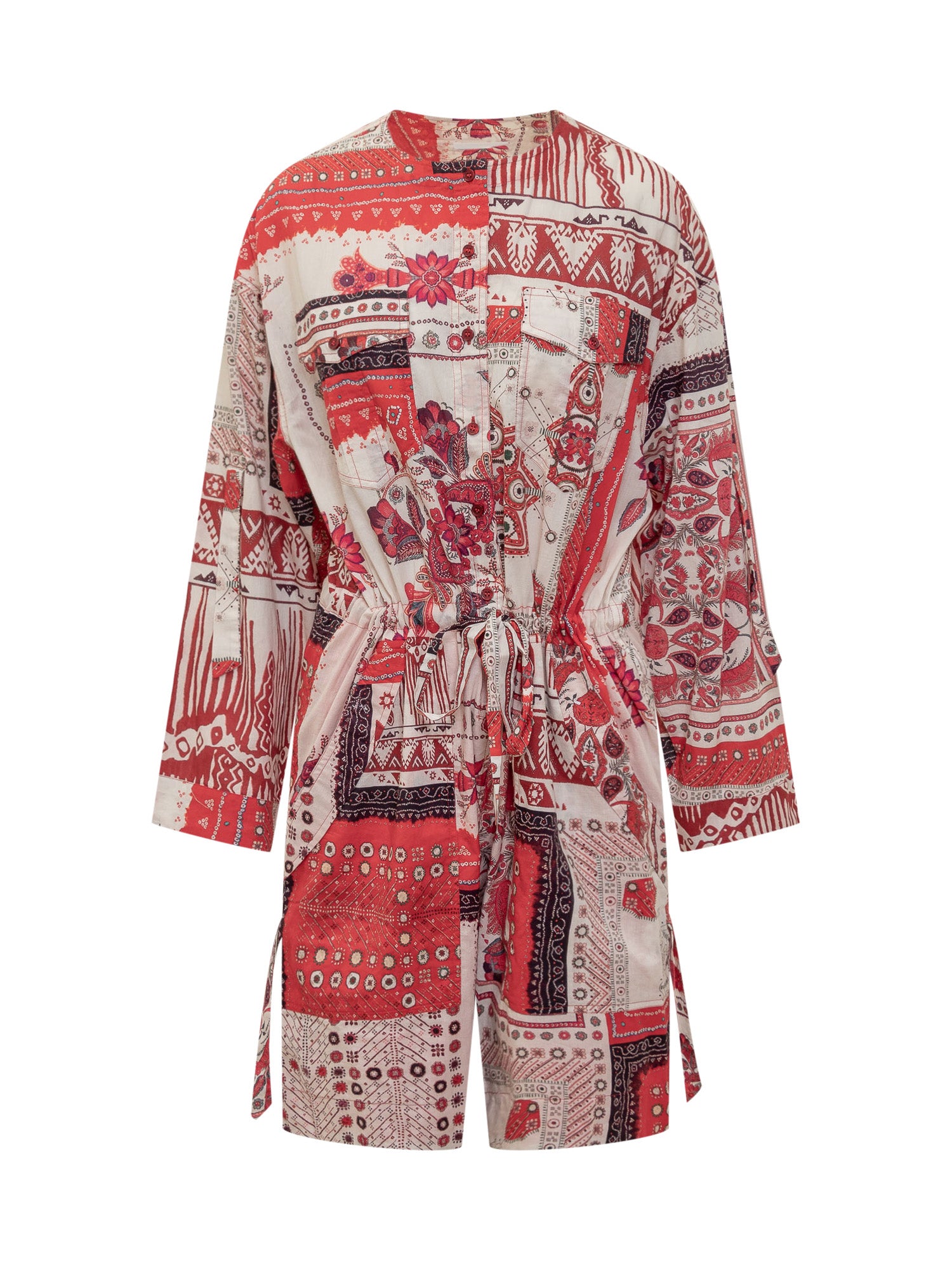 Maniche lunghe. Chiusura con bottoni. Girocollo. Arricciatura in vita.