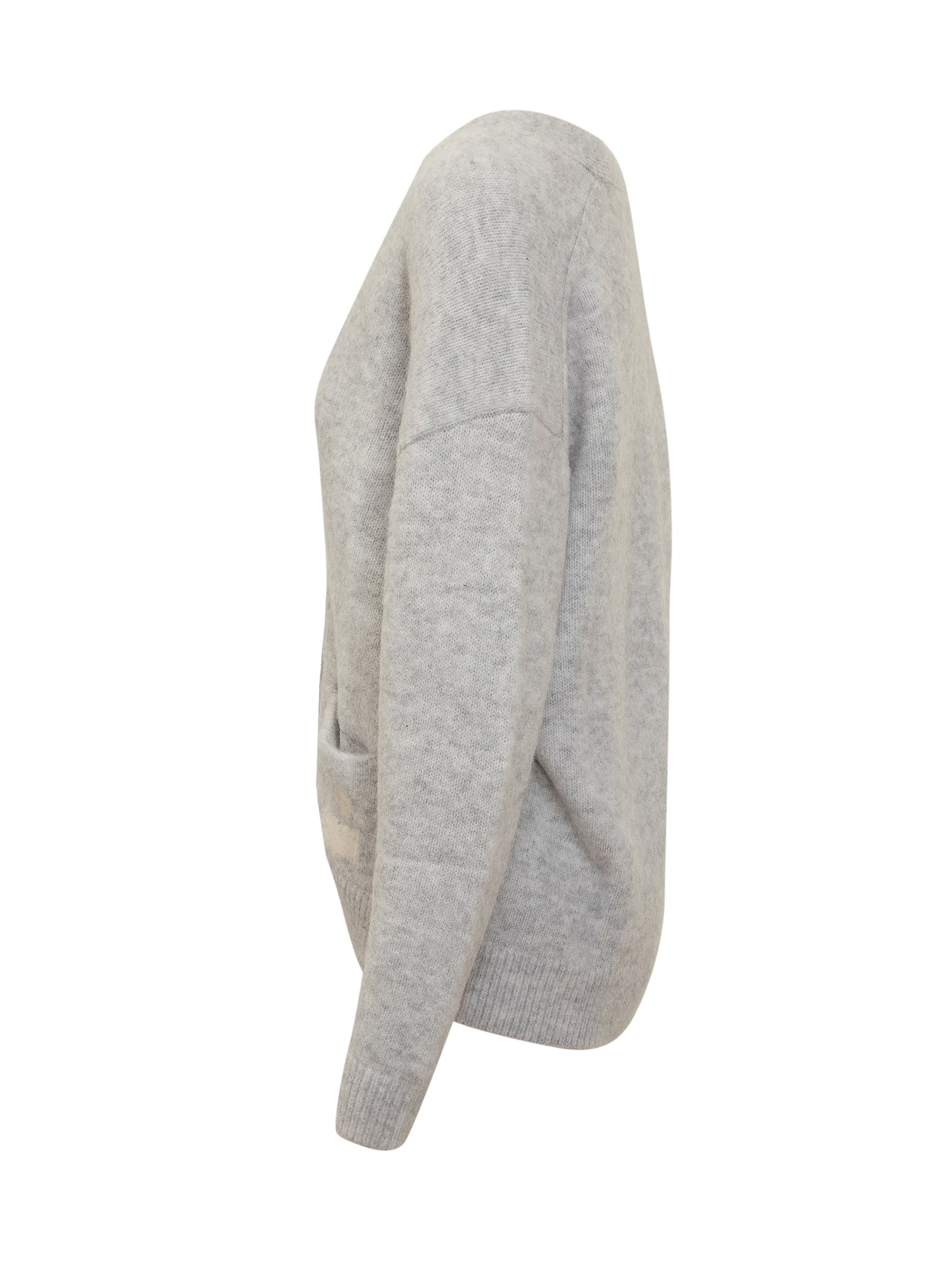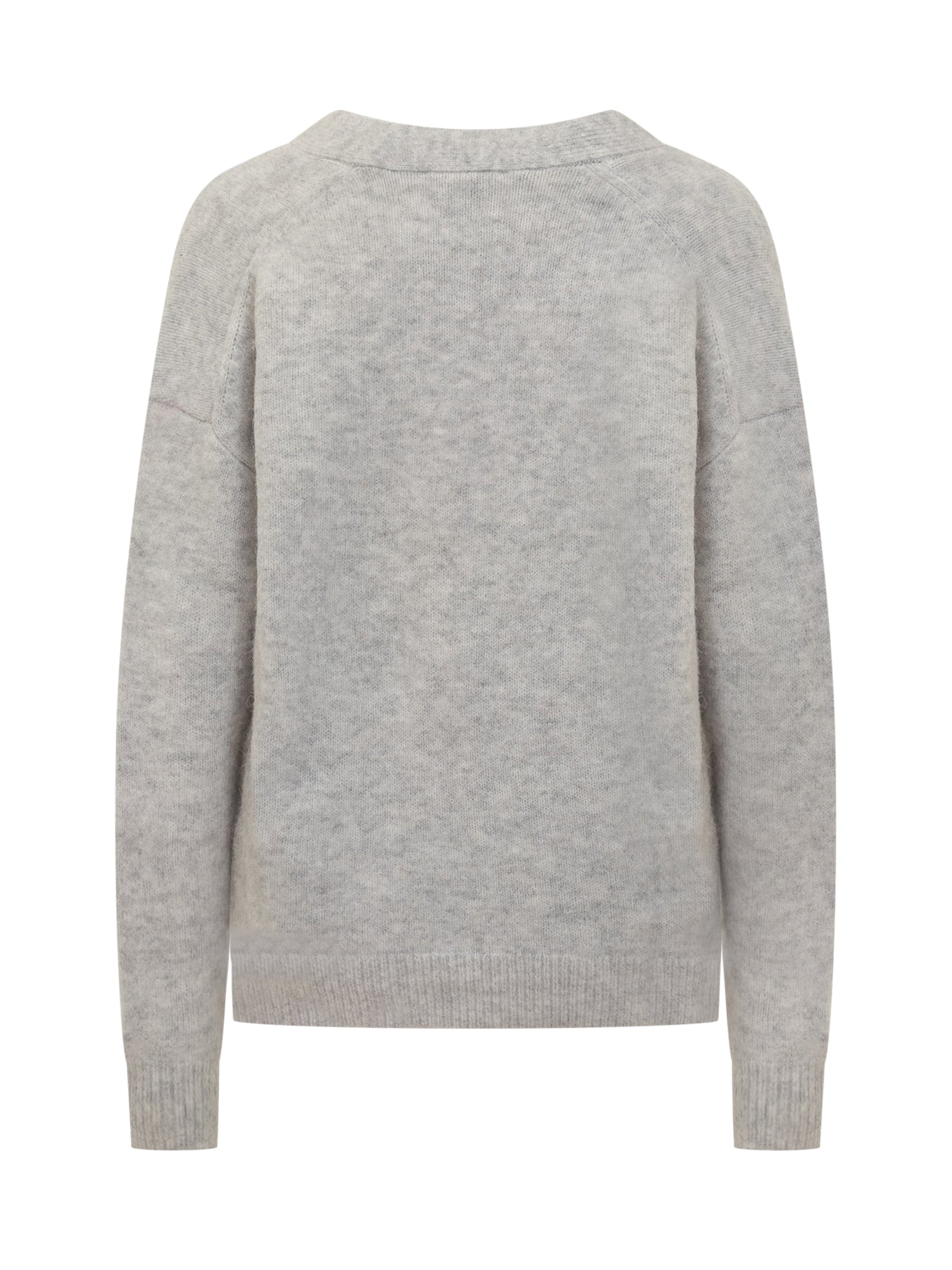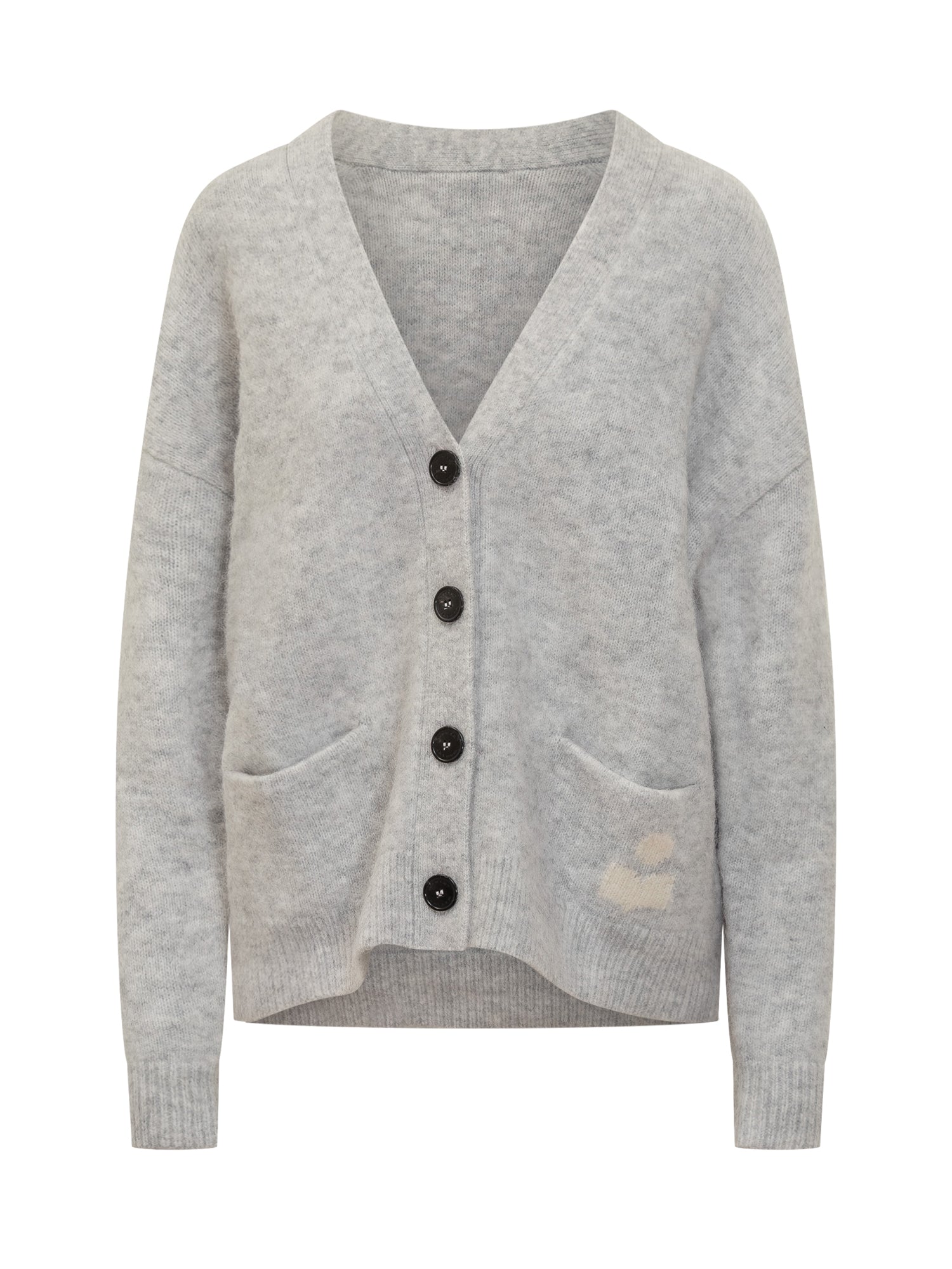Cardigan Isabel Marant Étoile in lana grigia con scollo a V, bottoni frontali e tasche applicate. Logo tono su tono sul fondo.