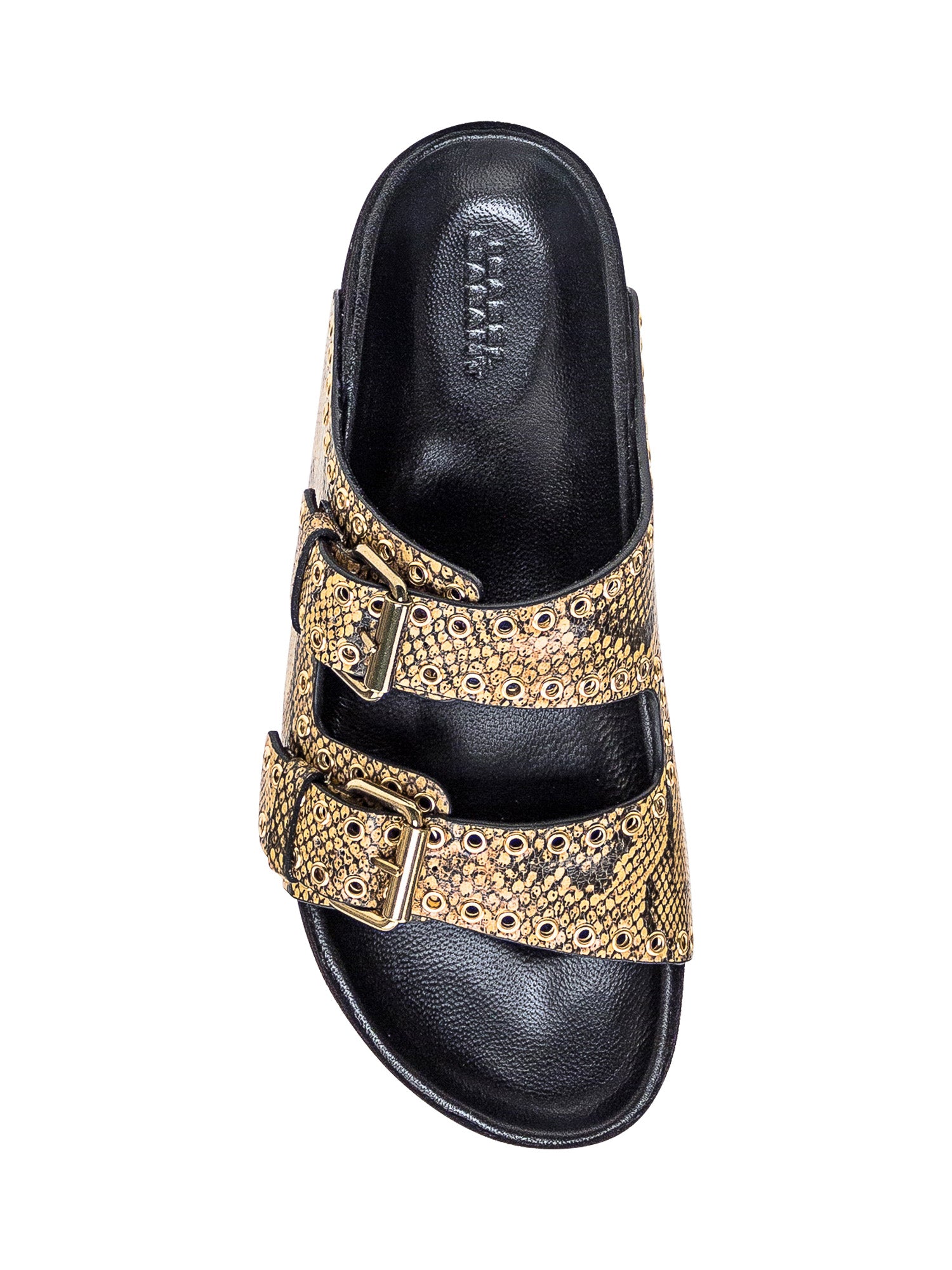 Sandalo in pelle con effetto pitone. Dettaglio borchie con fibbie in metallo. Logo sulla soletta interna.