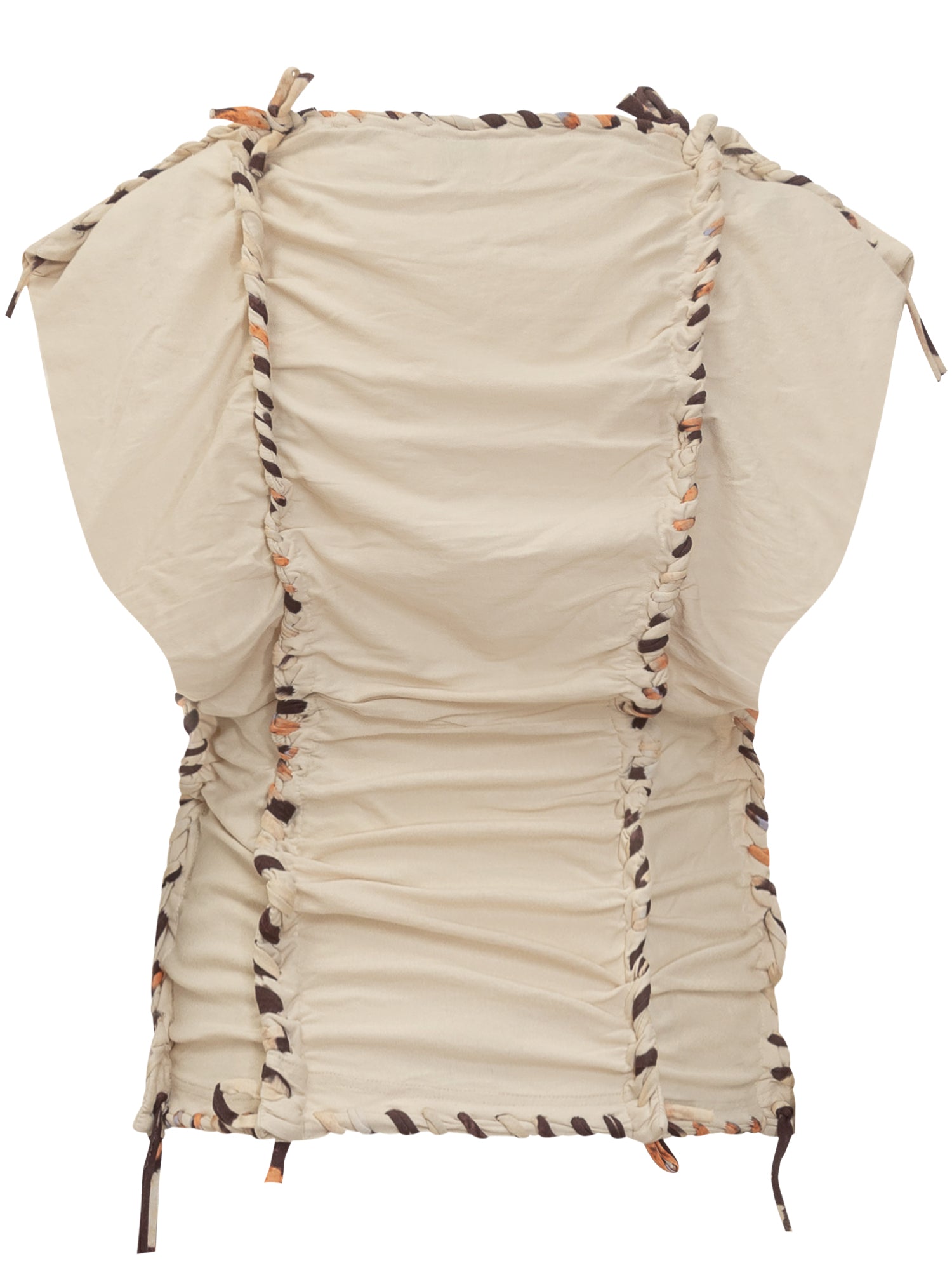 Top beige. Scollo a barca. Maniche corte. Finiture in jersey intrecciate a fantasia. Design arricciato in vita.