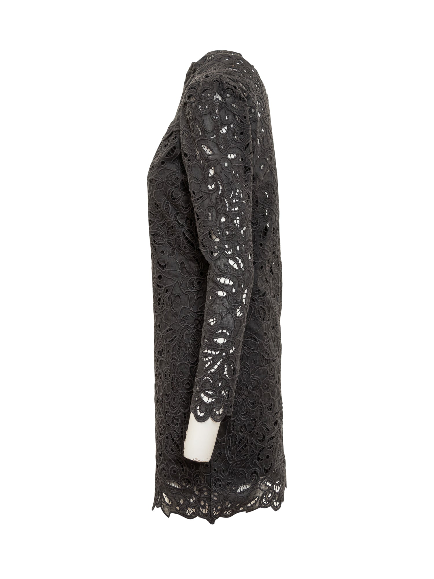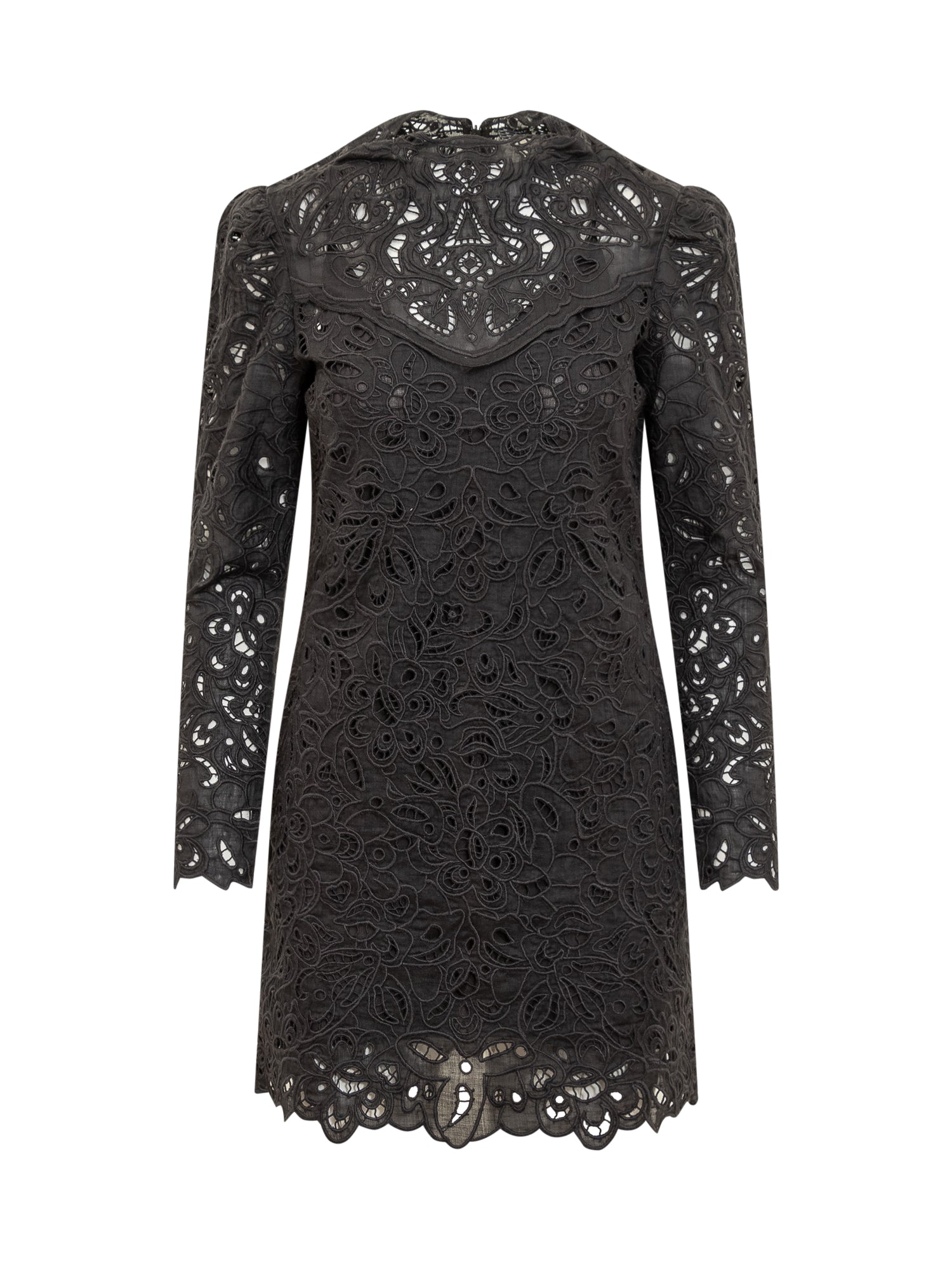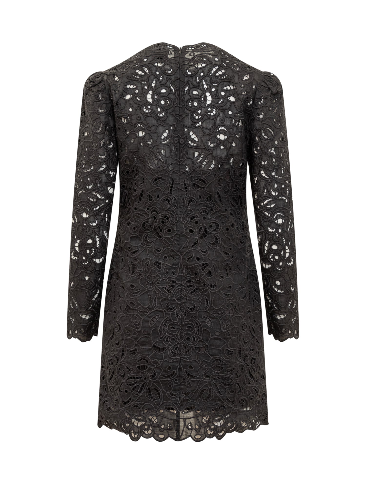 Abito corto in ramia. Maniche lunghe. Ricamo floreale in guipure. Collo leggermente alto. Chiusura con zip sul retroSottoveste interna.