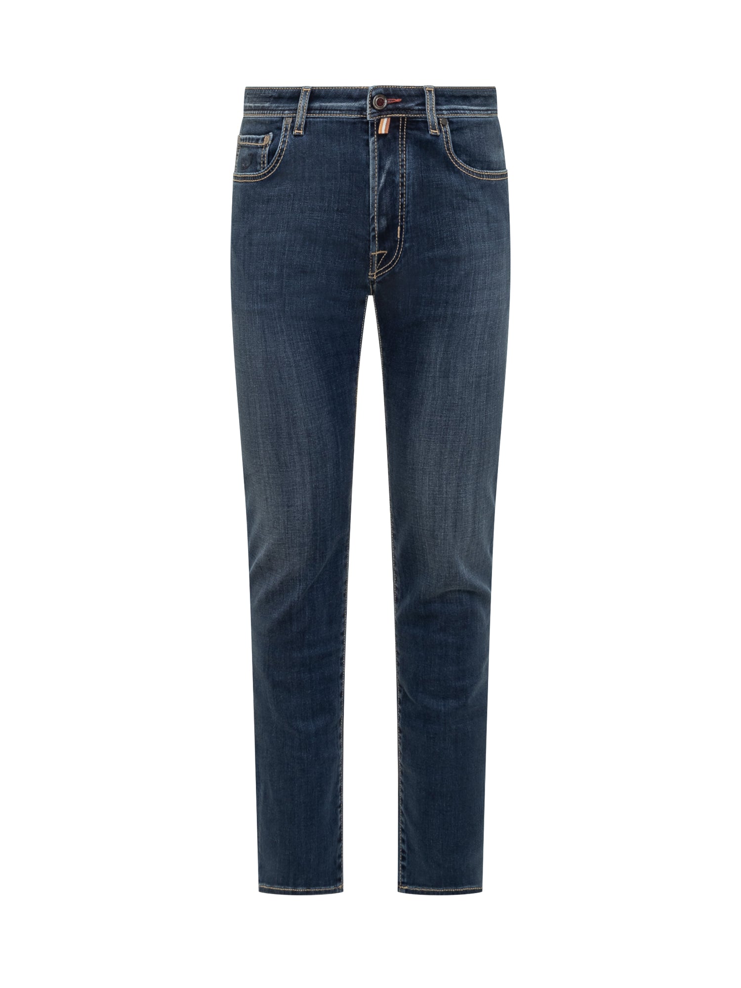 Jeans Jacob Cohen modello Bard in denim blu con lavaggio effetto used. Taglio slim, chiusura con bottone e zip, cinque tasche.