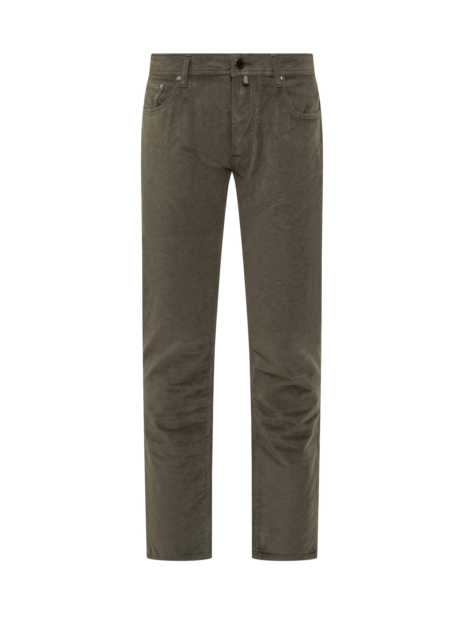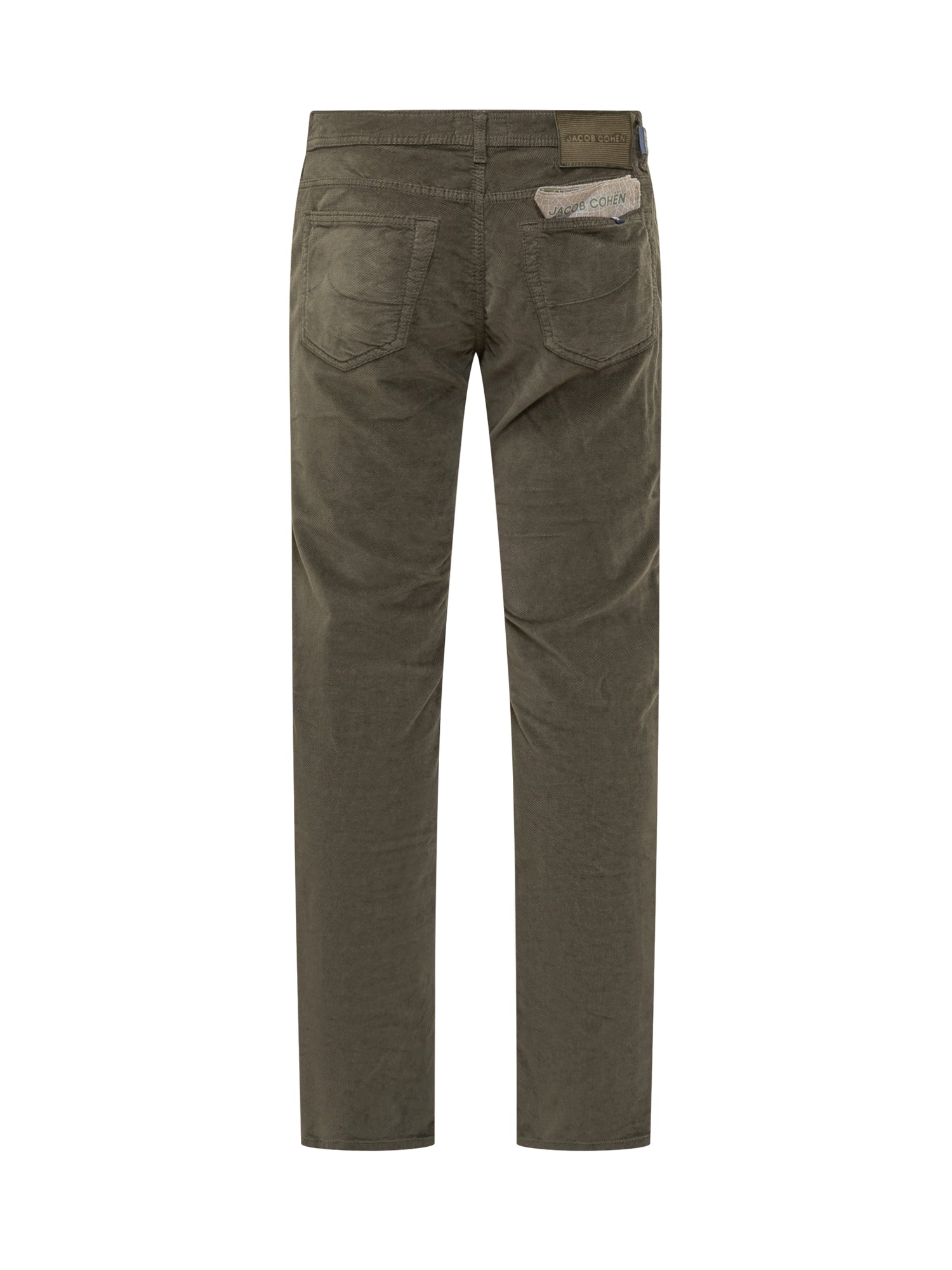 Pantaloni Jacob Cohen in velluto verde con tasche a cinque e chiusura con bottone e zip. Linea dritta e raffinata.