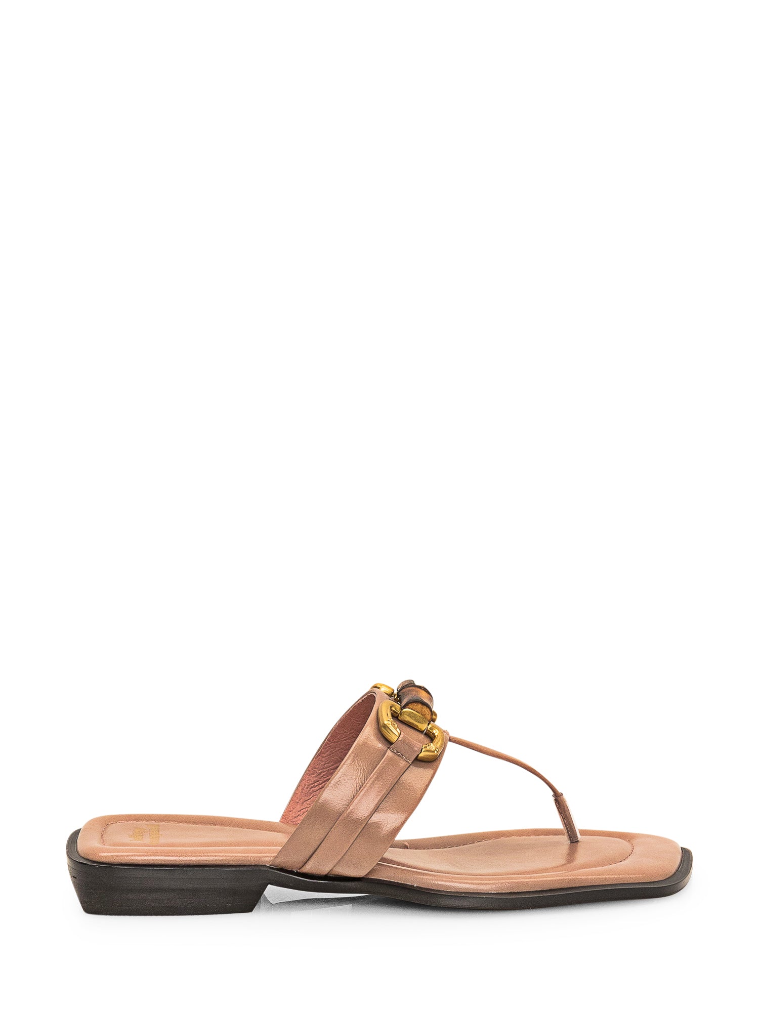Sandalo aperto sul tallone. T-bar con dettaglio in metallo e bamboo. Calzata regolare.