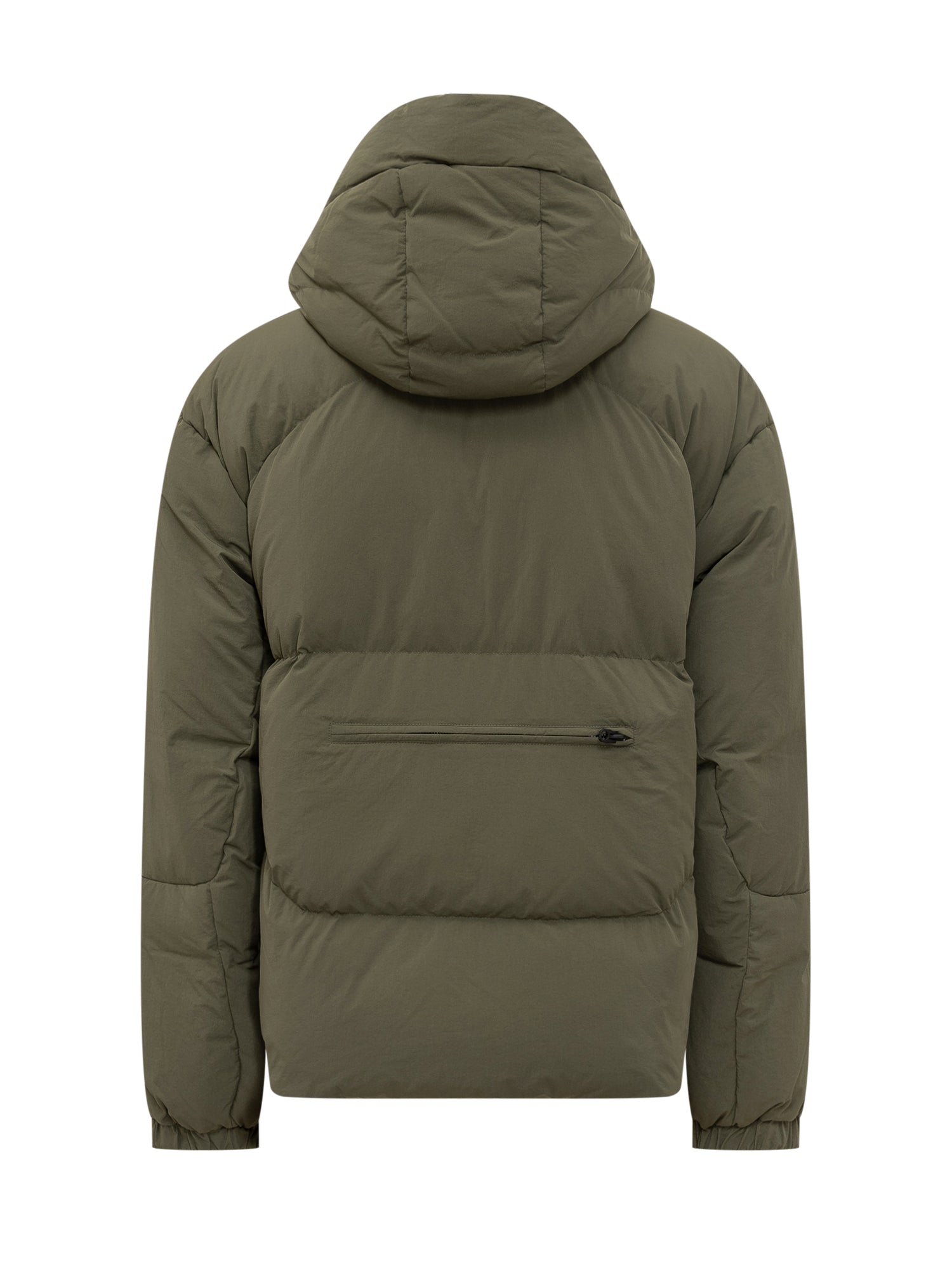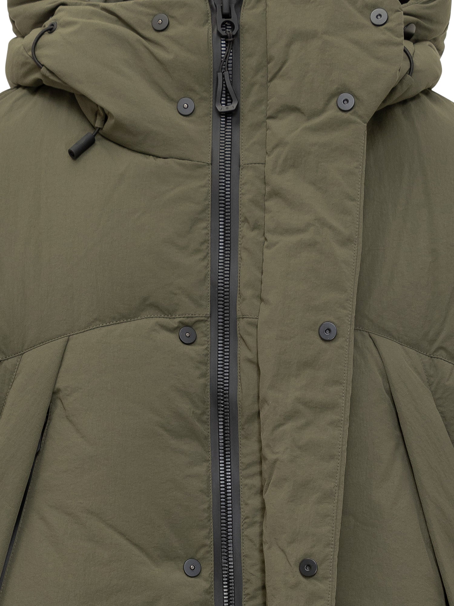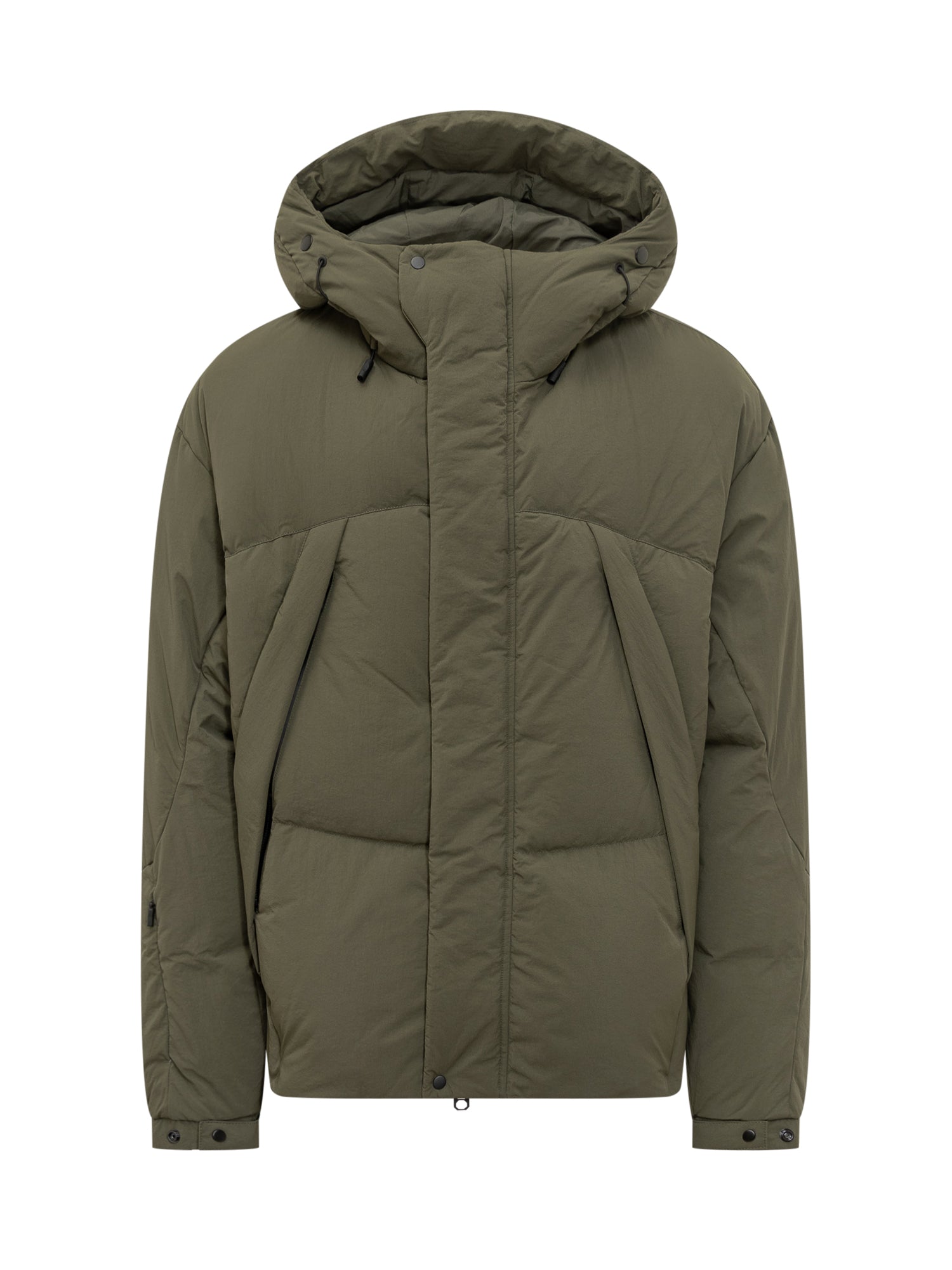 Piumino Yves Salomon verde imbottito, con cappuccio regolabile e chiusura a zip coperta.