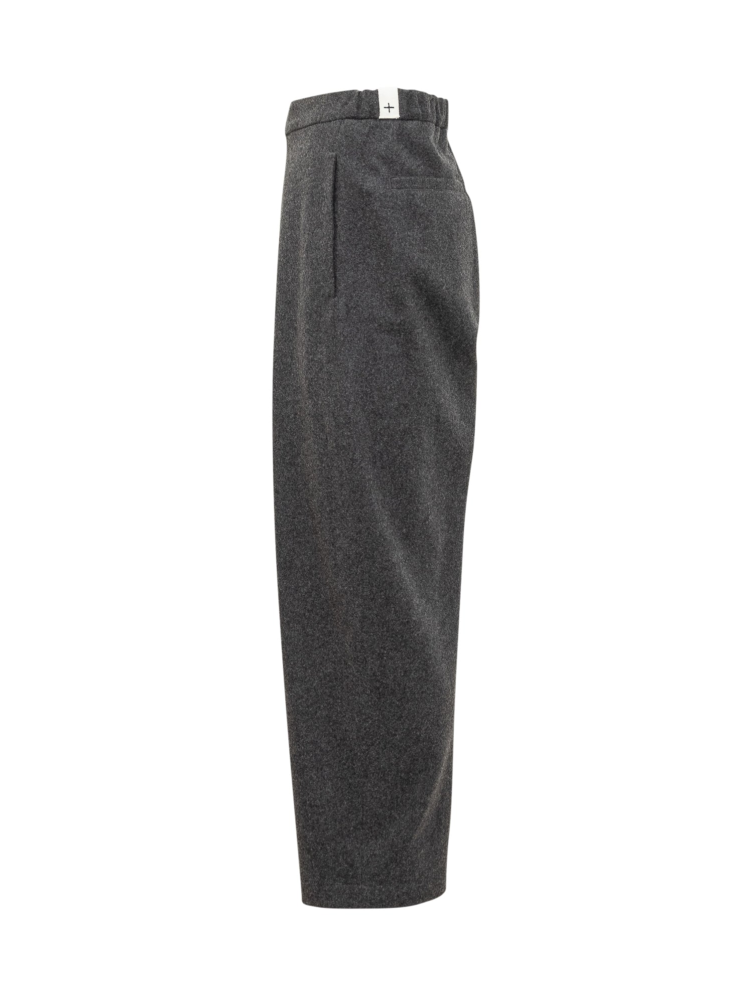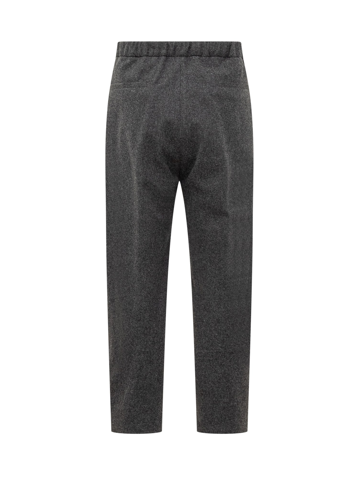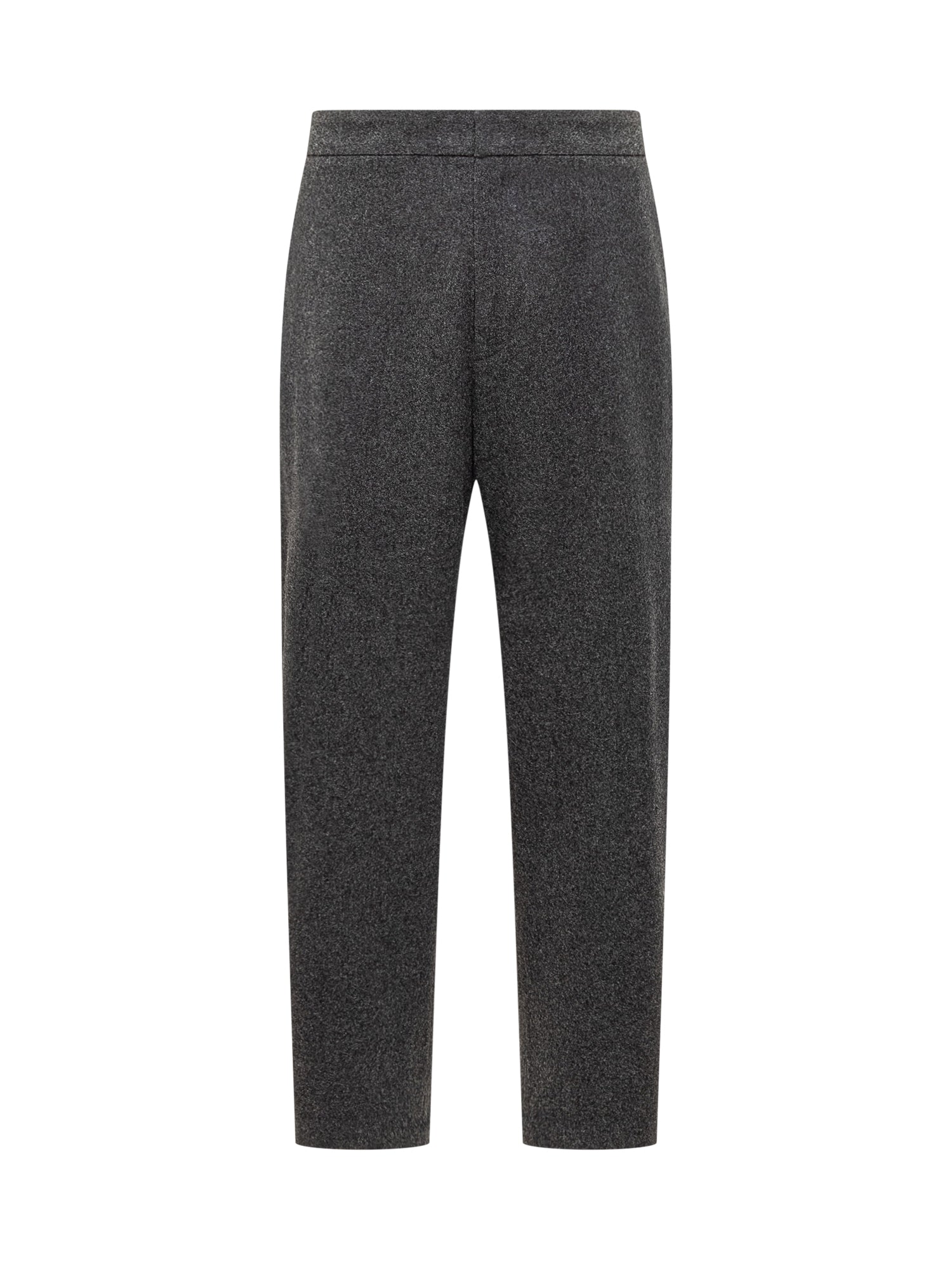 Pantalone grigio in lana. Tasche a filetto sul retro. Chiusura con zip e gancino.
