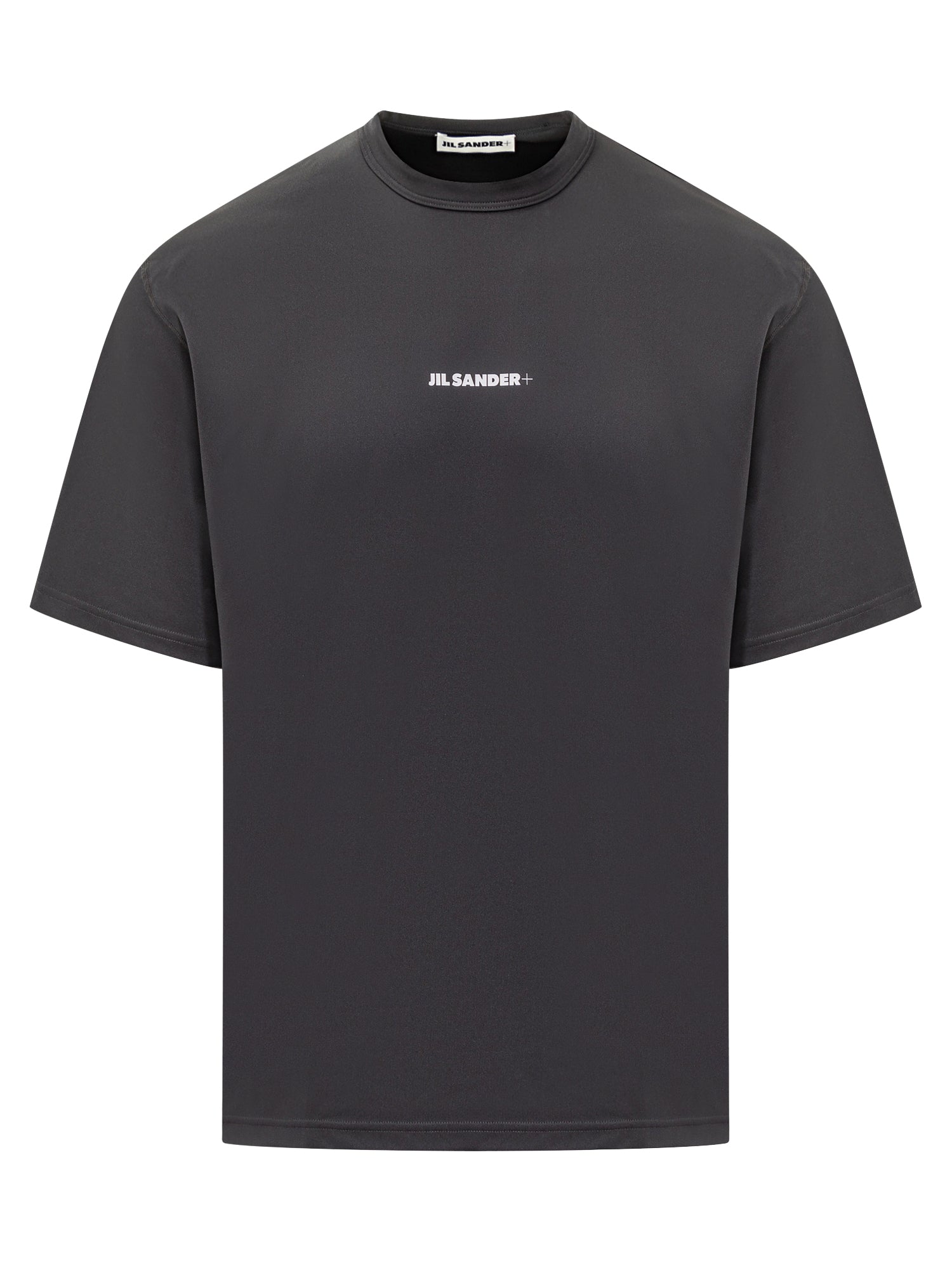 T-shirt minimal in cotone nero con logo Jil Sander+ bianco al centro. Taglio regular e stile essenziale.
