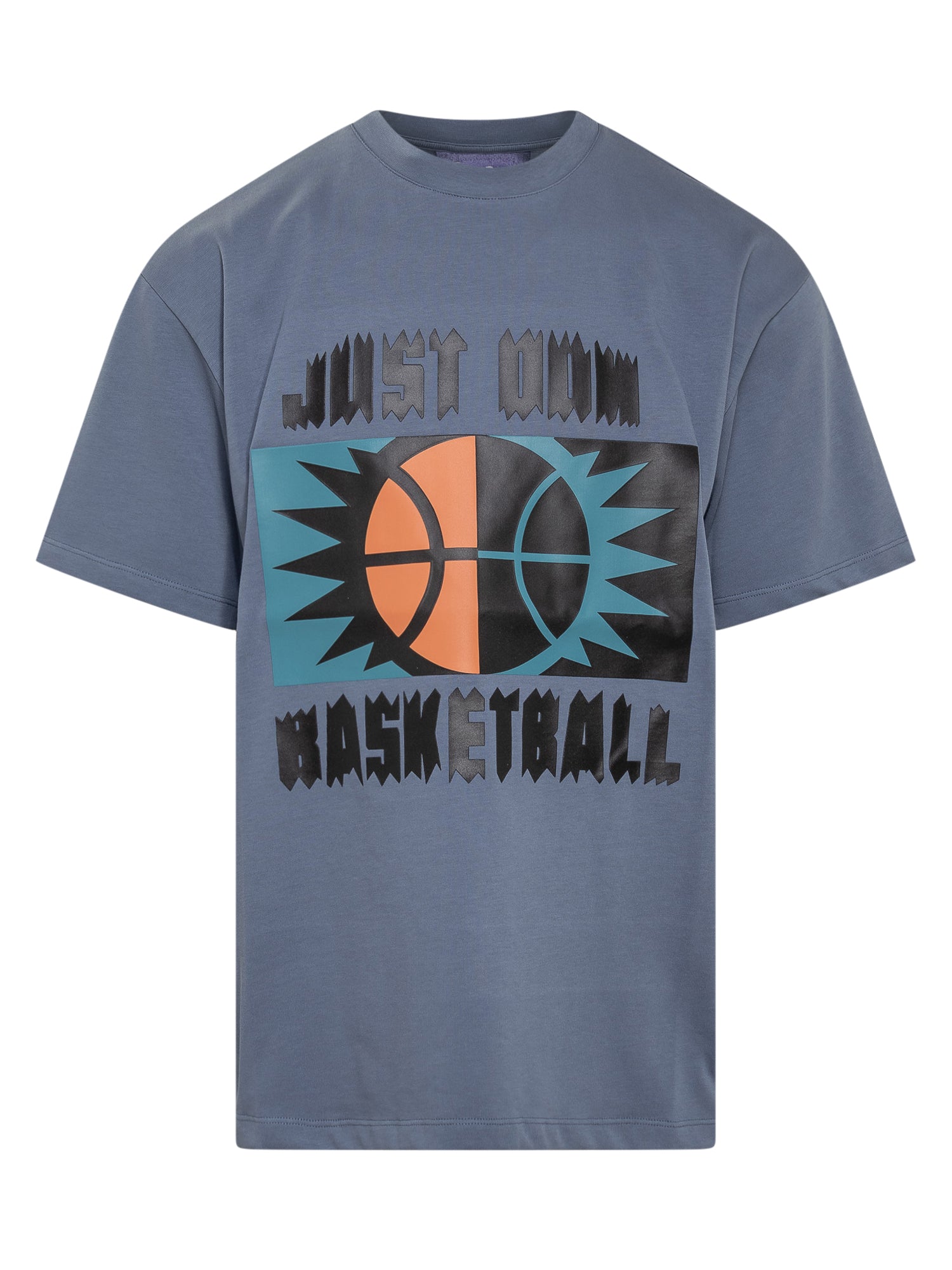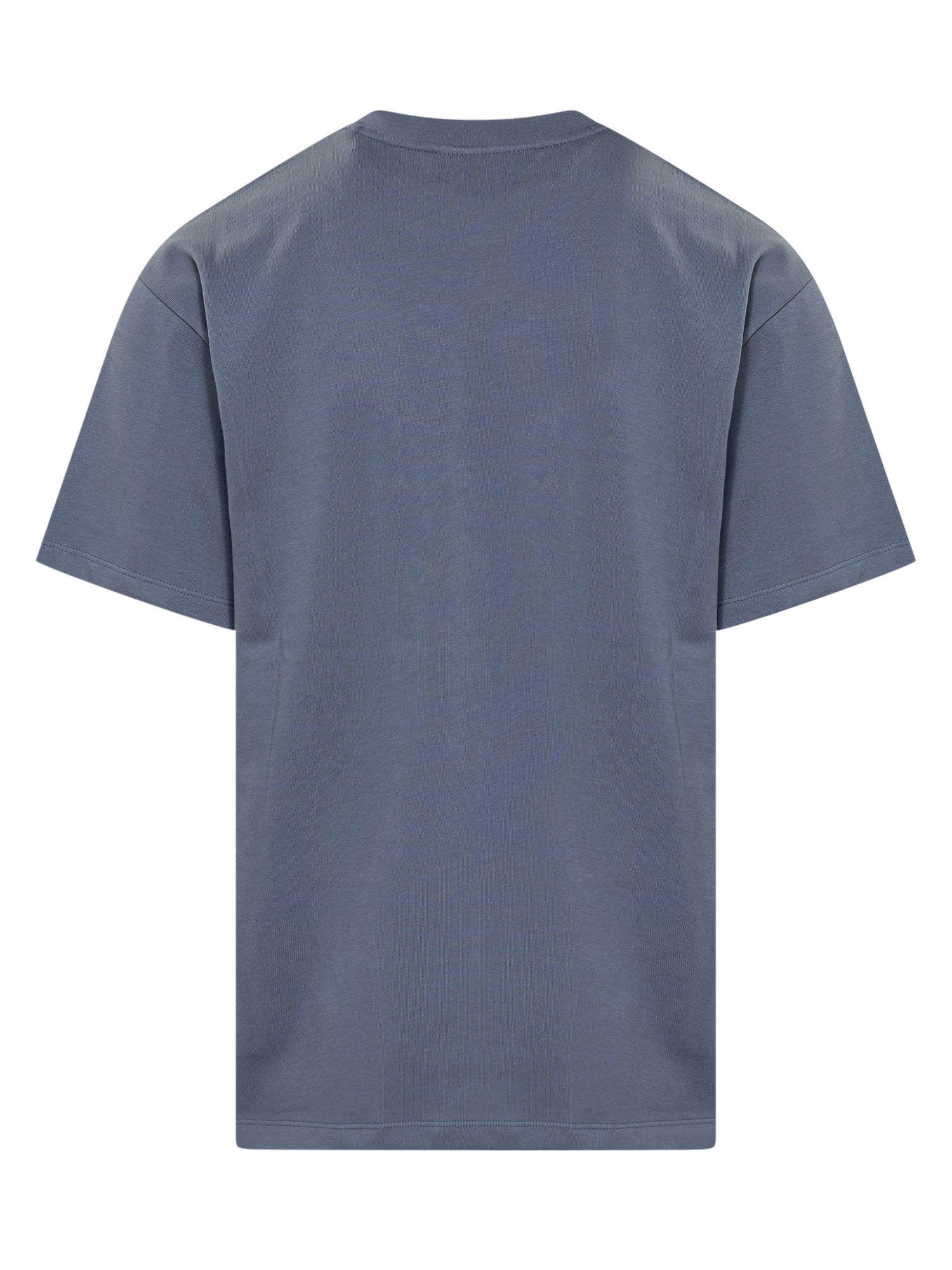 T-shirt blu. Girocollo. Stampa e logo sul davanti. Collo a costine.