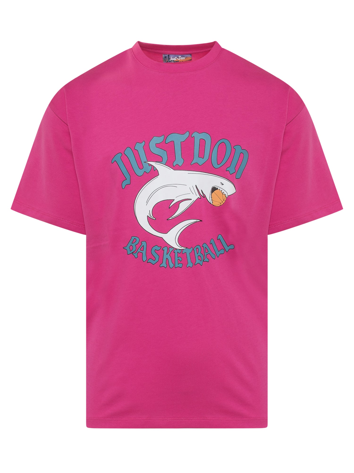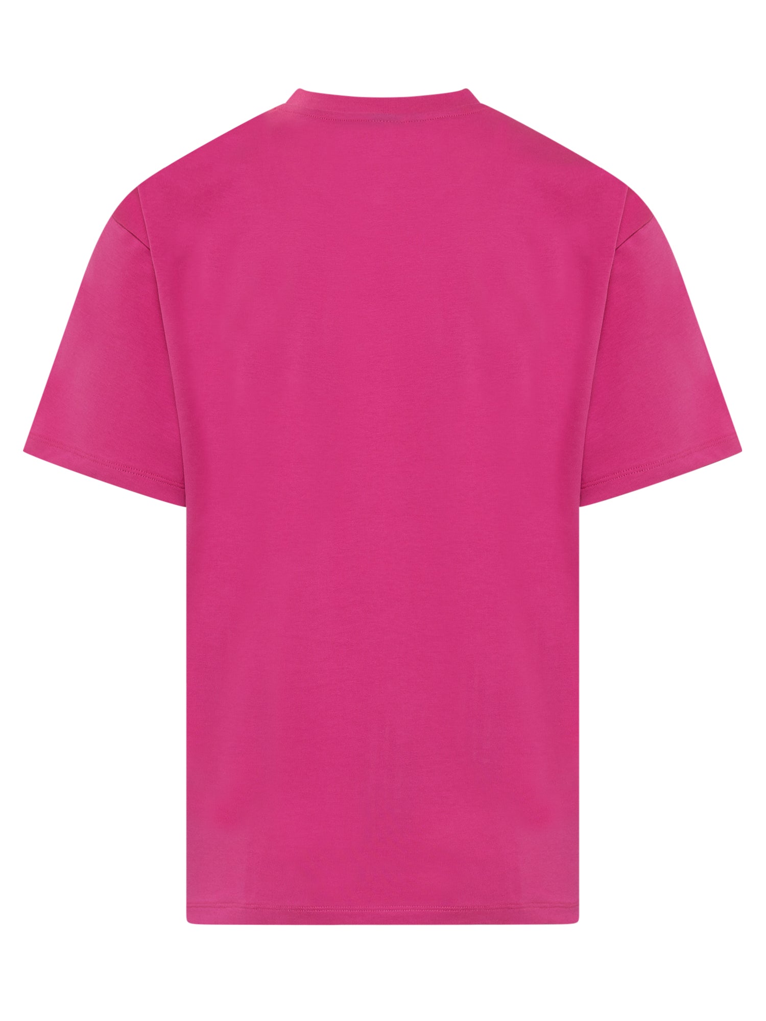 T-shirt fucsia. Girocollo. Stampa e logo sul davanti. Collo a costine.