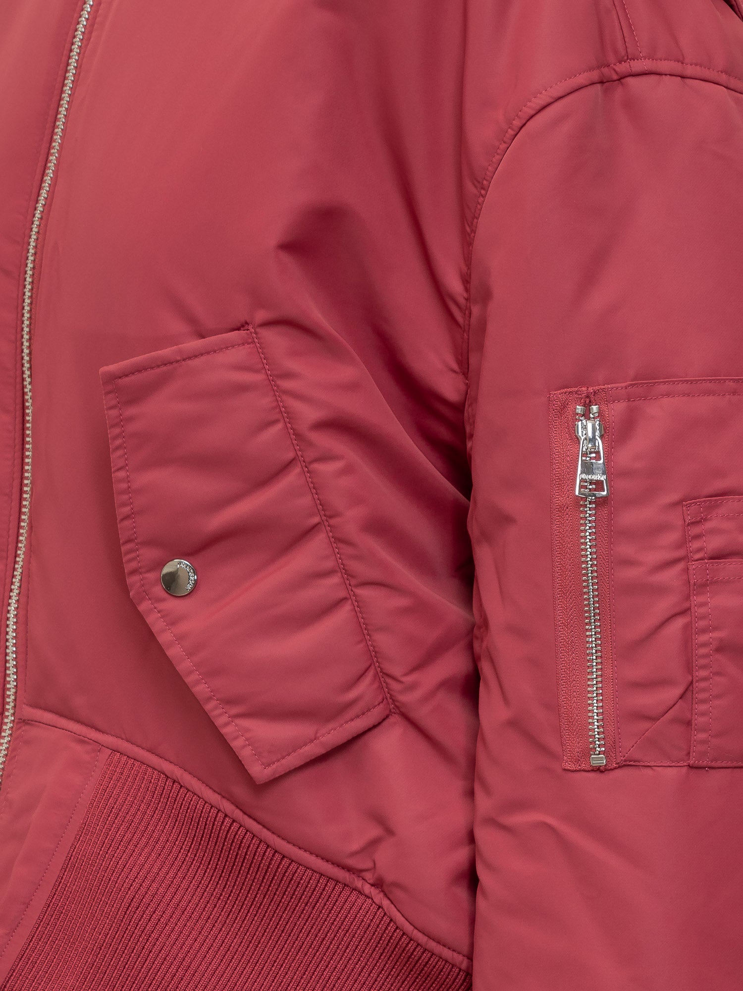 Bomber oversize JW Anderson in tessuto tecnico rosso fragola. Chiusura zip doppio cursore, tasche con pattina e taschino sulla manica.