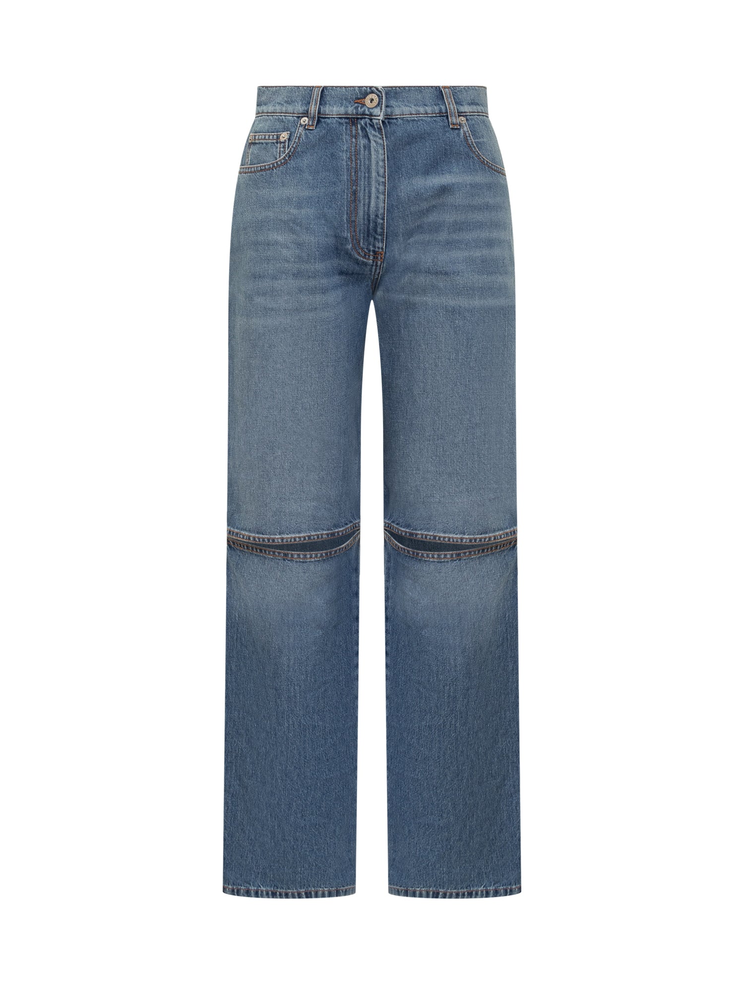 Jeans cinque tasche. Vestibilità regolare. Tagli sul davanti. Chiusura con bottone e zip. Ricamo Ancora e patch logo sul retro. Colore blu.