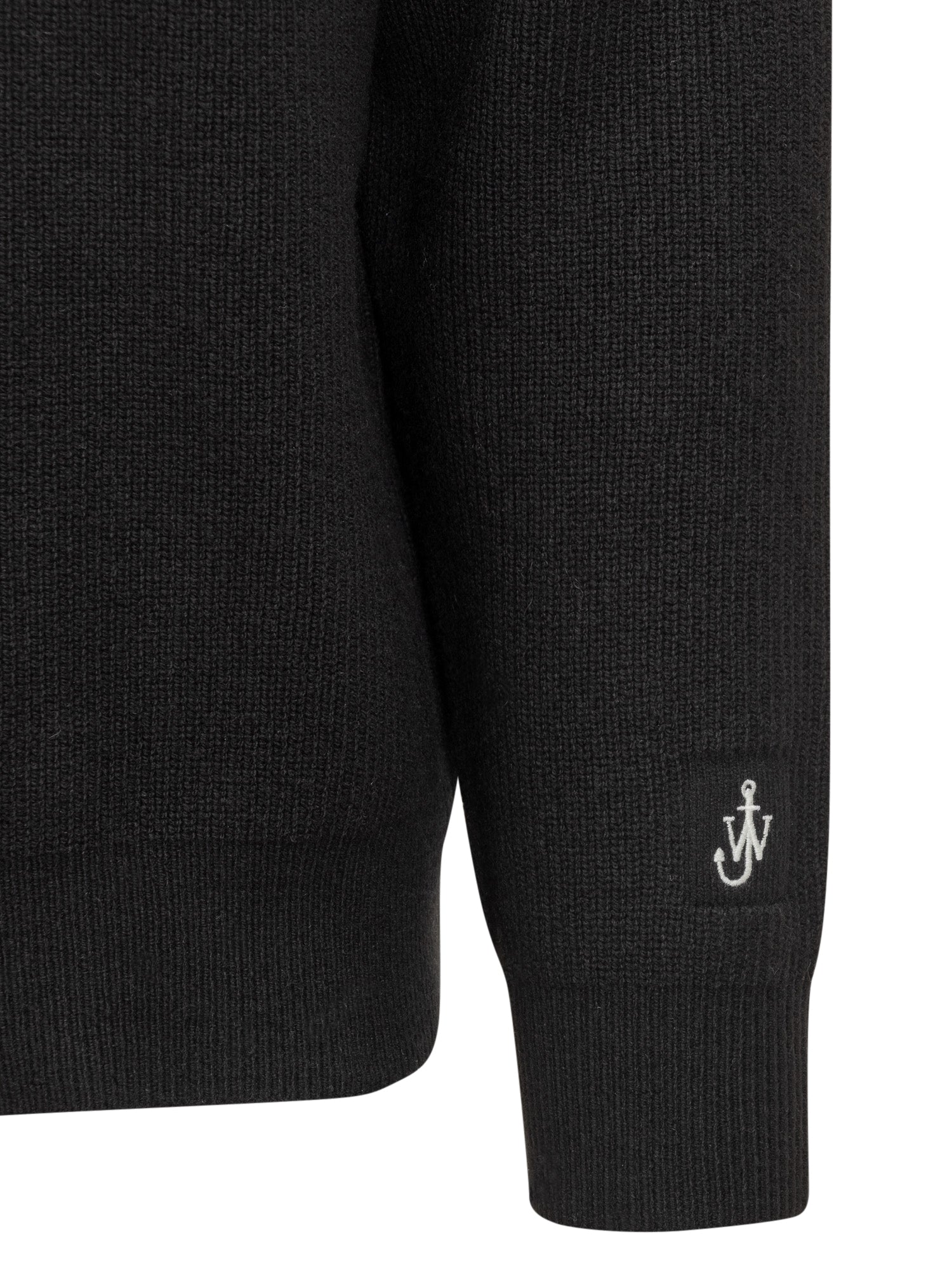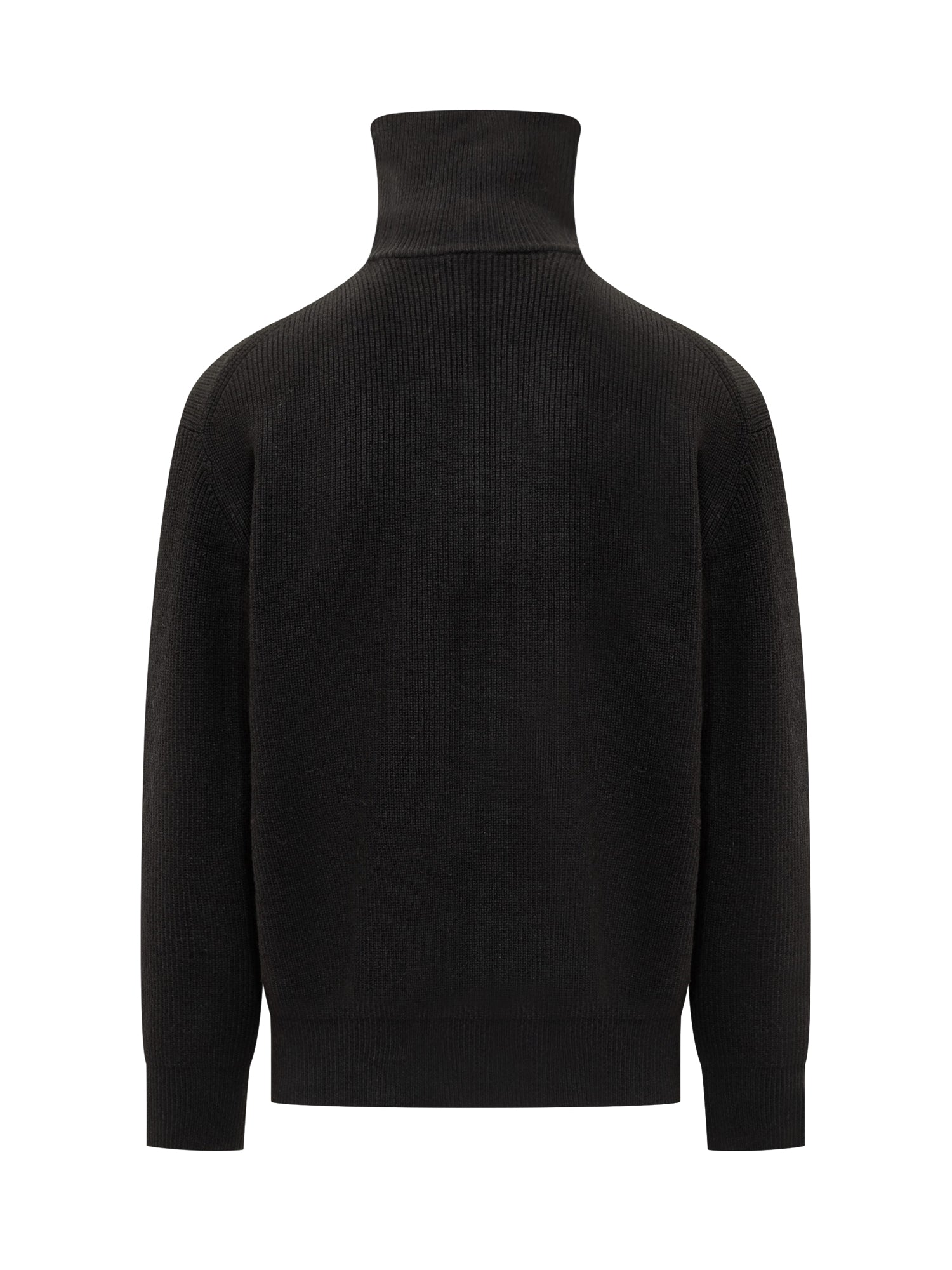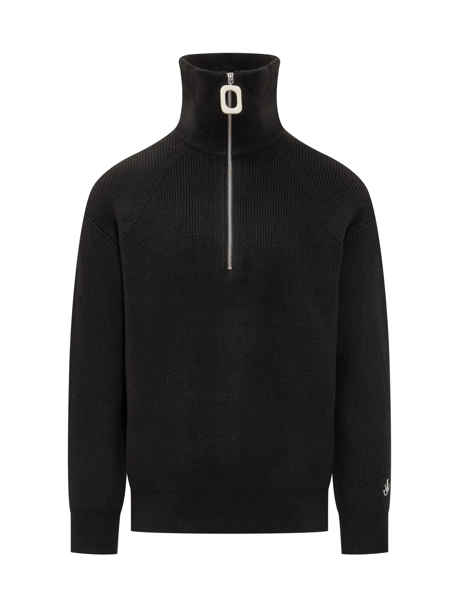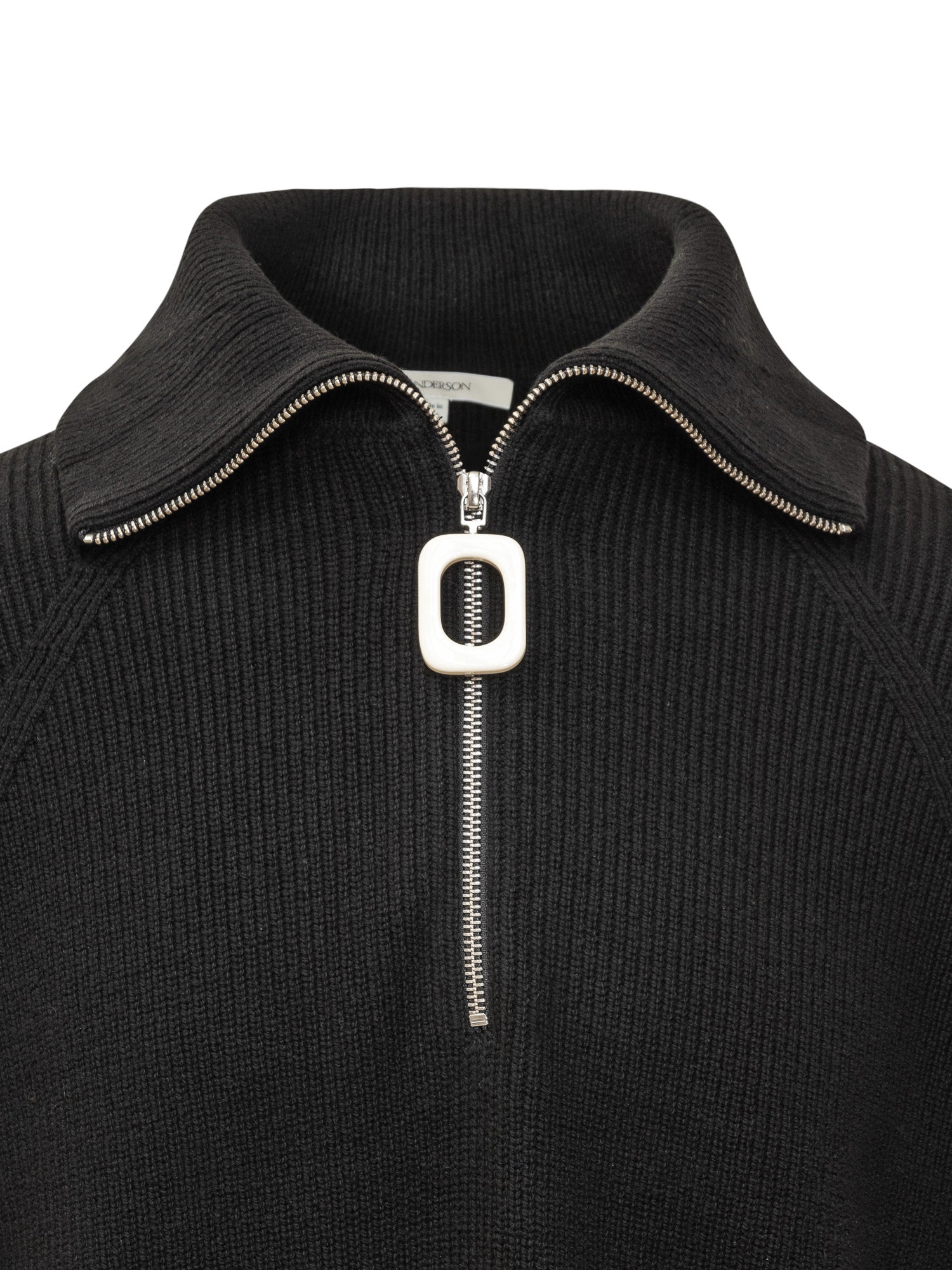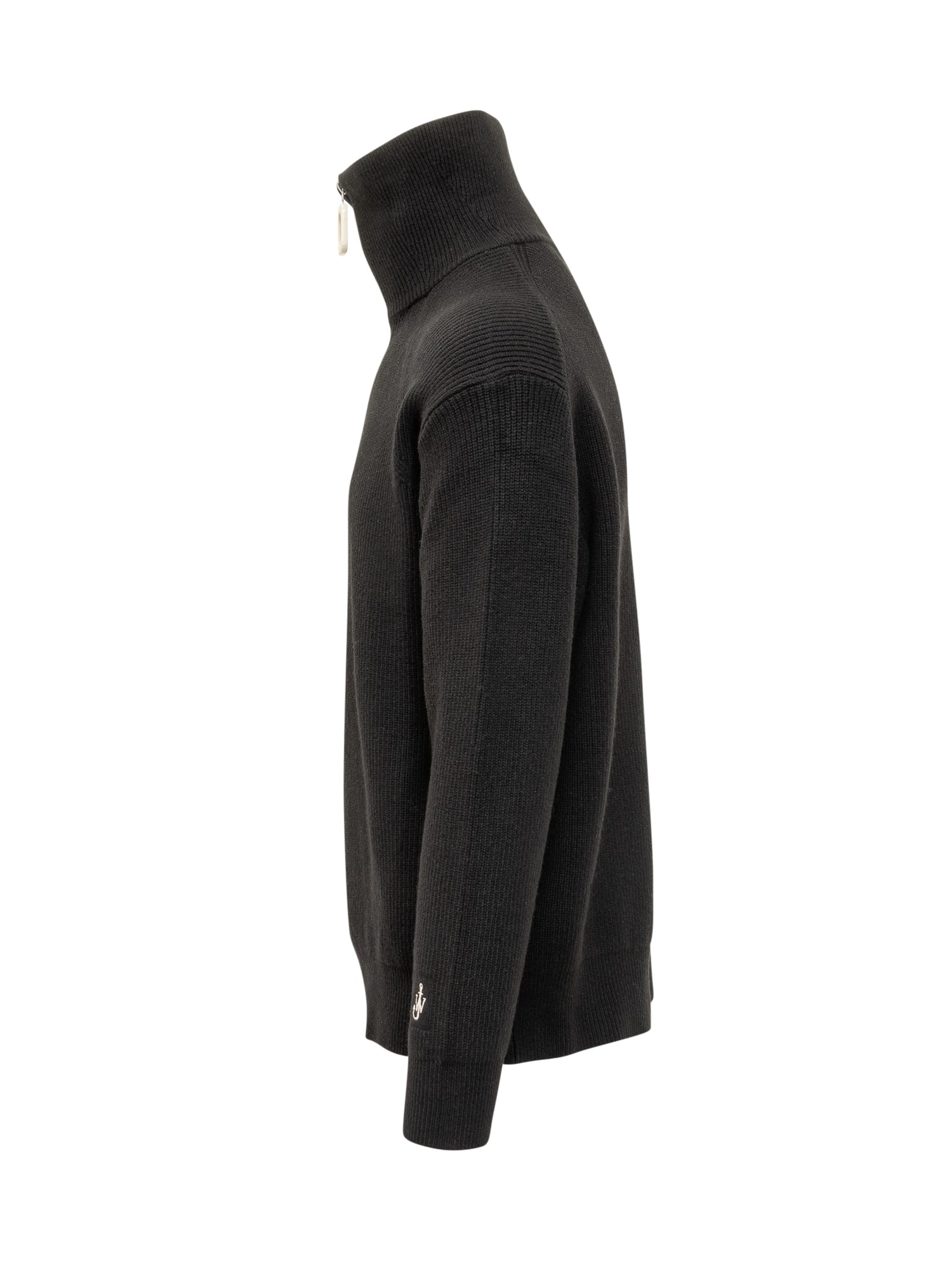 Maglione half-zip in lana nera con lavorazione a coste. Collo alto con zip e dettaglio in metallo, logo ricamato sul polsino.