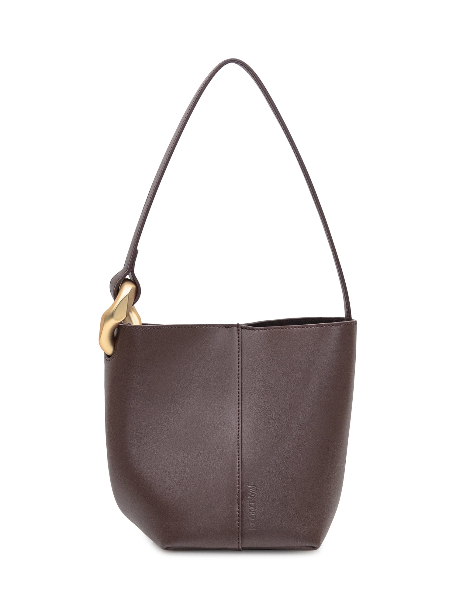 La small Bucket di JW Anderson è realizzata in morbida pelle liscia color cioccolato fondente. Il design pulito è valorizzato da una silhouette strutturata e da un manico singolo rigido, arricchito da un dettaglio scultoreo in metallo dorato opaco.