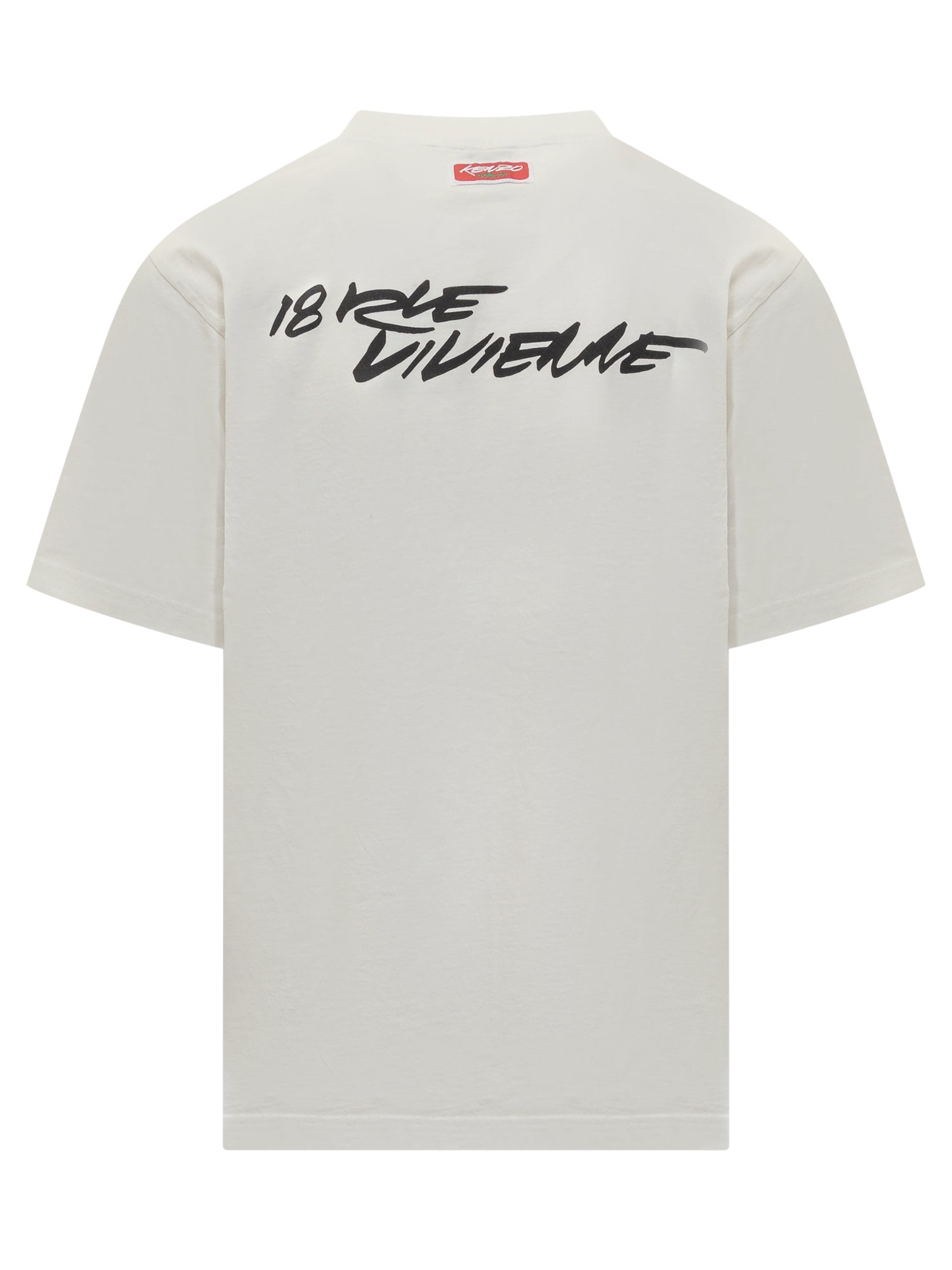 T-shirt bianca Kenzo in cotone con maxi stampa floreale colorata e logo grafico sul fronte.