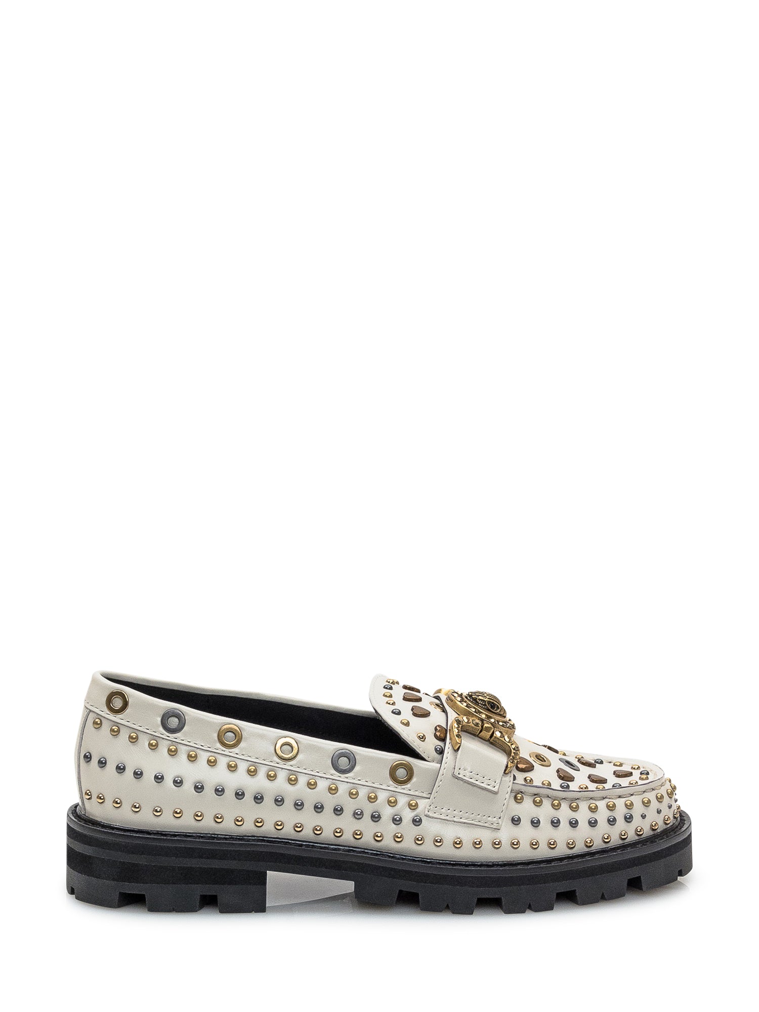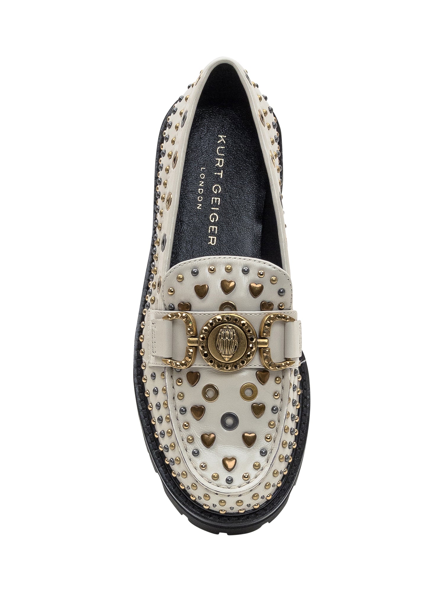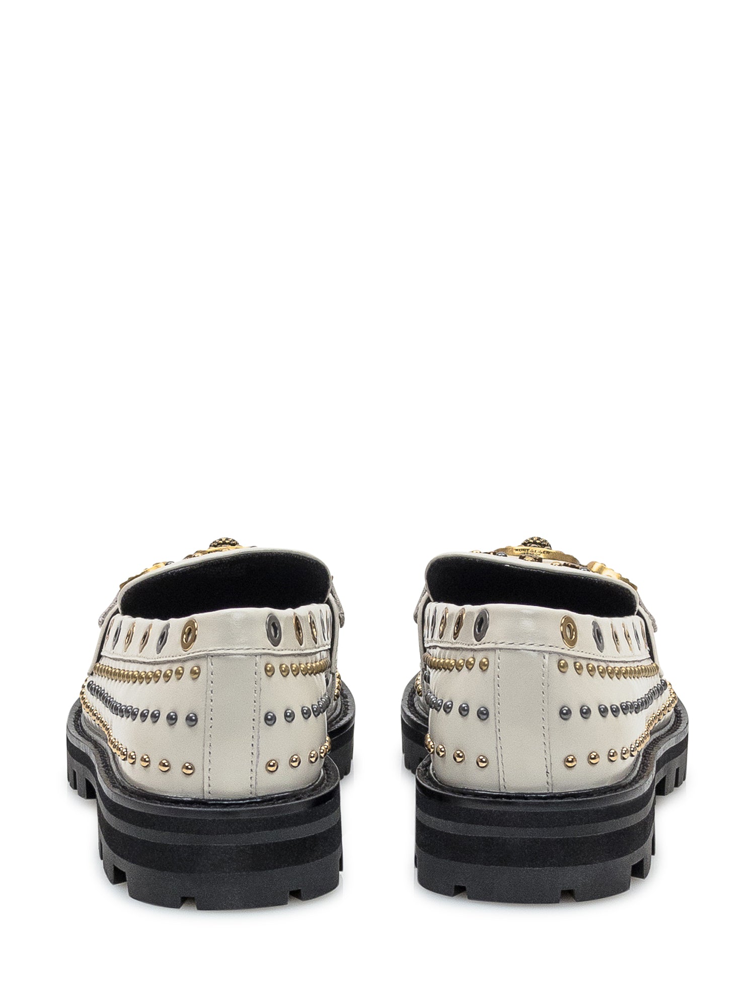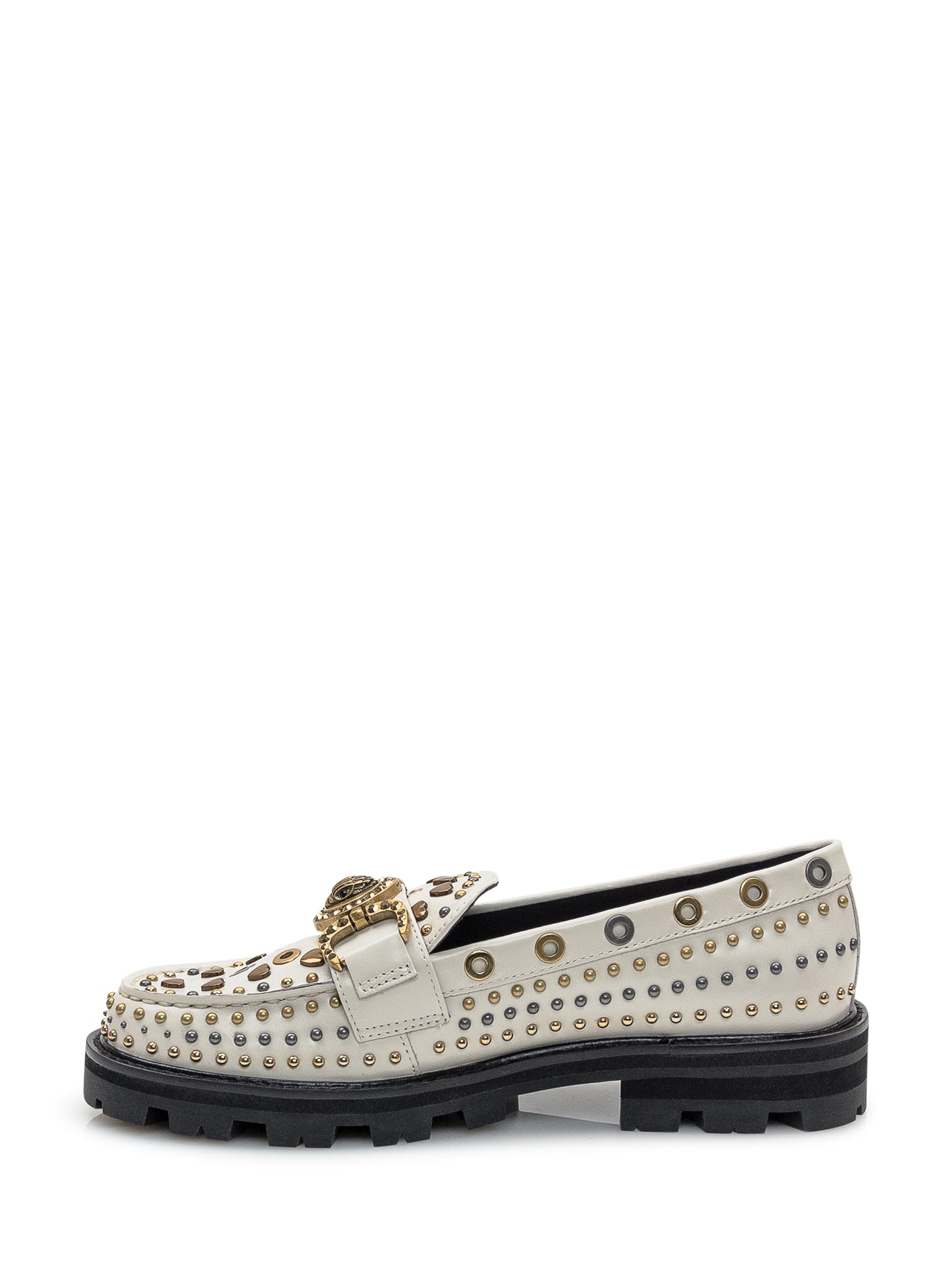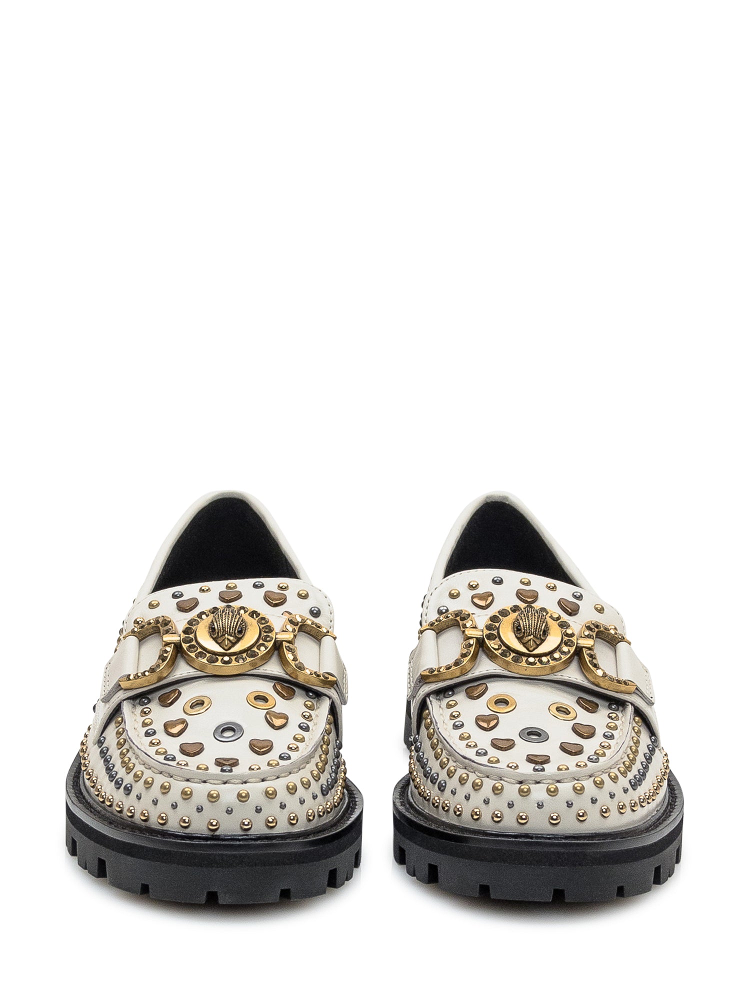 Mocassino Kurt Geiger in pelle bianca con suola chunky, borchie dorate e argentate e fibbia gioiello.