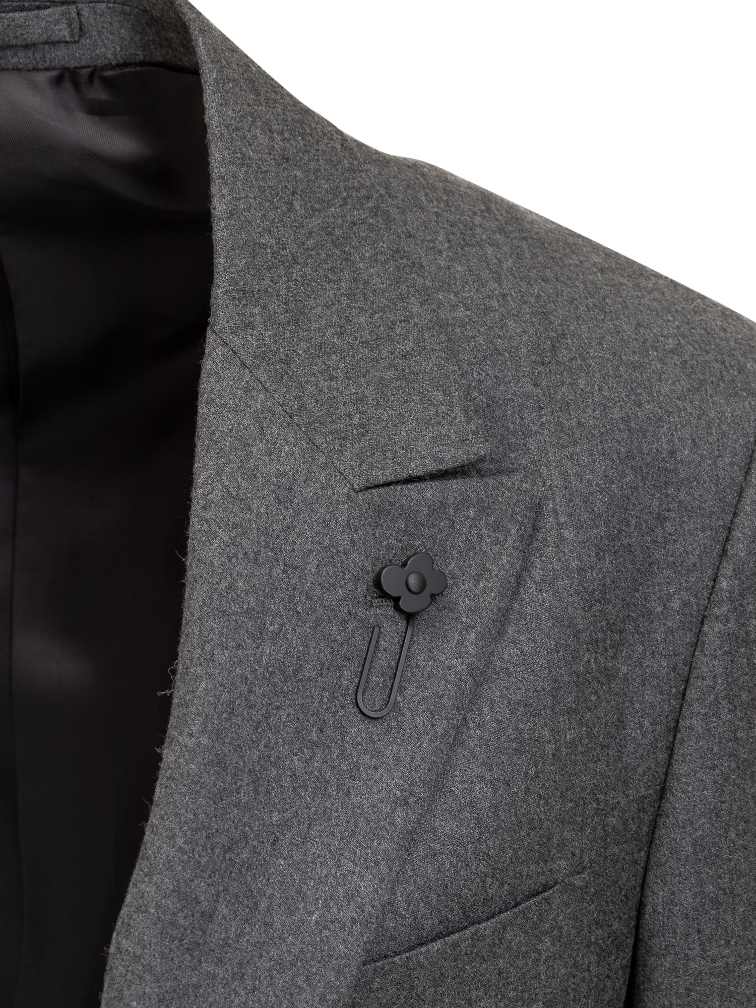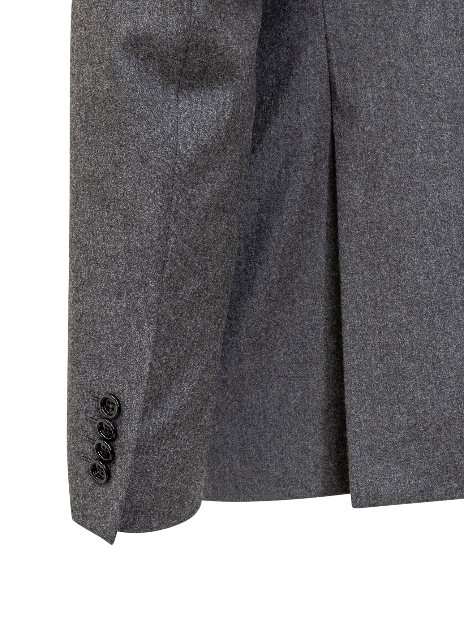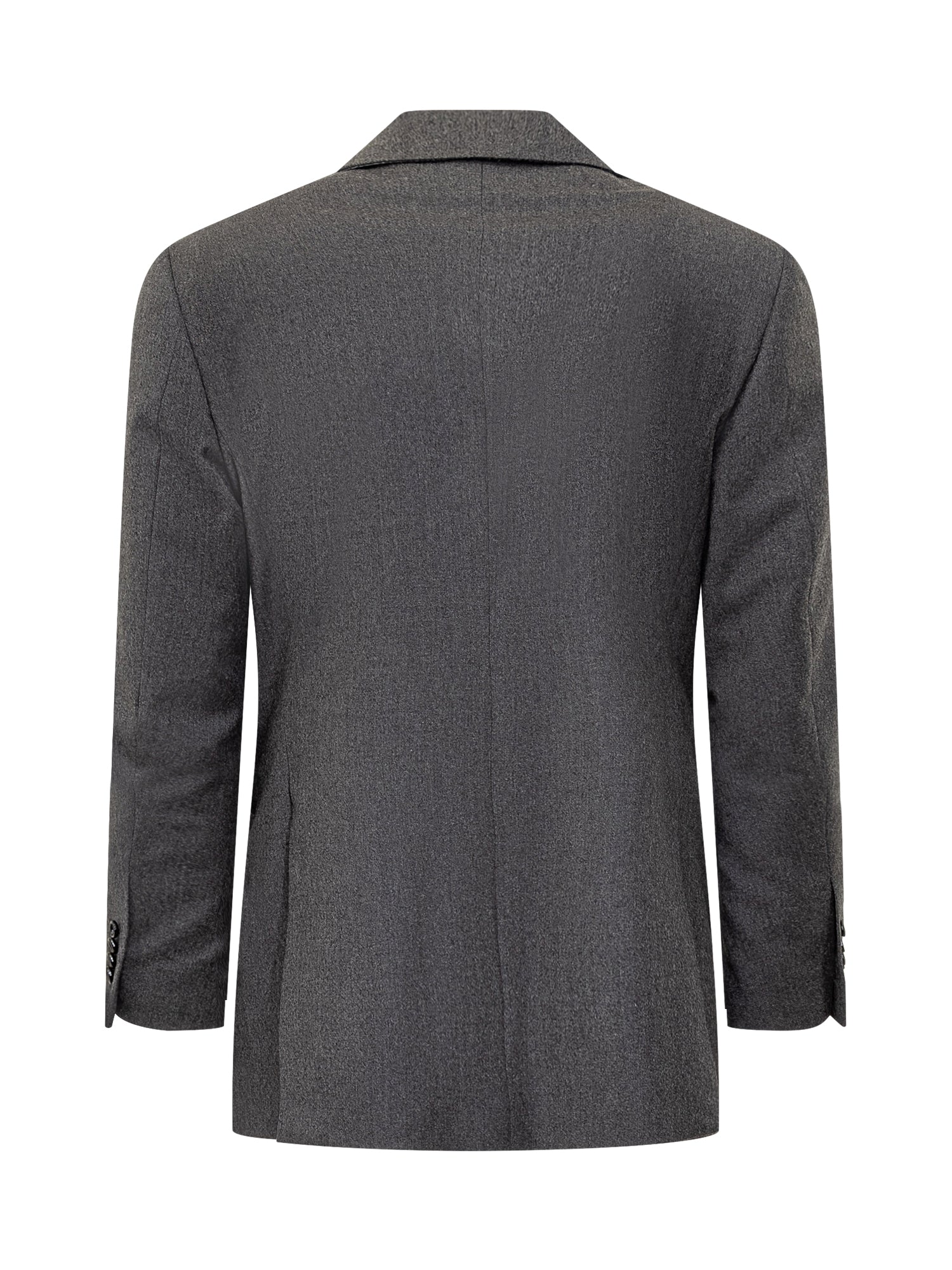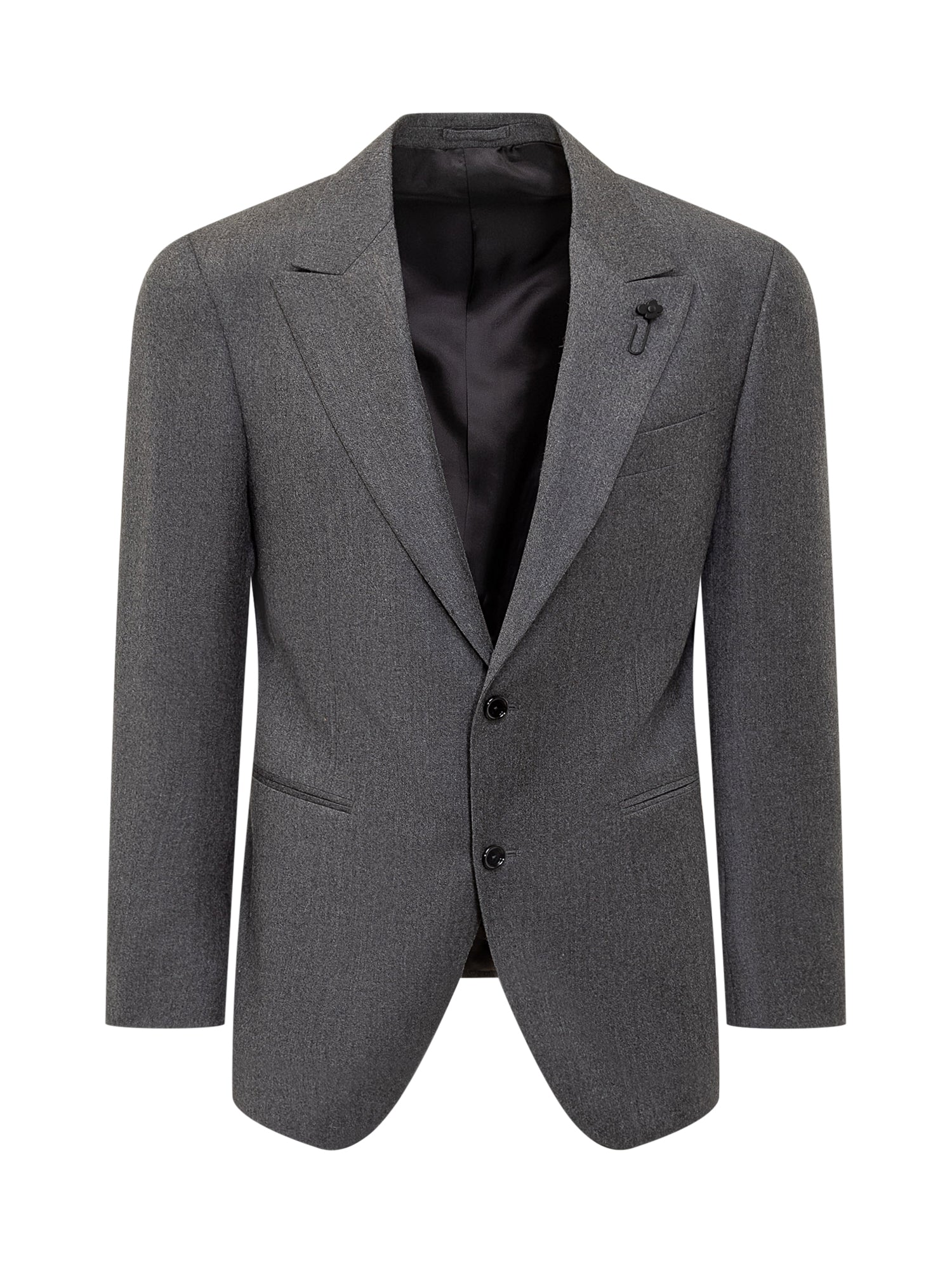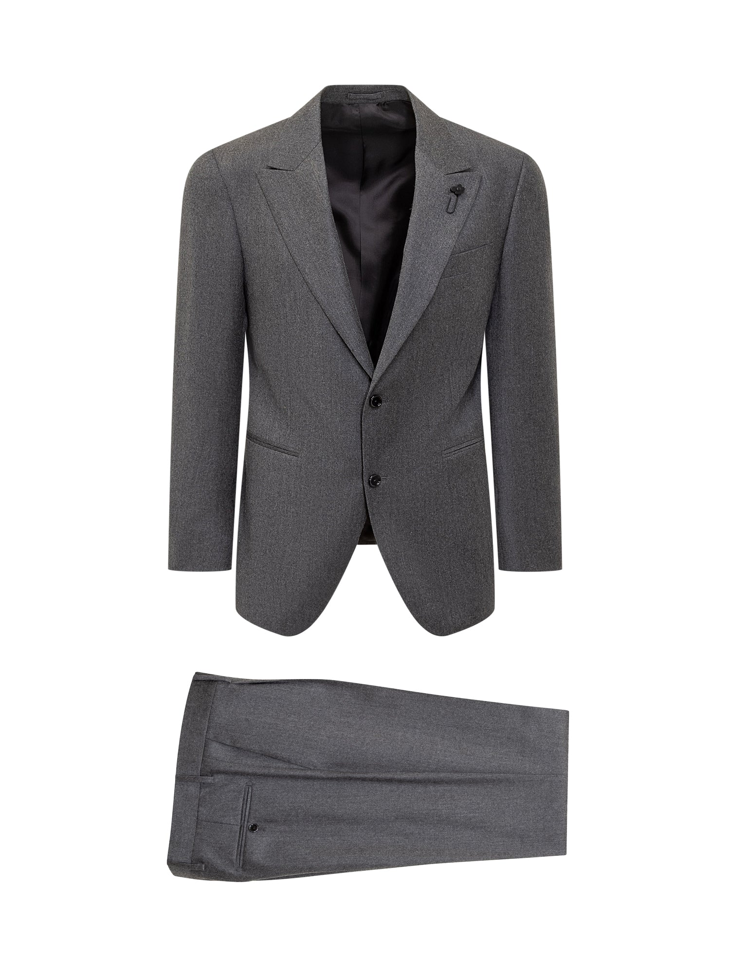 Completo due pezzi. Giacca a maniche lunghe in misto lana. Collo revers. Chiusura monopetto con bottoni. Polsini con bottoni. Due tasche sul davanti. Taschino sul petto. Spacchi sul retro. Pantalone con chiusura con zip, bottone e gancini. Passanti per cintura. Due tasche laterali. Due tasche a filetto sul retro.
