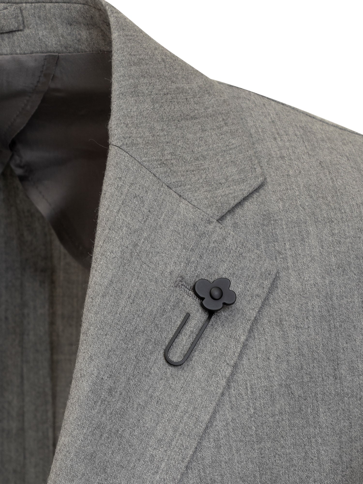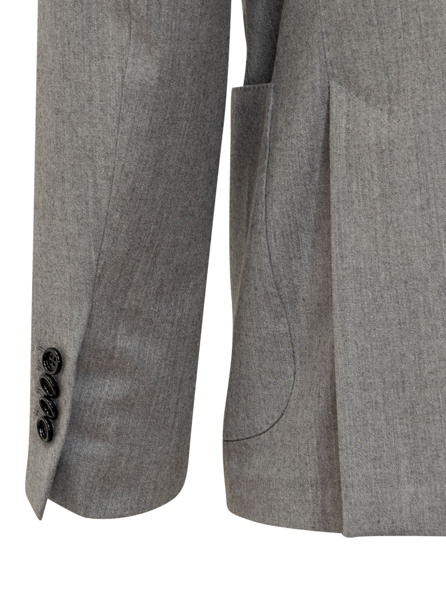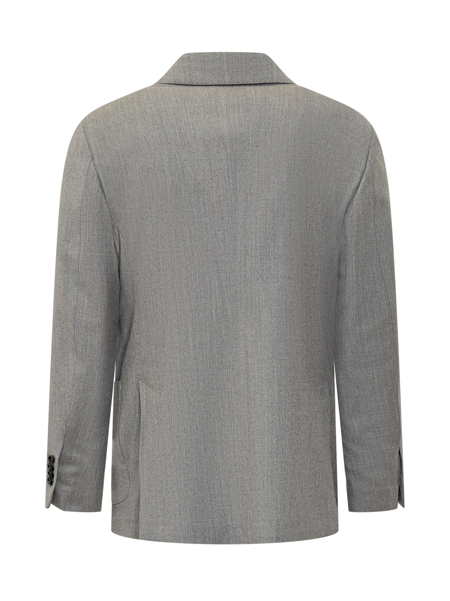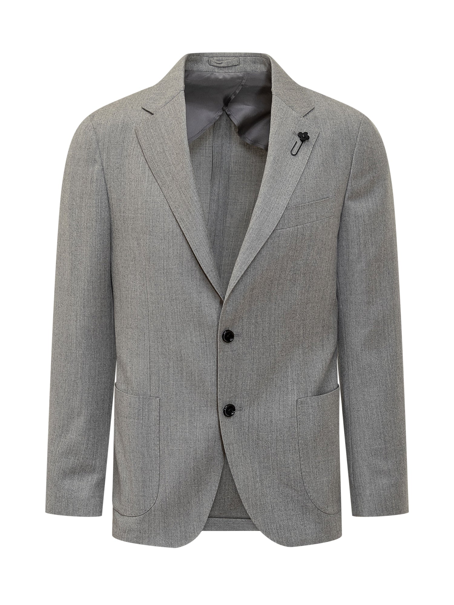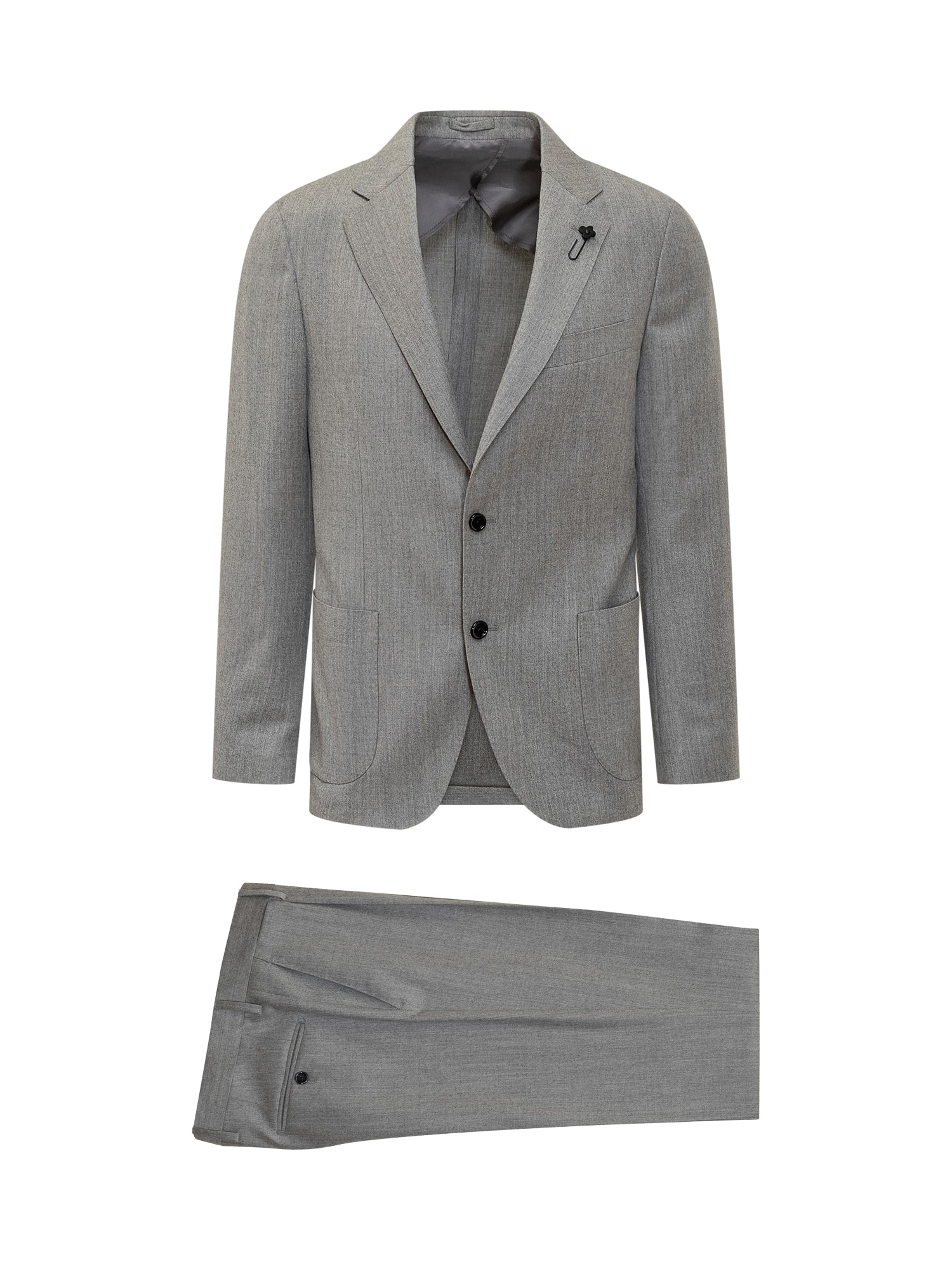 Completo due pezzi. Giacca a maniche lunghe in misto lana. Collo revers. Chiusura monopetto con bottoni. Polsini con bottoni. Due tasche sul davanti. Taschino sul petto. Spacchi sul retro. Pantalone con chiusura con bottone e zip. Passanti per cintura. Due tasche laterali. Due tasche a filetto sul retro.