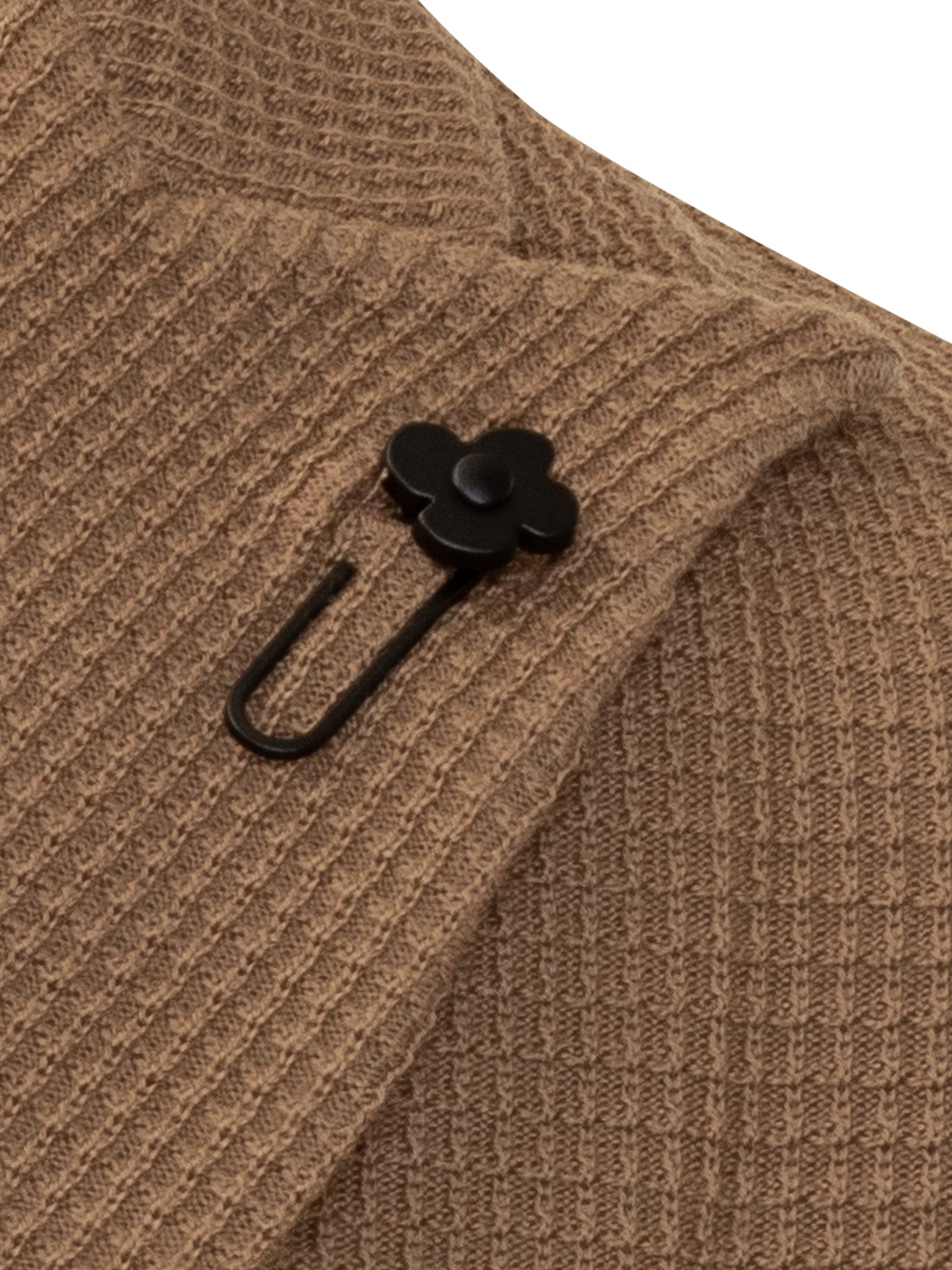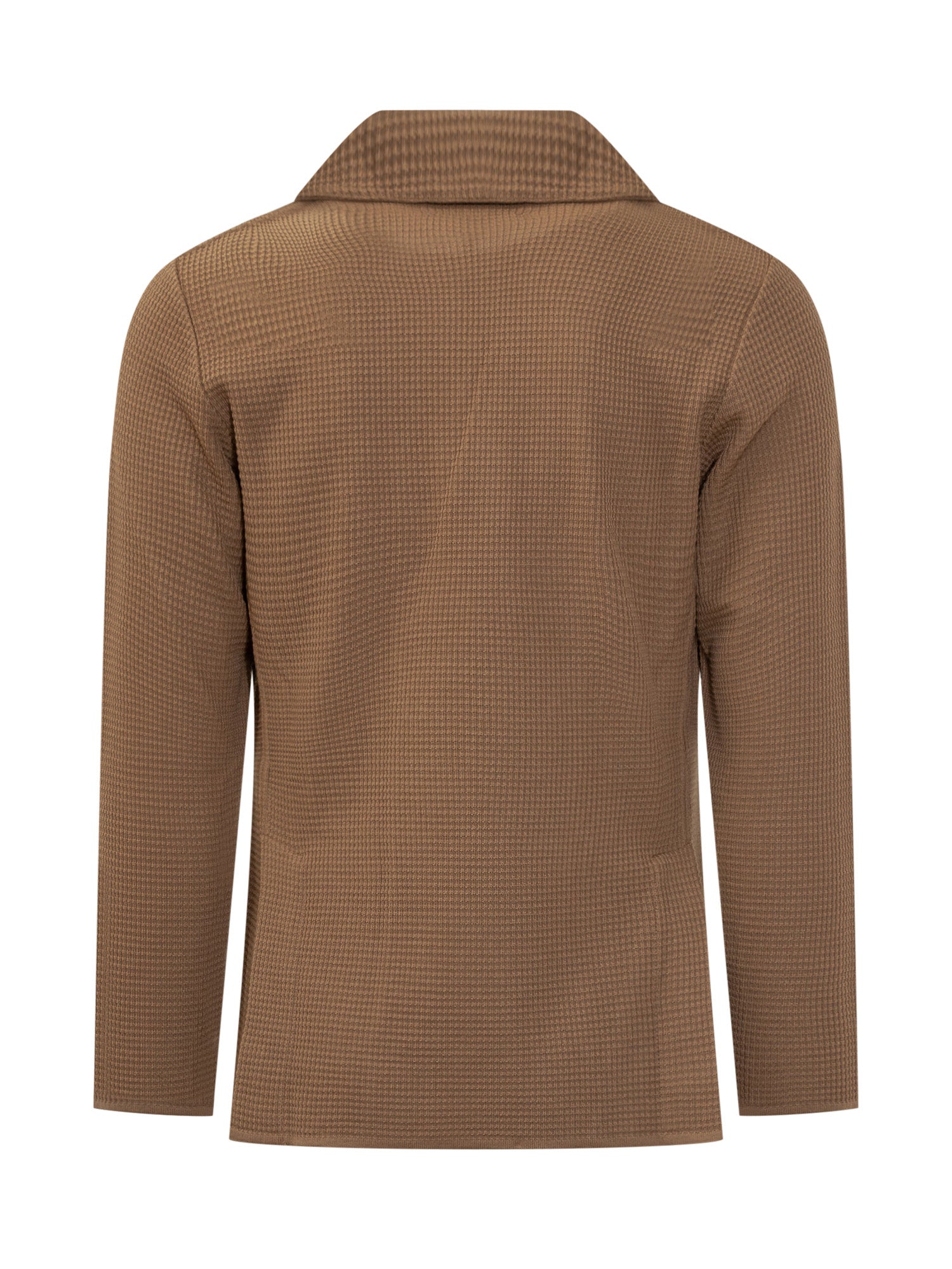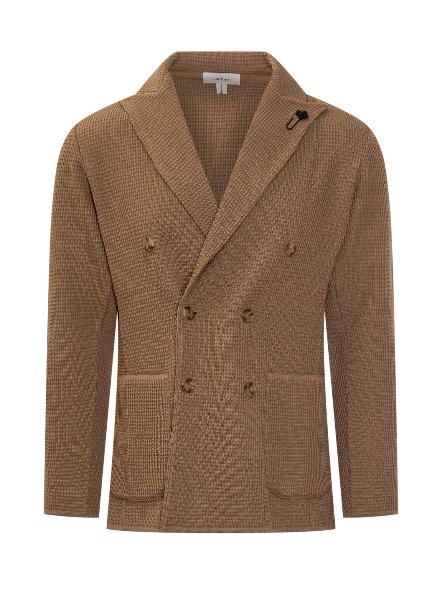 Giacca in maglia Lardini doppiopetto color cammello con lavorazione micro pied-de-poule.
