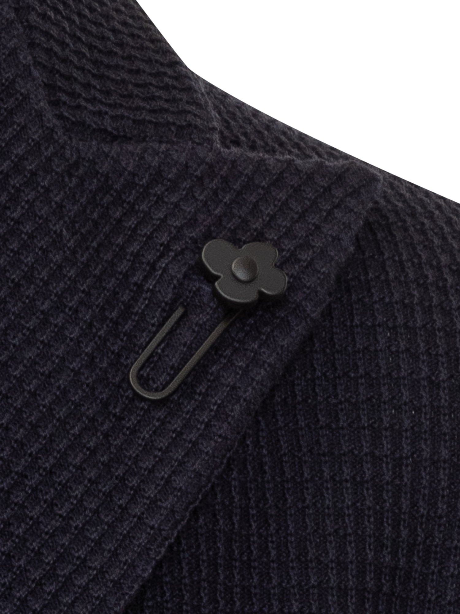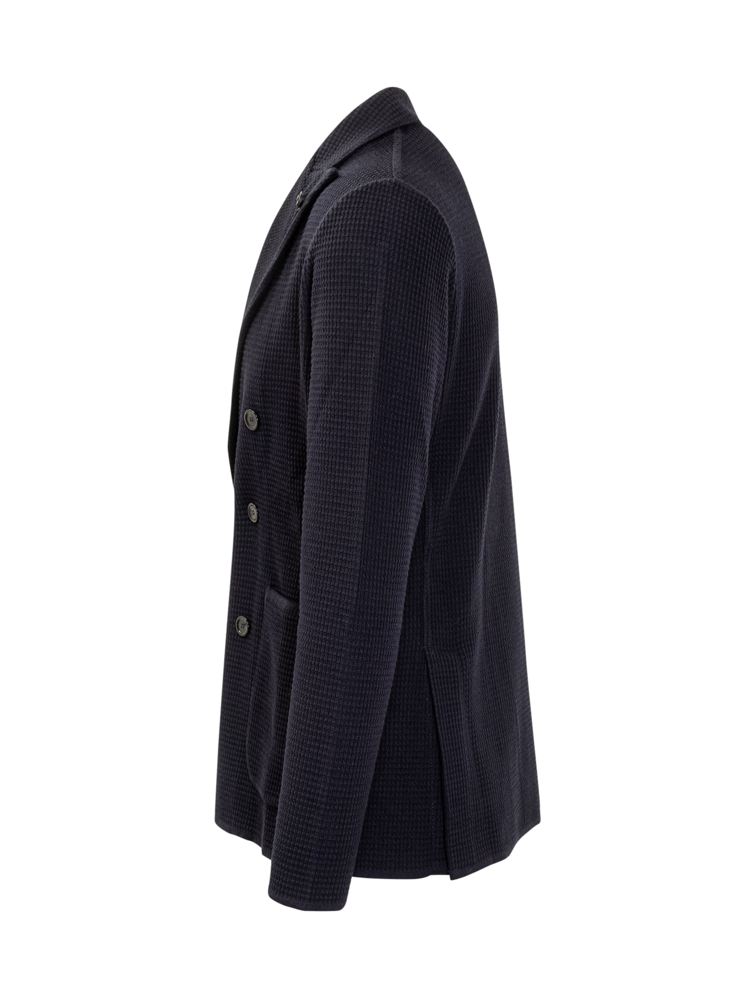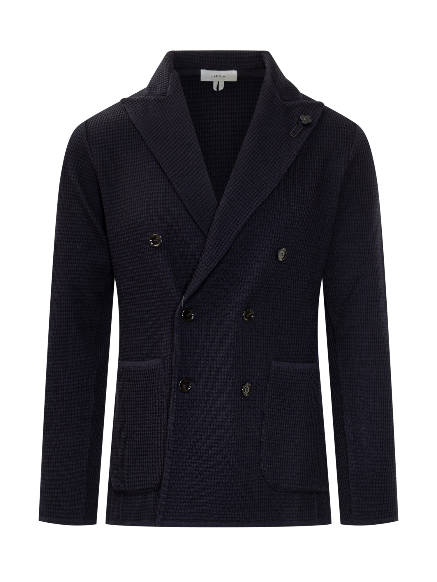 Giacca in maglia Lardini doppiopetto blu con motivo micro pied-de-poule.