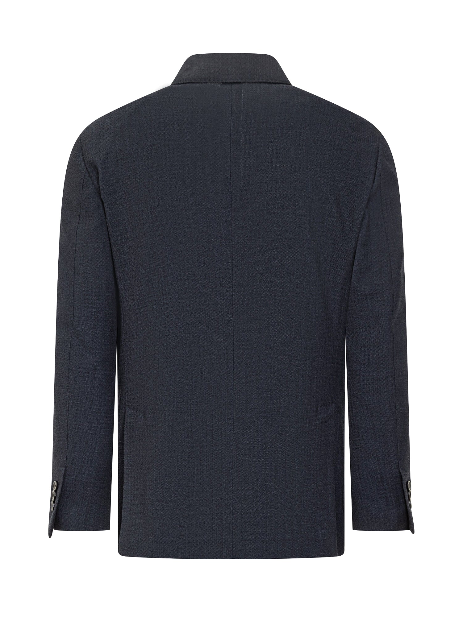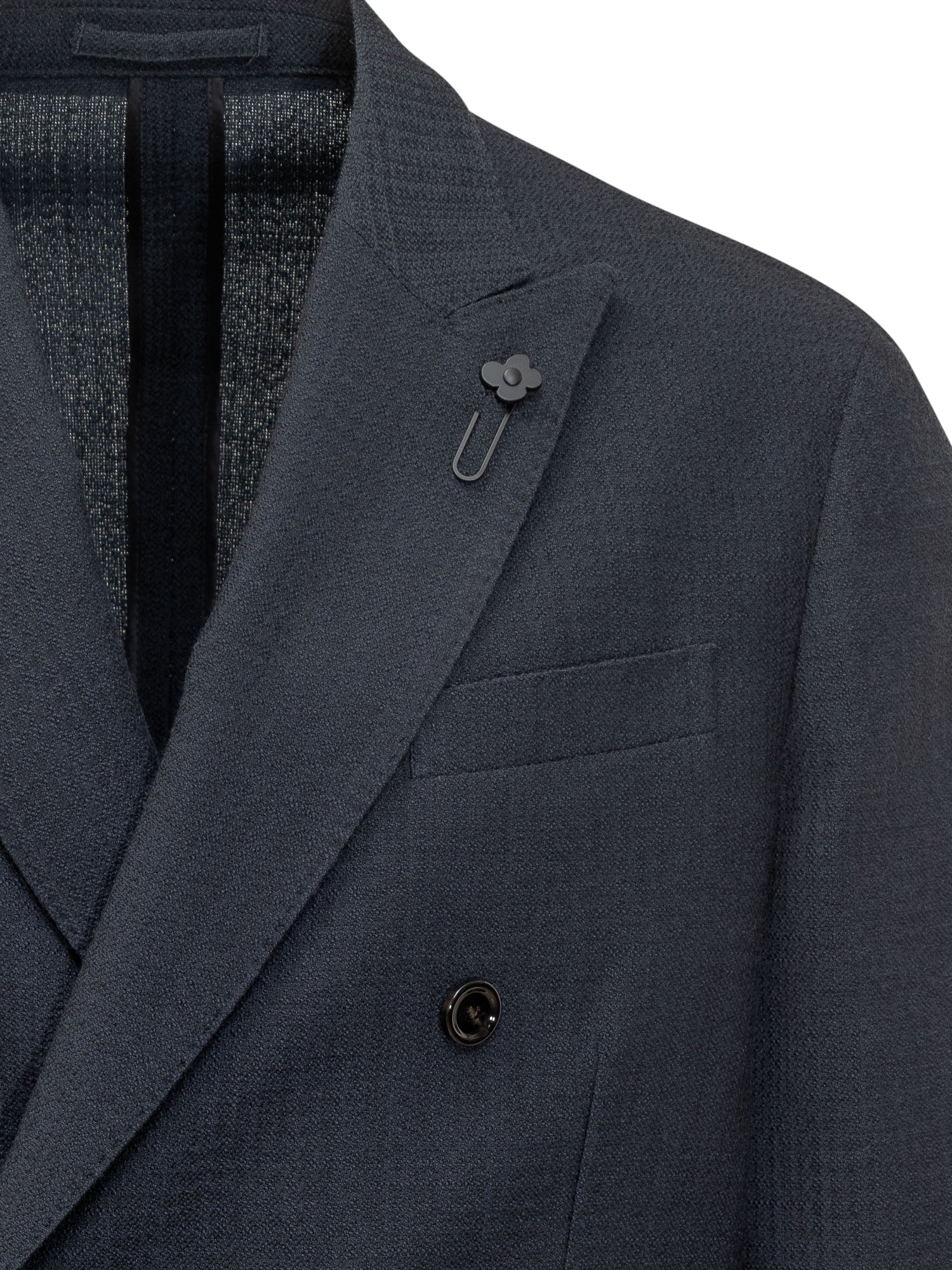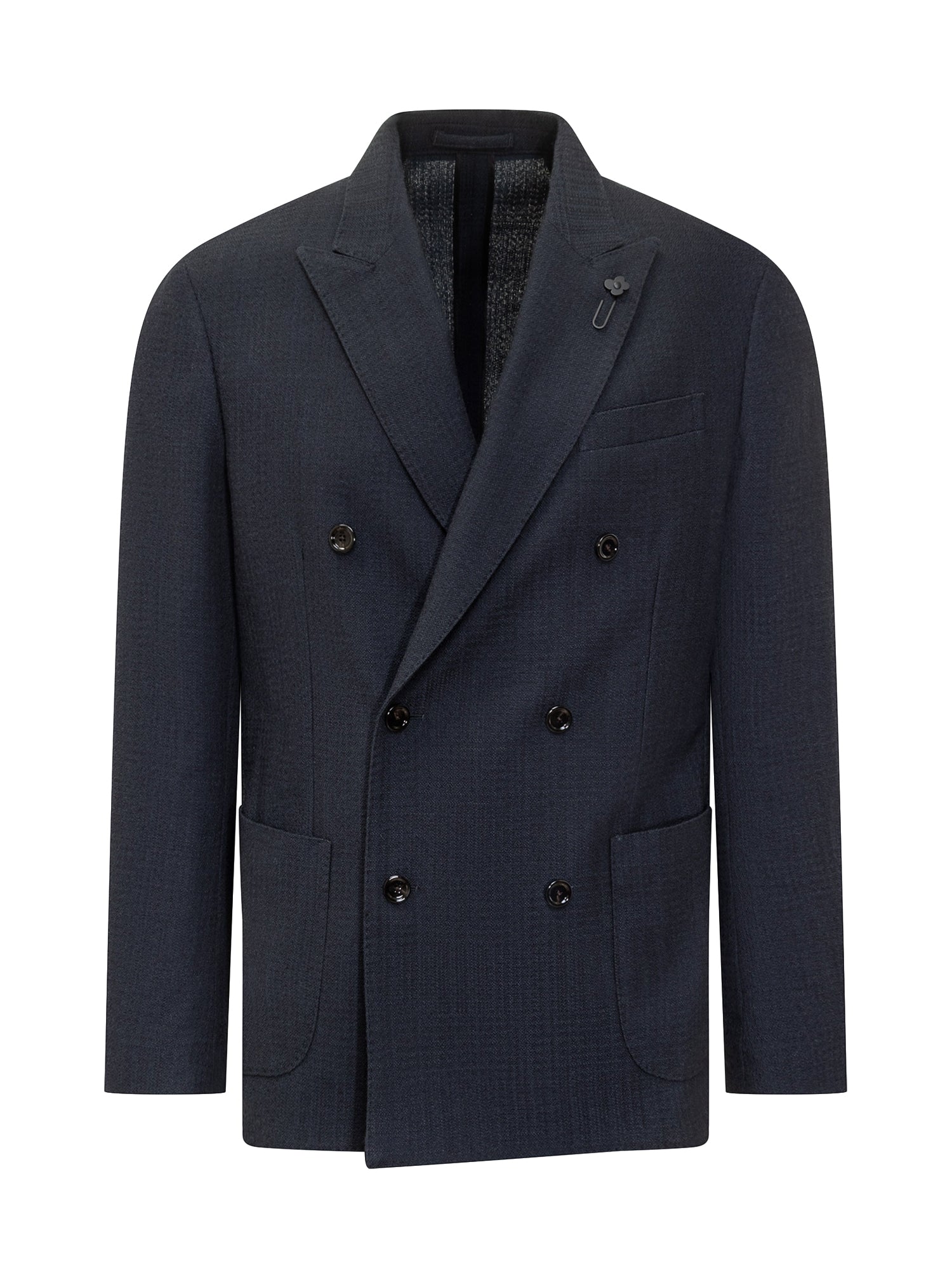 Blazer Lardini doppiopetto in lana blu con texture raffinata. Linea sartoriale con revers classico, tasche applicate e chiusura a doppiopetto.