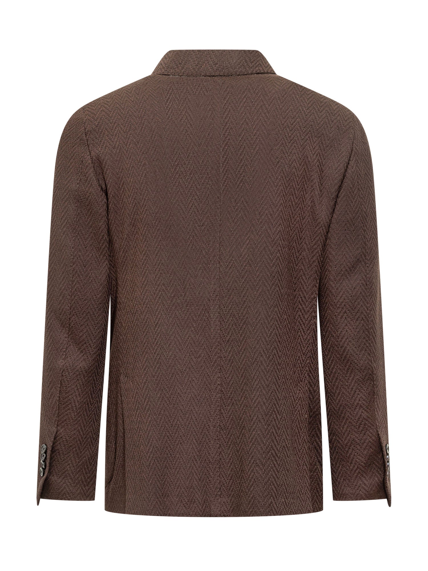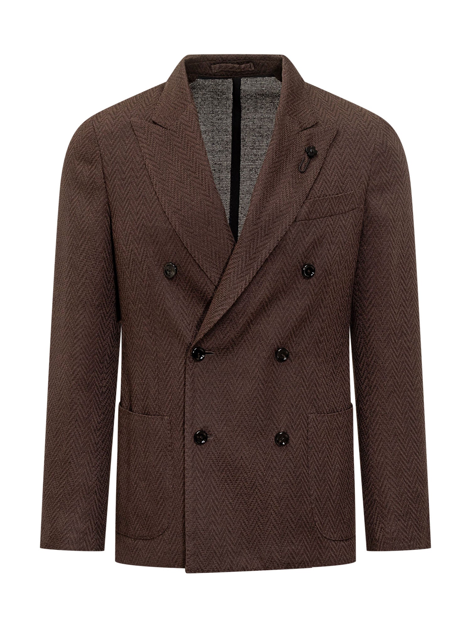 Blazer Lardini doppiopetto in lana marrone con motivo chevron. Tasche applicate e revers classico.