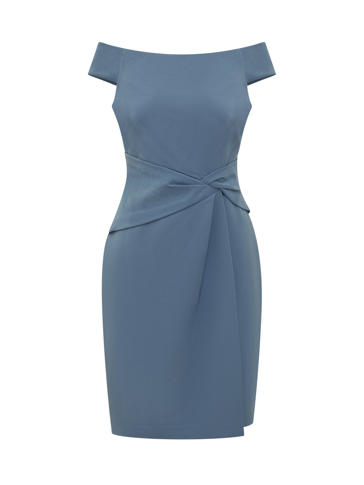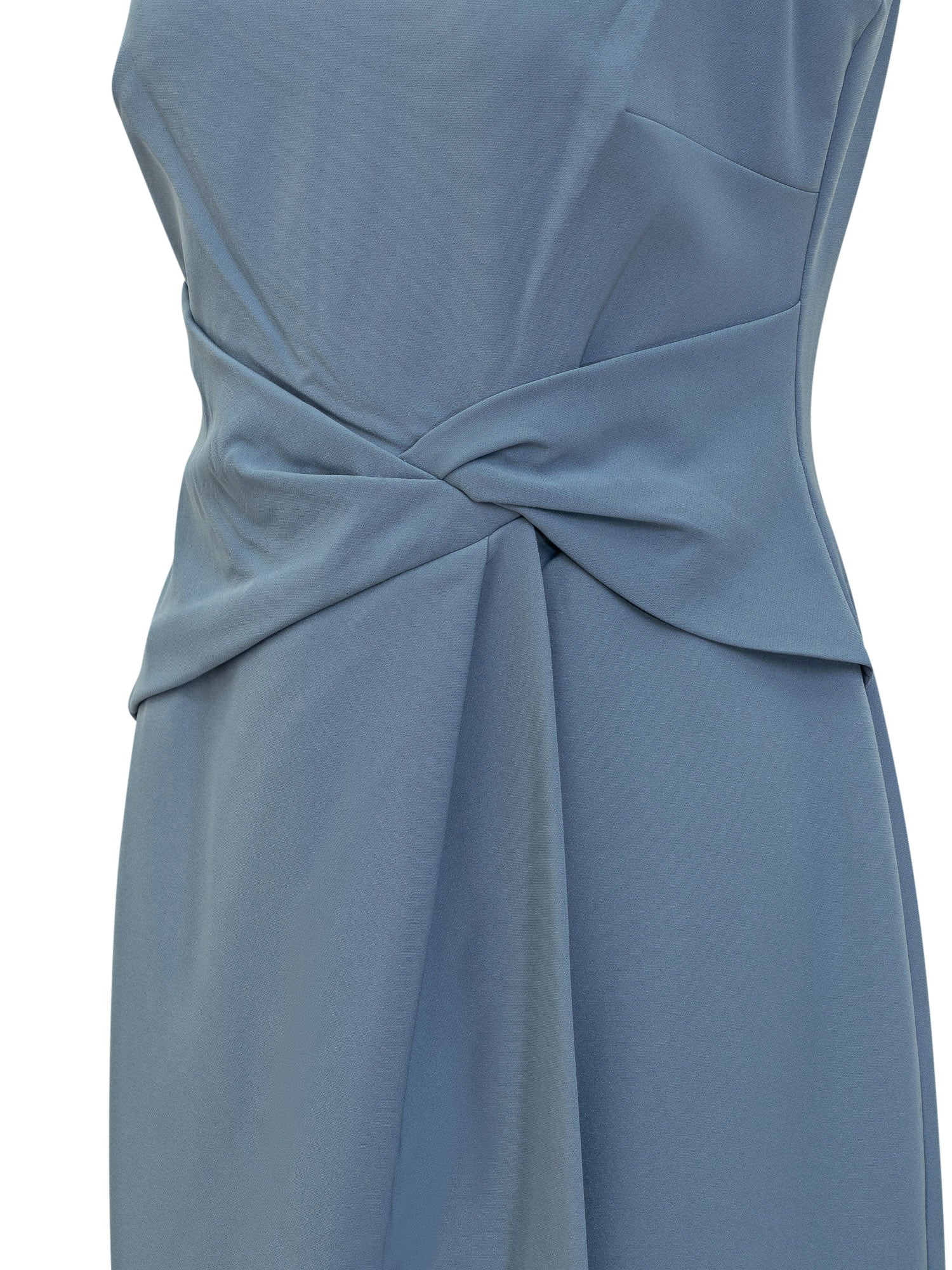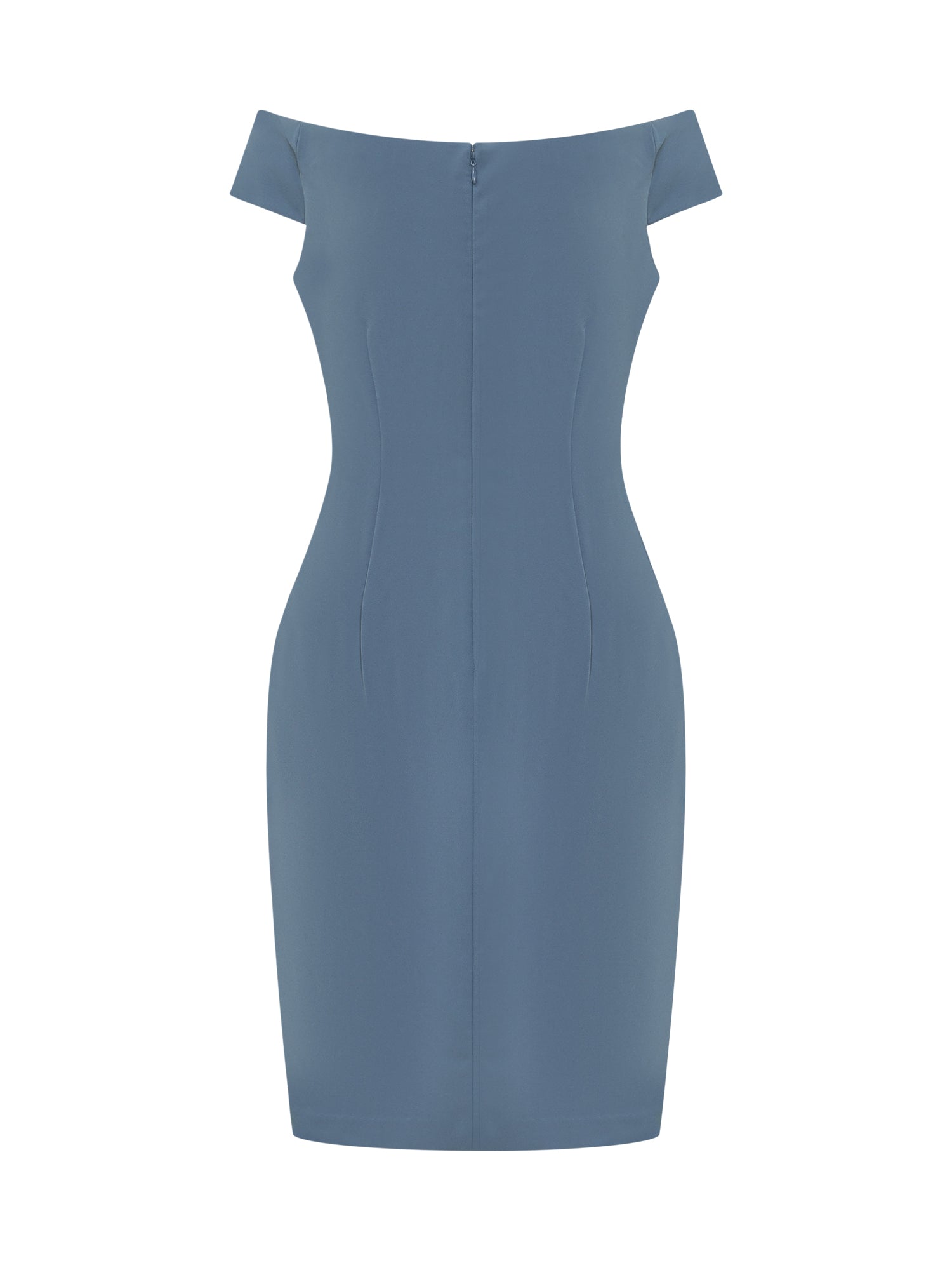 Abito corto blu. Senza maniche. Scollo a barca. Fascia intrecciata in vita. Chiusura con zip sul retro.
