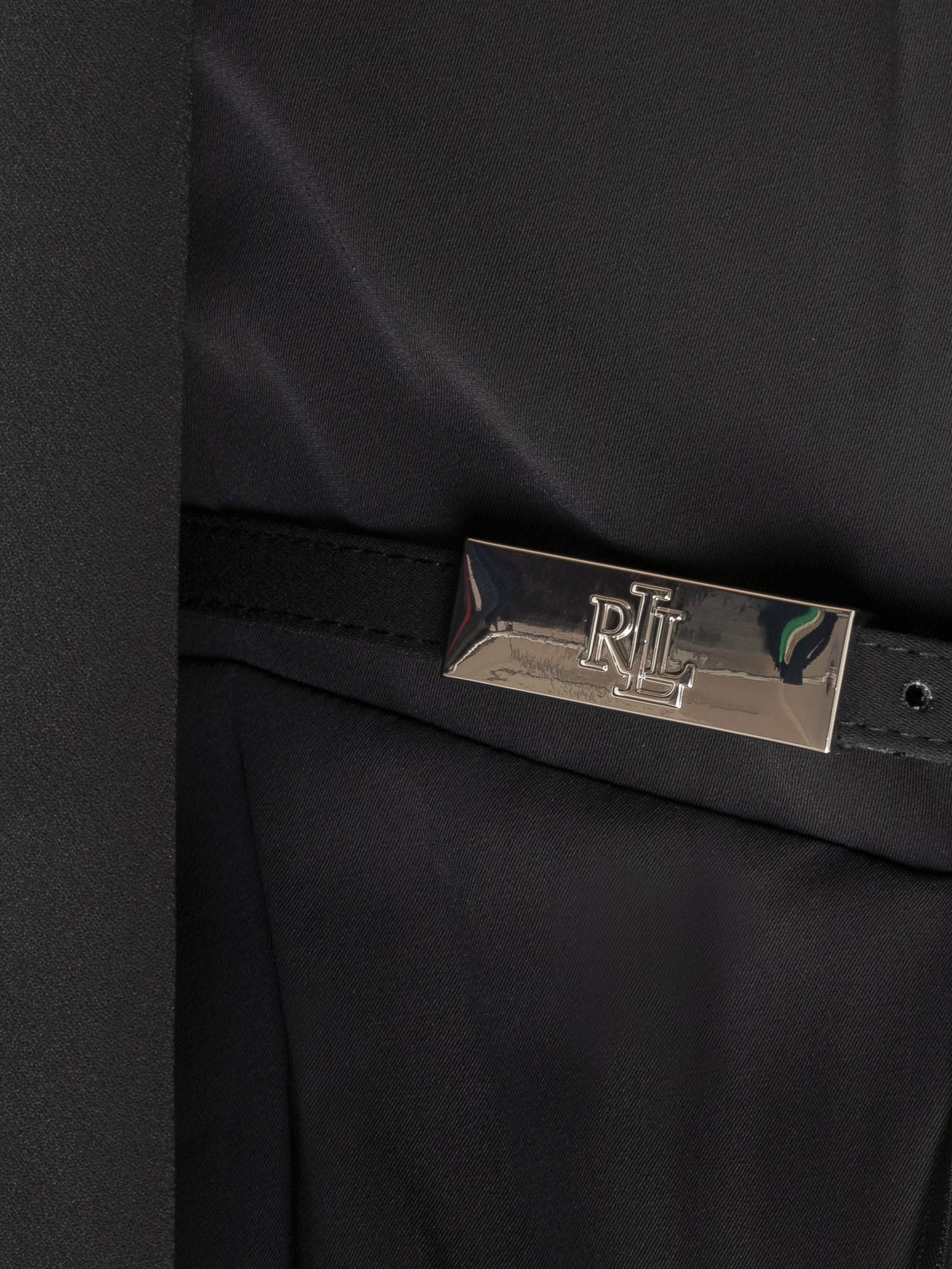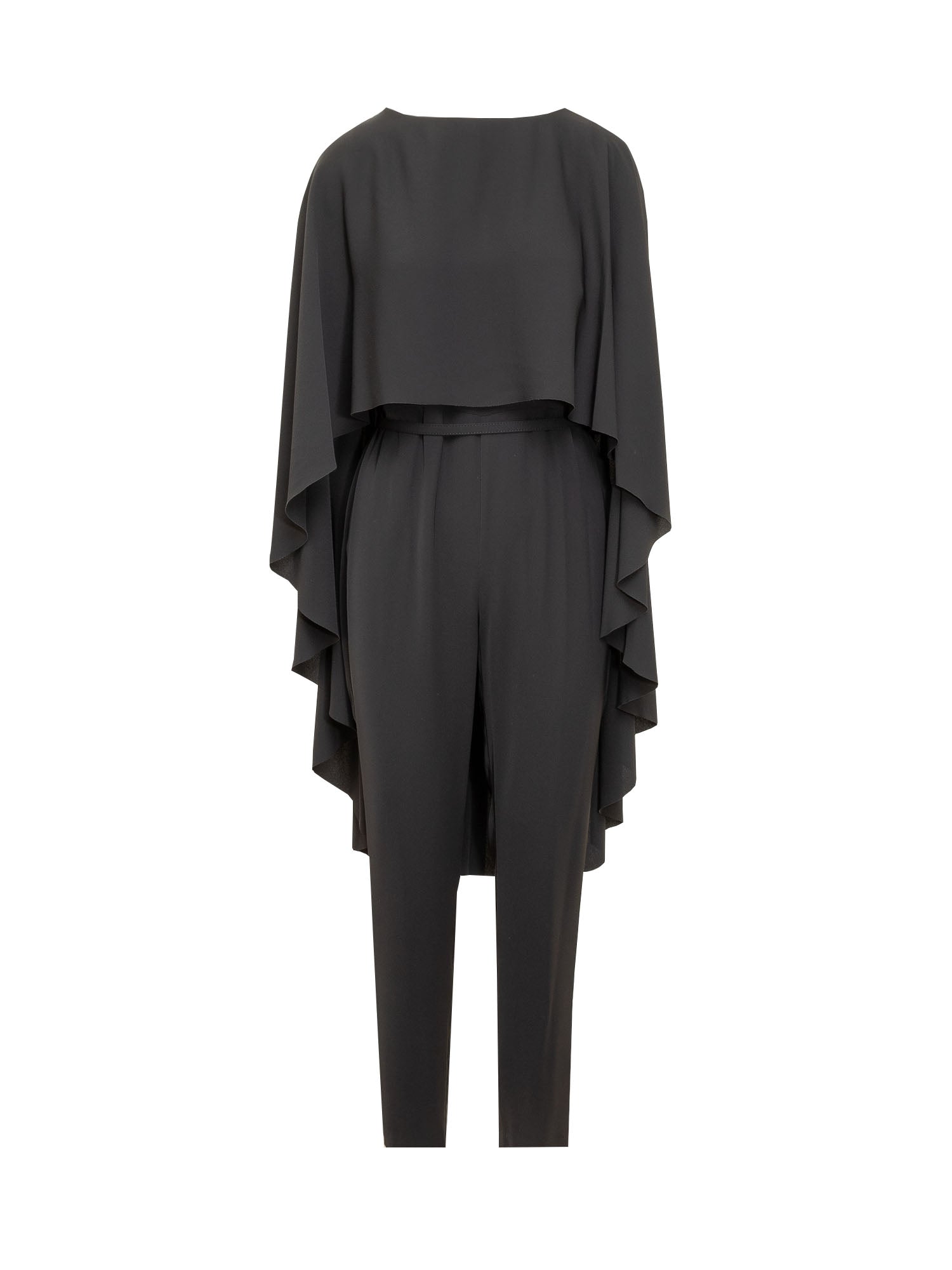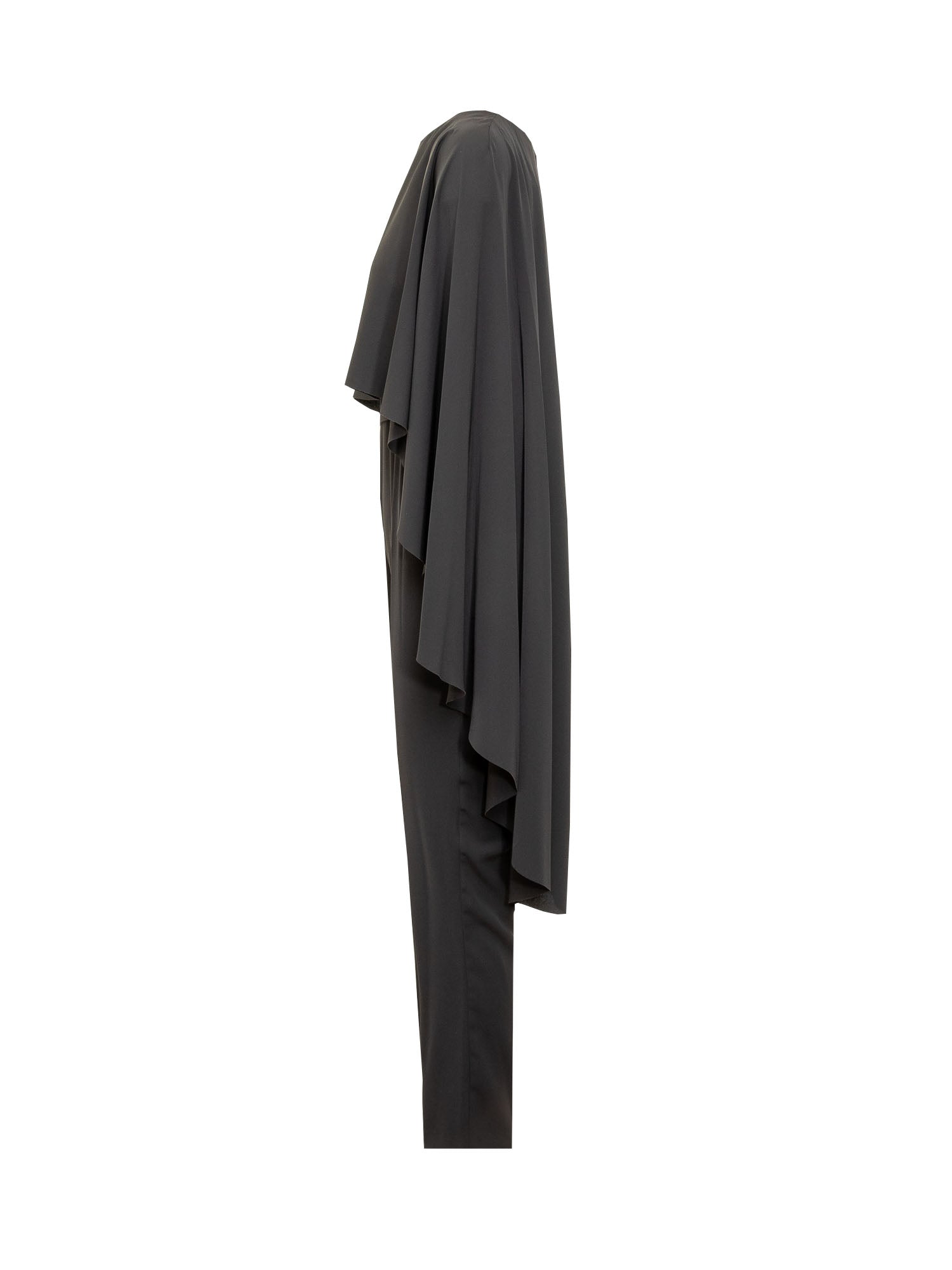 Tuta nera con mantella. Girocollo. Chiusura con zip. Cintura regolabile.