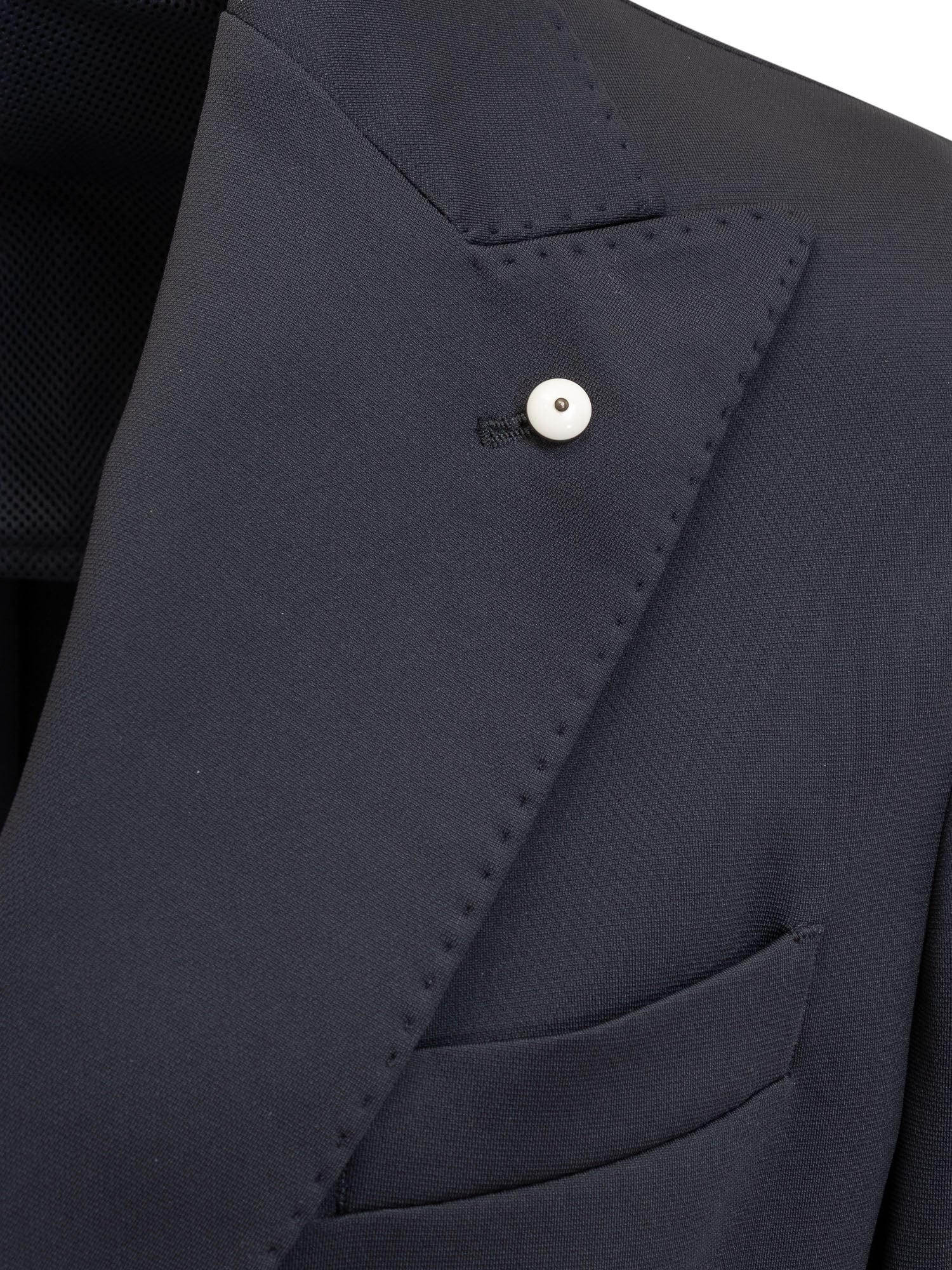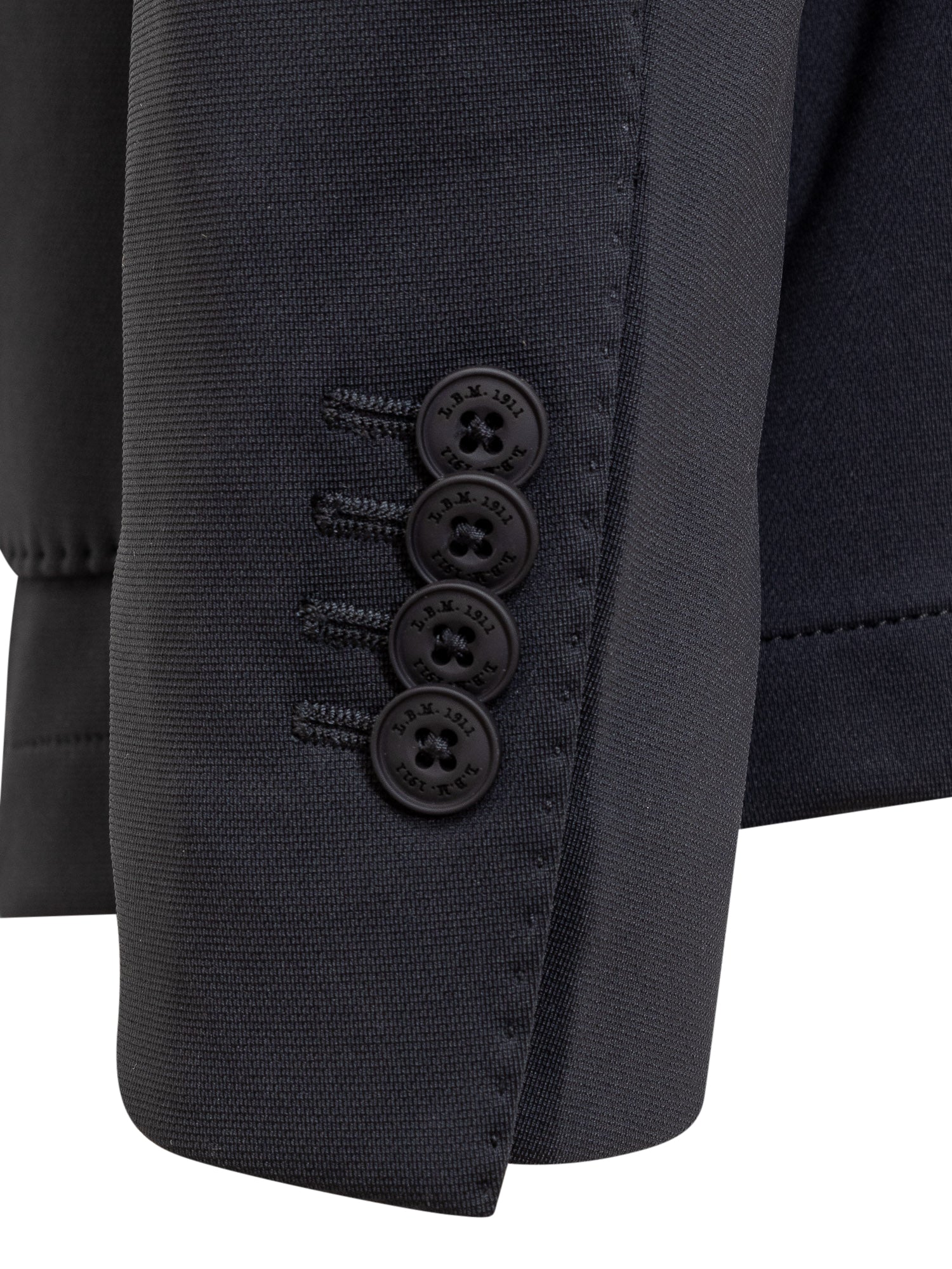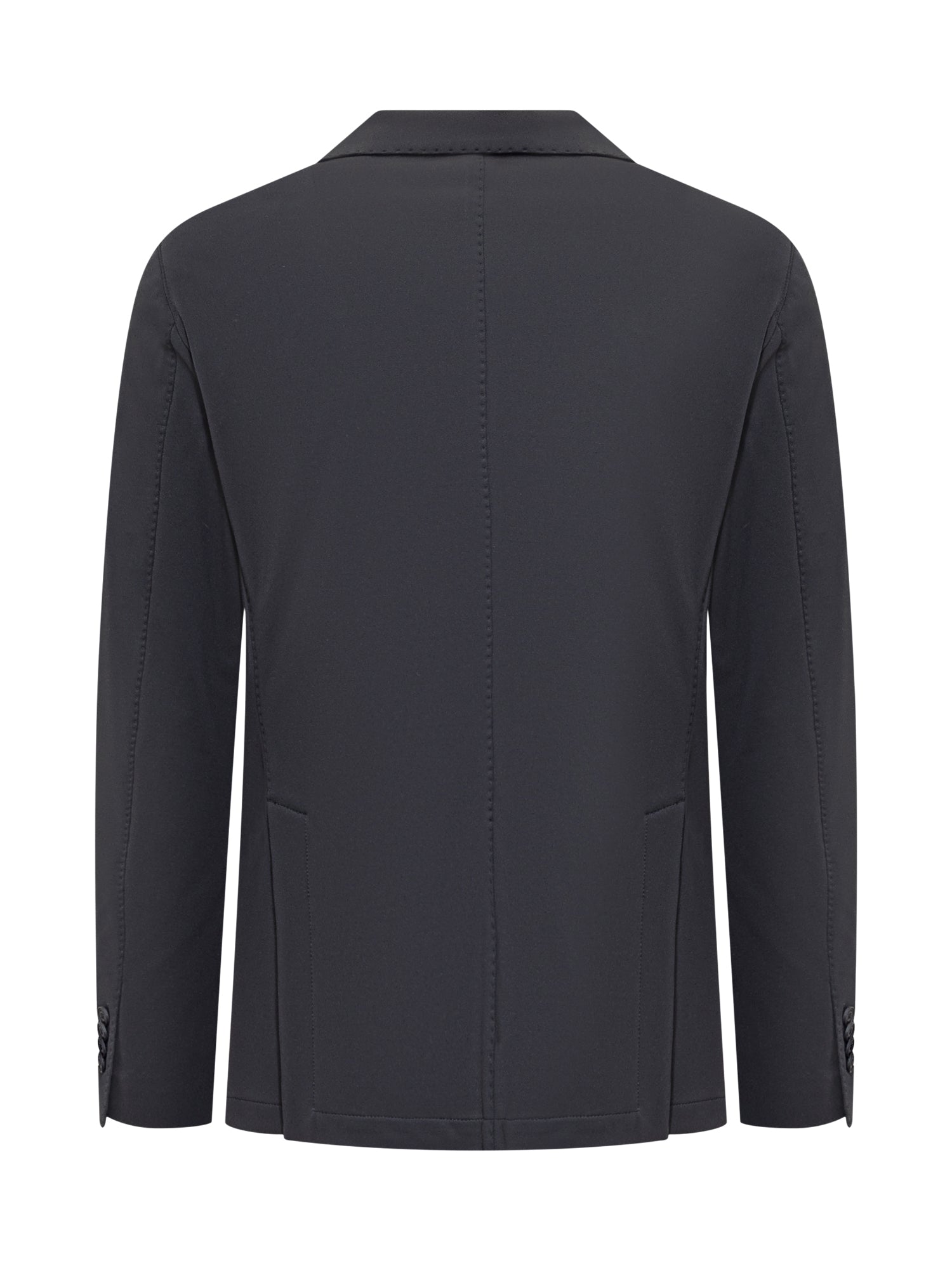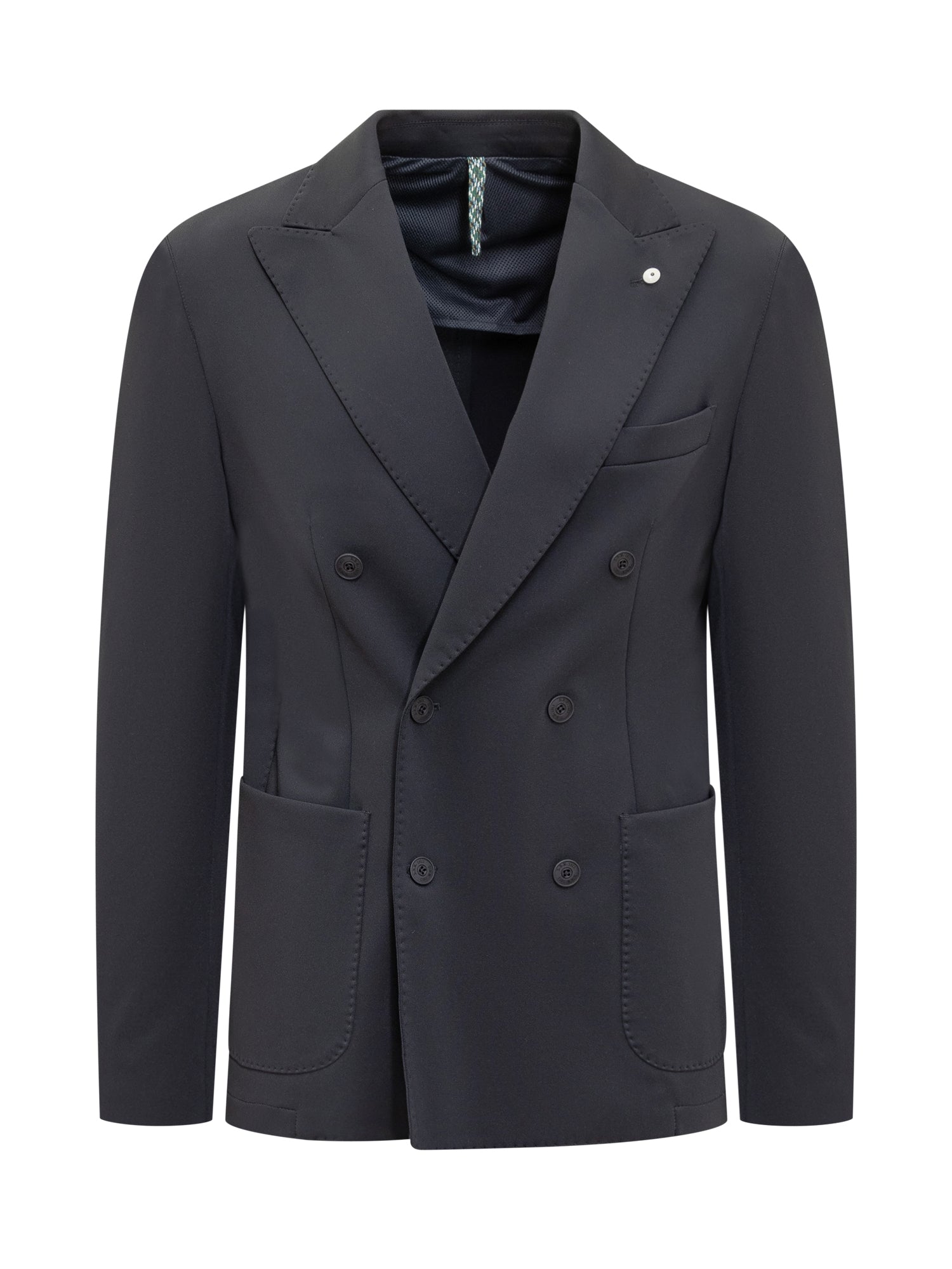 Giacca blu a maniche lunghe. Chiusura frontale con bottoni. Doppiopetto. Tasche frontali. Taschino sul petto. Bottoni ai polsi. Due tasche interne.