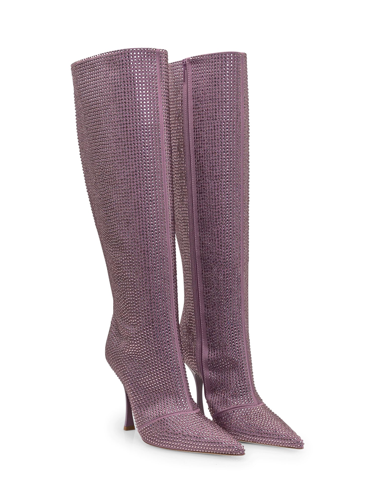 Stivali alti viola con tacco. Chiusura con zip sul lato. Strass all-over.