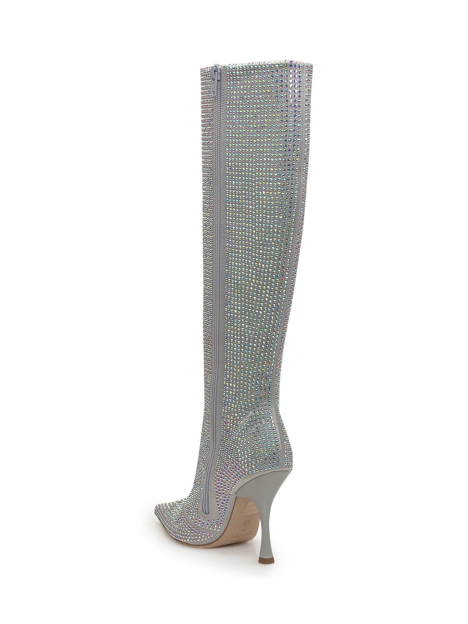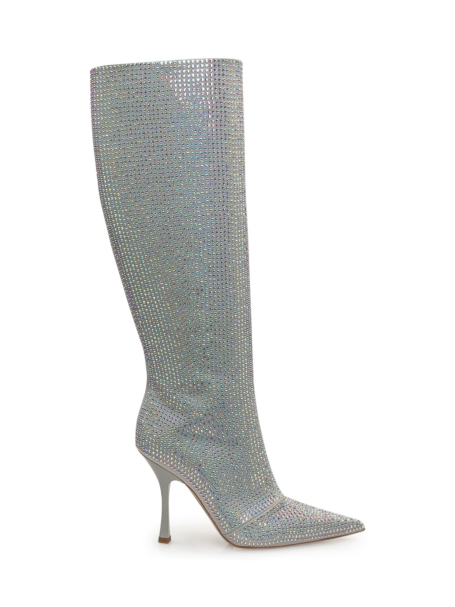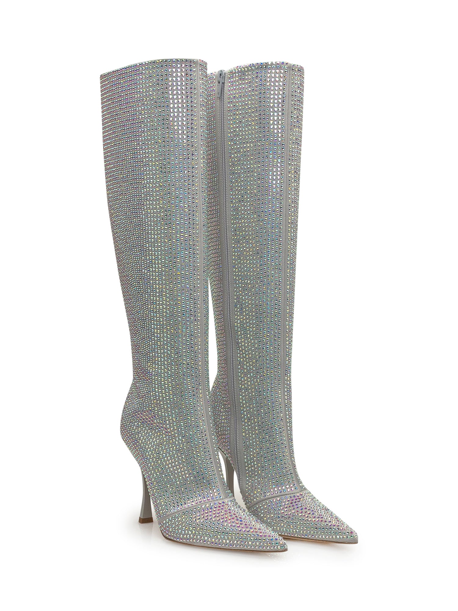 Stivale alto a punta con tacco. Glitter all-over. Chiusura laterale con cerniera.