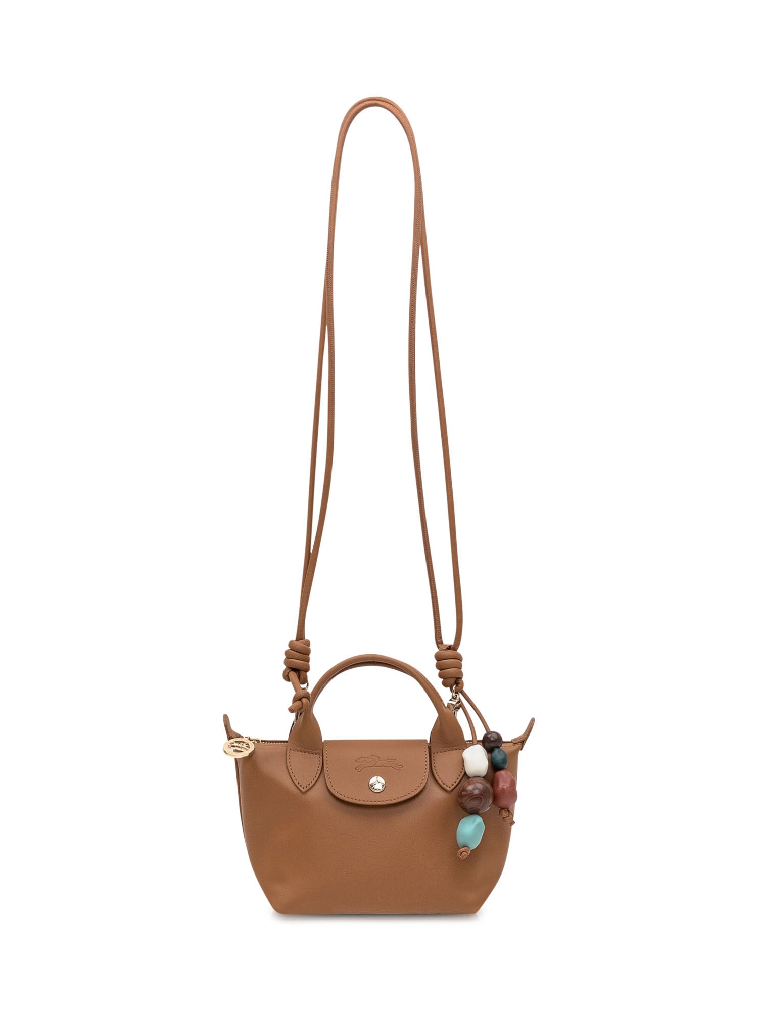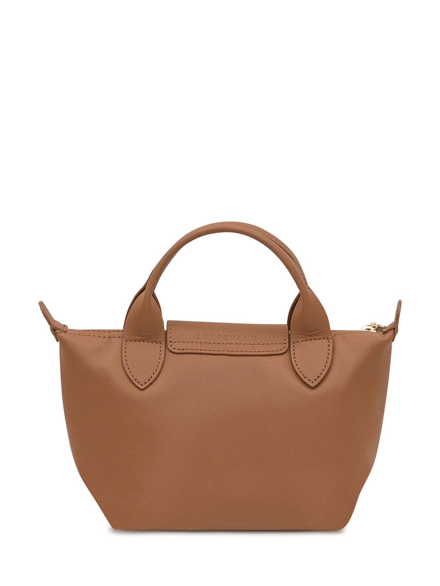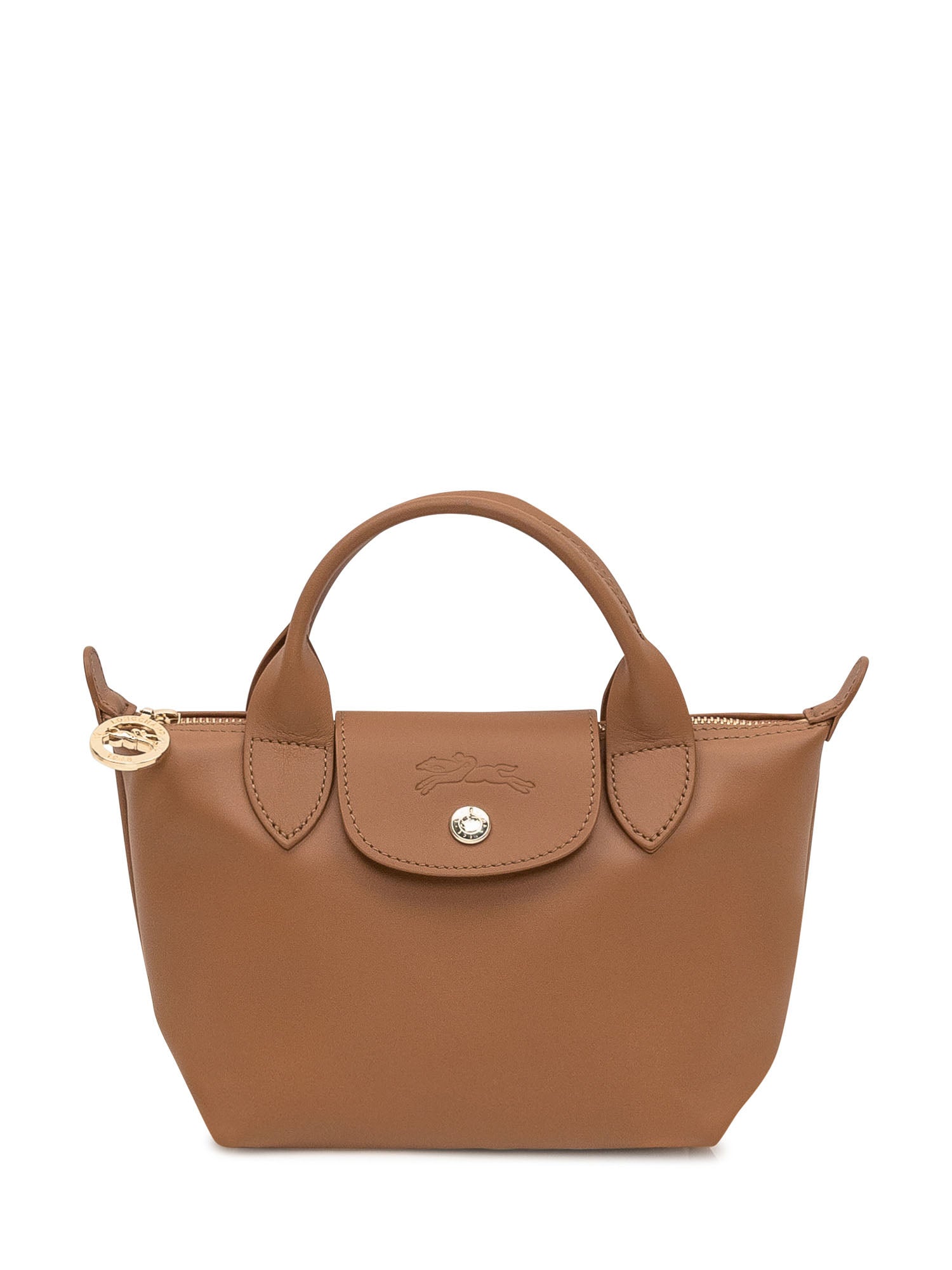 Borsa piccola in pelle marrone. Manico singolo. Chiusura con bottone a pressione e zip. Tracolla removibile e regolabile.