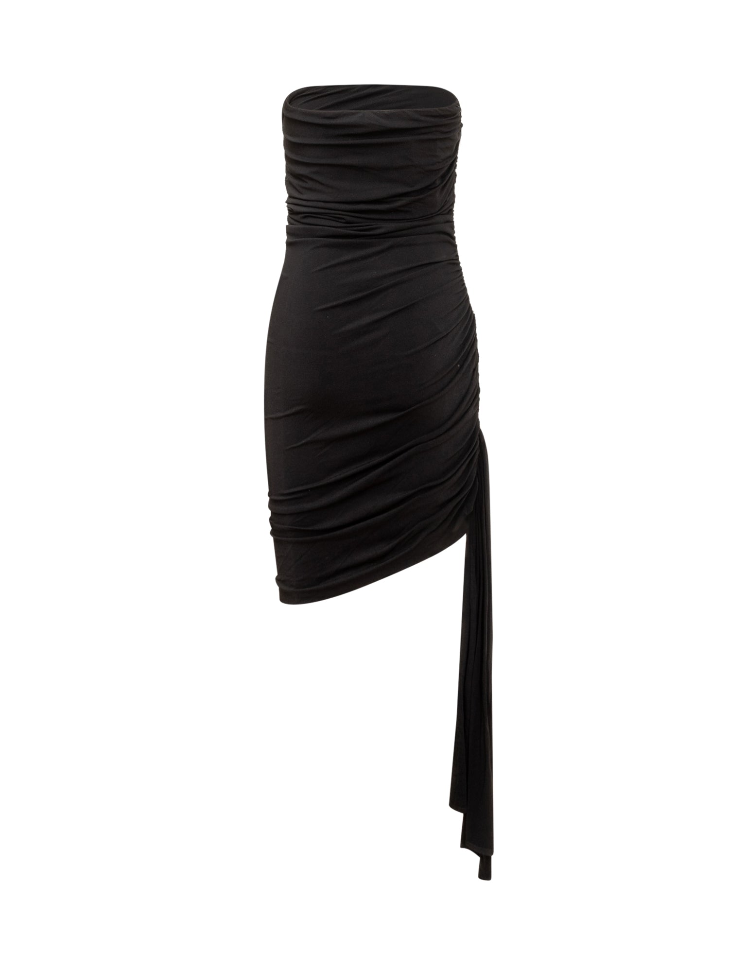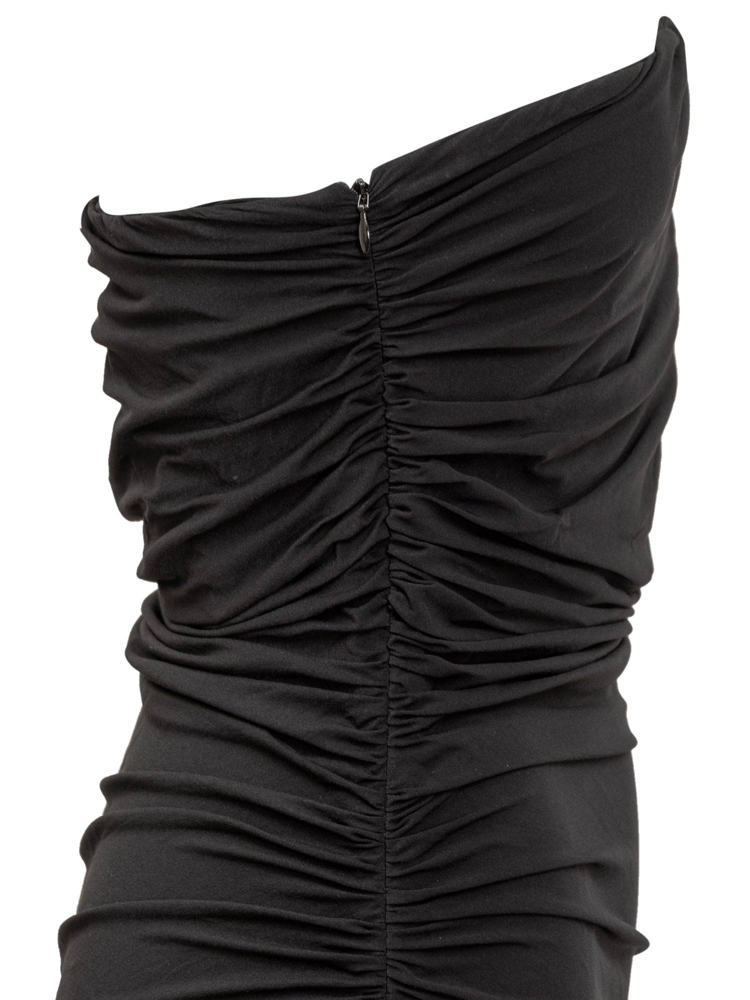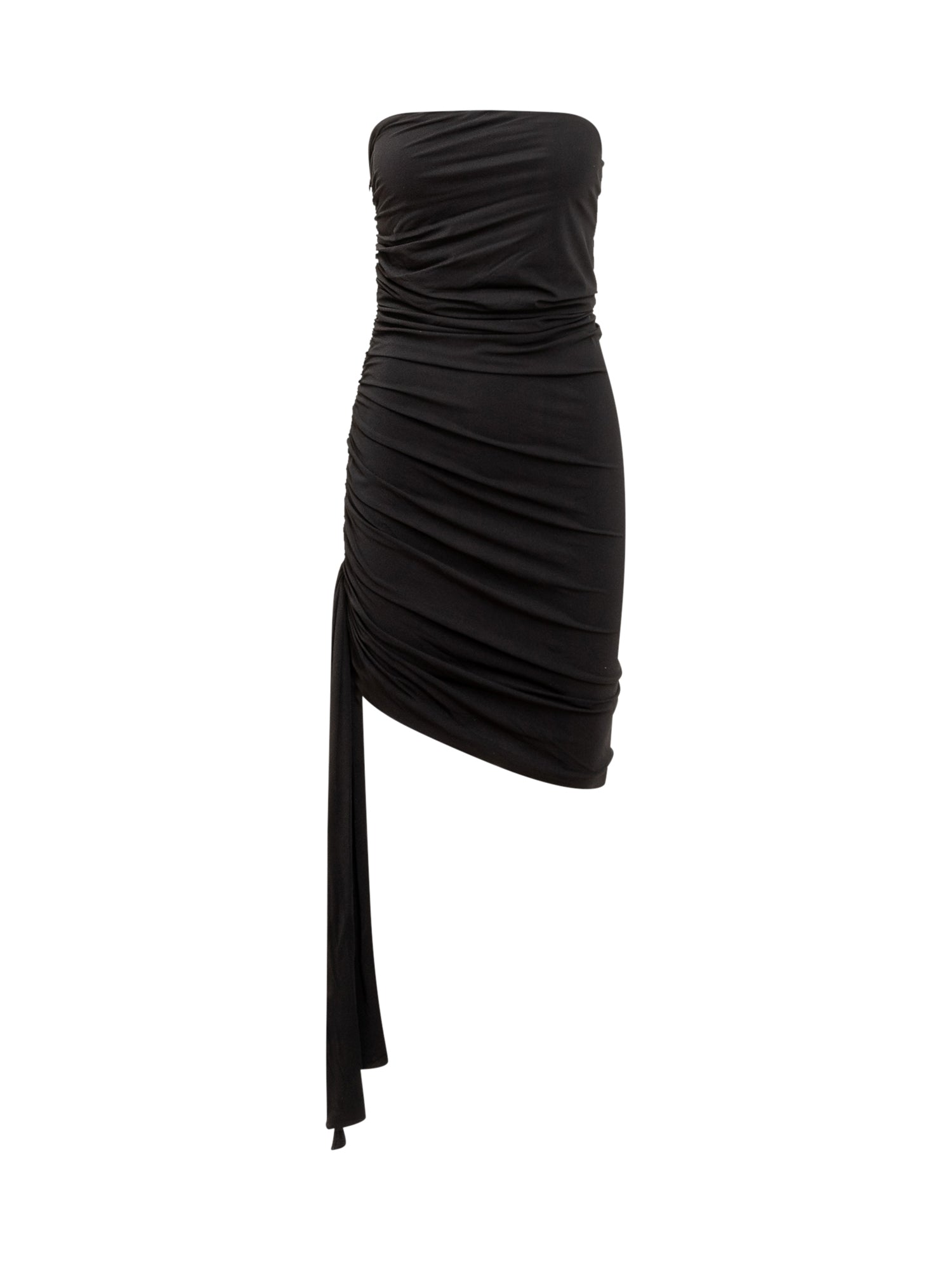Miniabito nero senza spalline in jersey. Chiusura con zip laterale. Scollo dritto. Effetto arricciato con fusciacca.