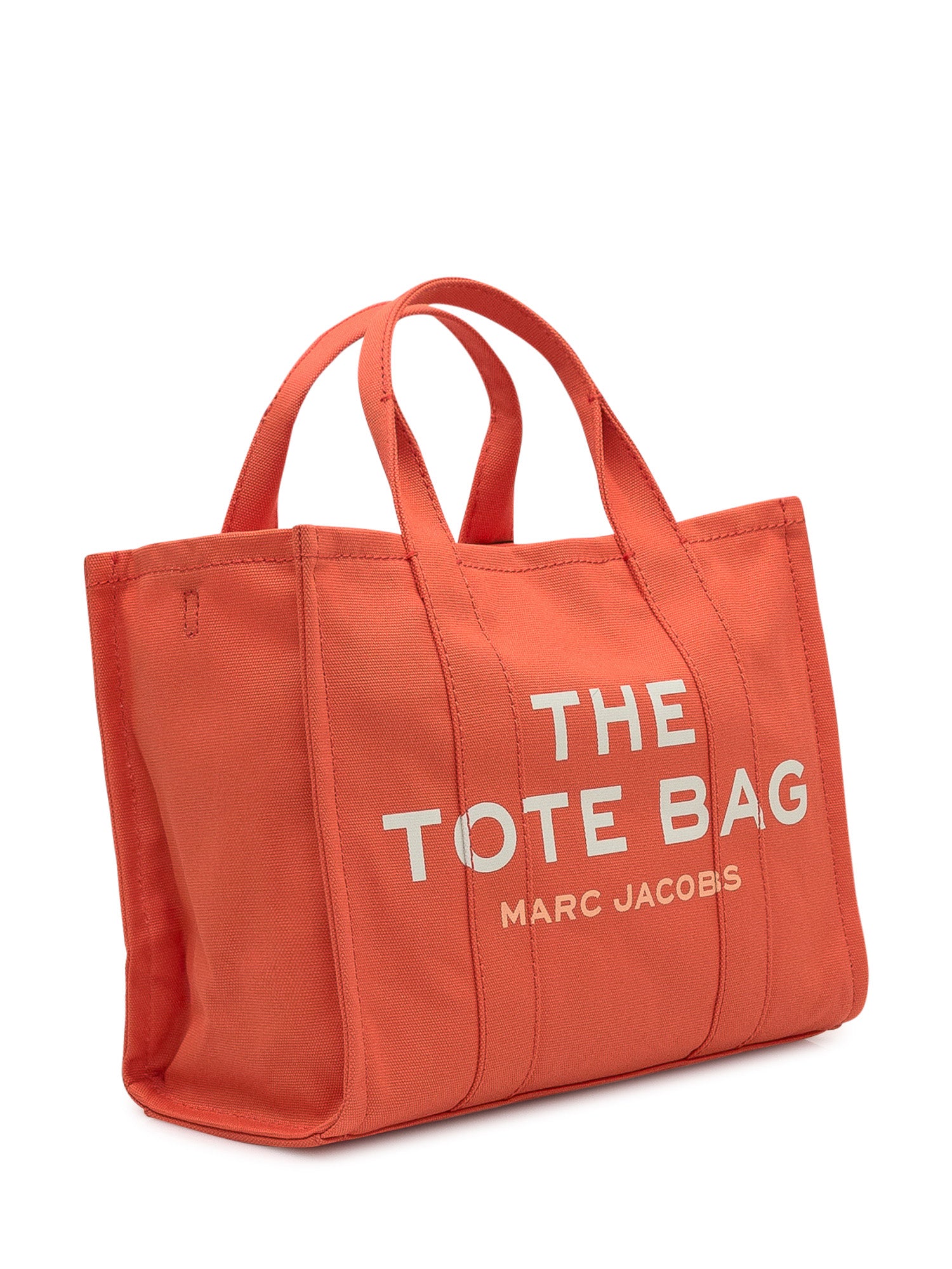 The Tote Bag Marc Jacobs in tela arancione con logo frontale stampato.