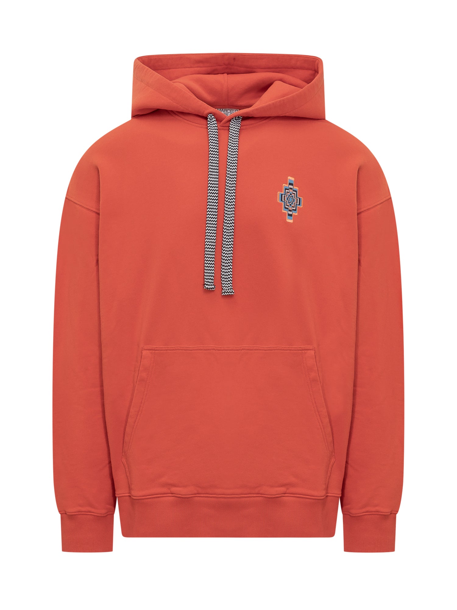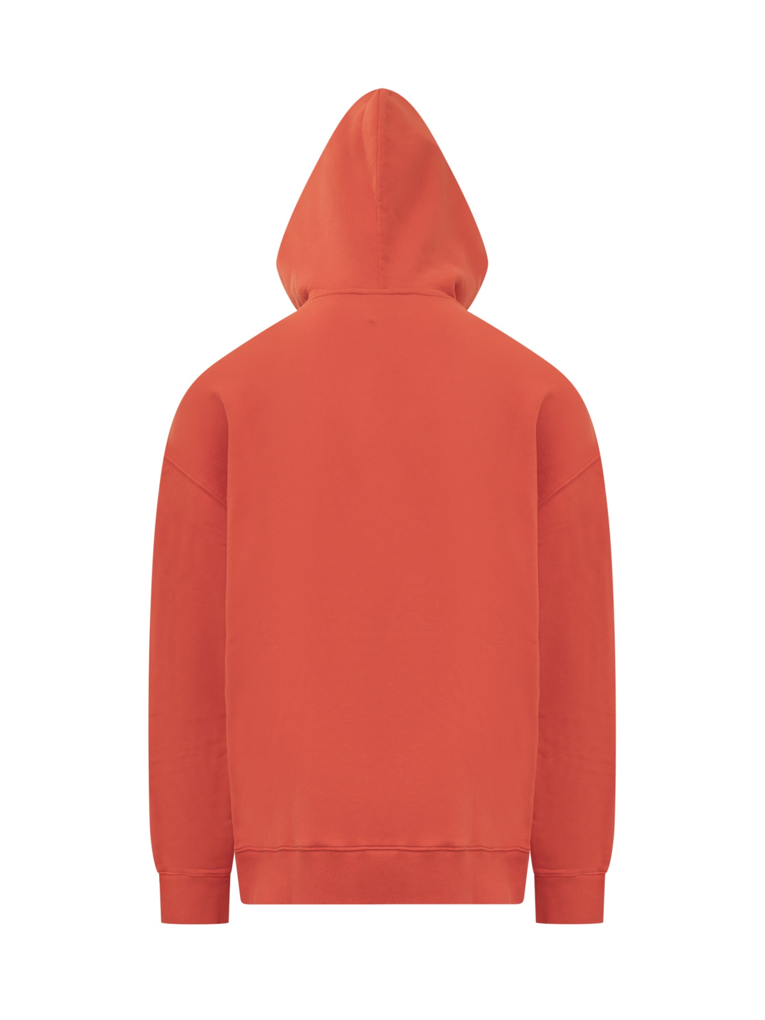 Felpa rossa a maniche lunghe. Cappuccio con coulisse. Tasca frontale. Logo sul petto. Polsi e fondo a costine.