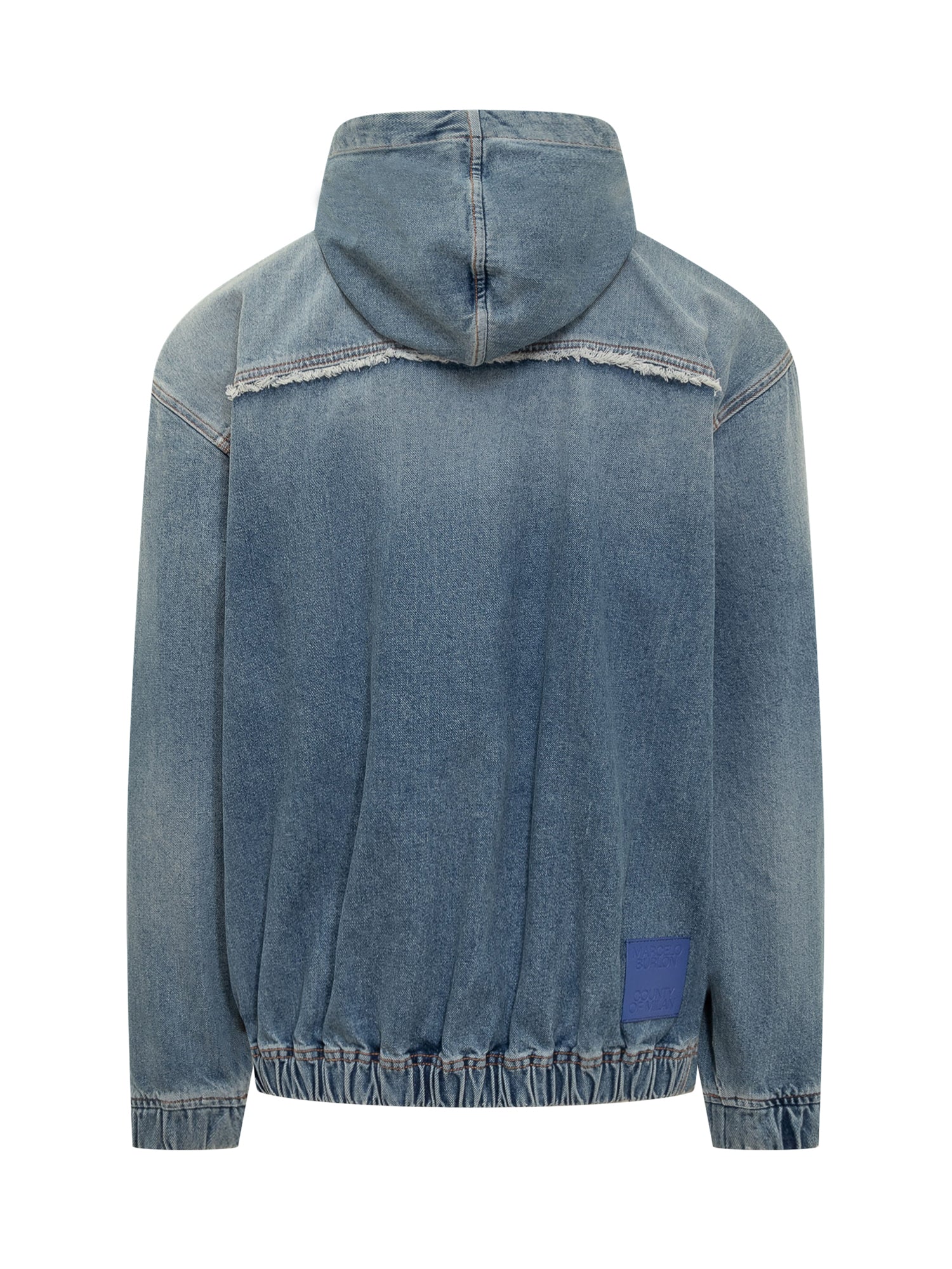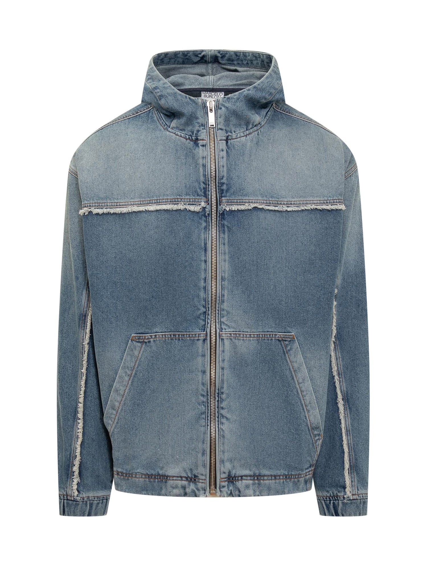 Giubbino a maniche lunghe in misto cotone. Cappuccio e collo alto. Chiusura con zip. Orli elasticizzati. Due tasche sul davanti. Cuciture con frange. Logo patch sul retro.